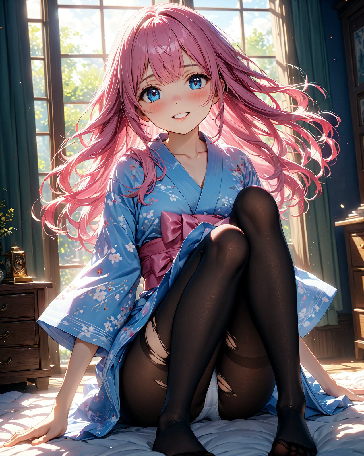 extremely cute and beautiful girl, solo, 1 girl, no other people, symmetrical body, detailed face, beautiful detailed eyes, pink long hair, blue eyes, beautiful detailed lips, cinematic lighting, (dramatic lighting:1.2), illustration, cinematic atmosphere, day`s light, highly detailed, ultra-detailed, (best quality, 4k, 8k, highres, masterpiece:1.2), ultra-detailed, fluffy smile, (dynamic luster, highly luster), (margin:1.2), bedroom, Yukata, black pantyhose, sitting, white panties covered black pantyhose, toes covered black pantyhose, Torn tights:1.2, Ripped Tights, A yukata that's about to be taken off, open crotch, orgasm, embarrassed eyes <lora:flat2:-0.7000000000000002> <lora:Gloss_Tweaker_V2:2.0000000000000004>