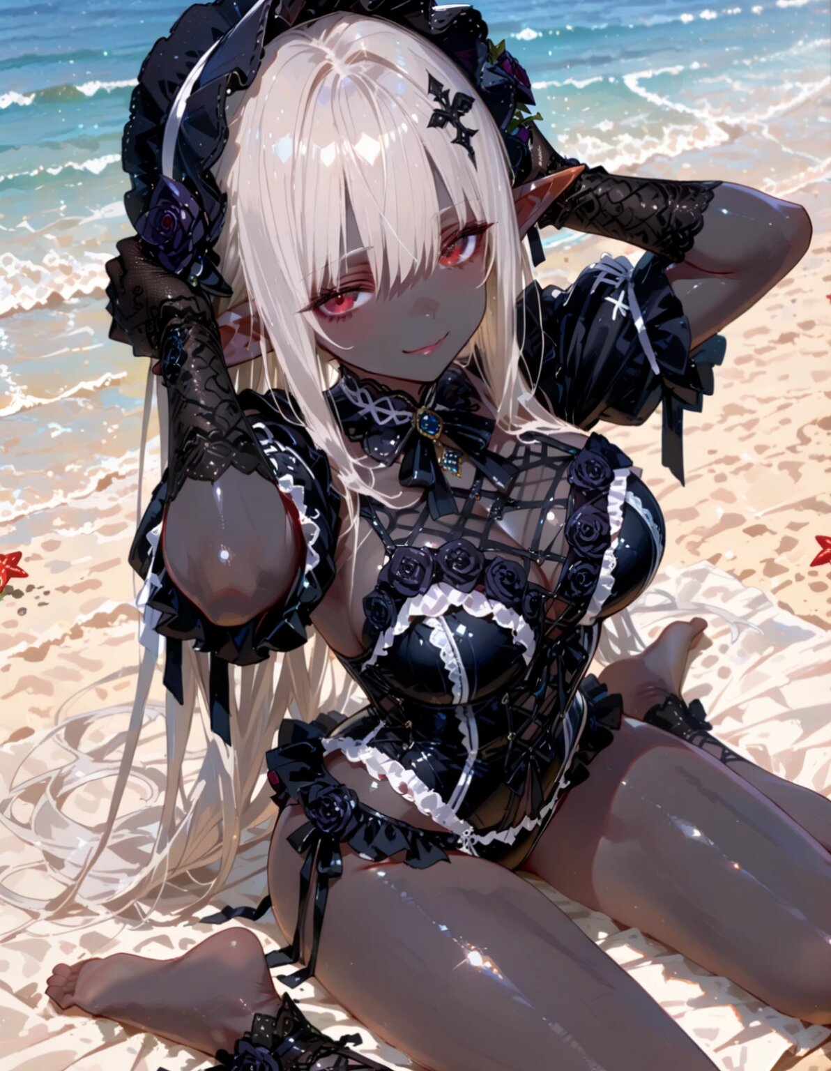 sunny beach,seaside,1girl,solo,looking at viewer,sitting on beach,wariza,(dark elf),silver hair,straight long hair,frilled black gothic bonnet,dark rose hair ornament,gentle smile,lip,(ebony skin),frilled gothic design swimwear,large breasts,black lace glove,bare foots,thigh,hands on head,((masterpiece,best quality,extremely detailed,absurdres)),