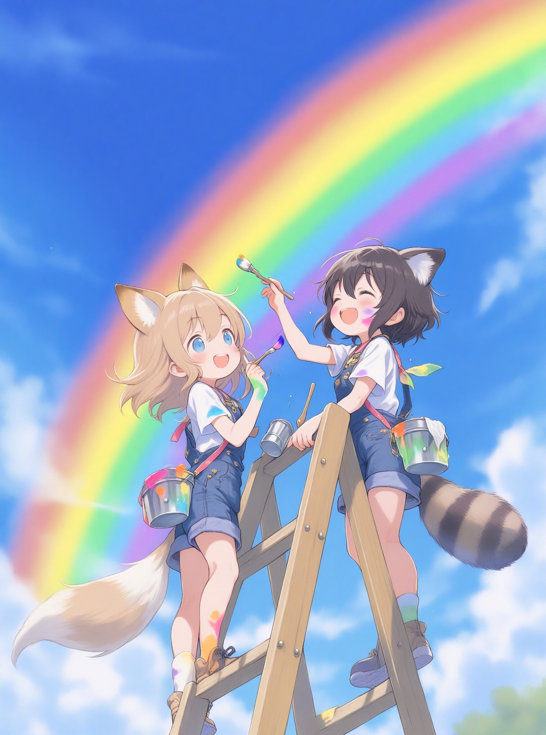 2girls, loli, general, traditional media, (colored pencil drawing), pastel colors, soft tone, (blurred boundaries, drawing lines, Paper texture), cute, deformed, ultra-detailed background, (masterpiece, best quality, amazing quality), (oyari ashito:0.1), (barasui:0.1), dynamic pose, dynamic angle, dynamic composition, looking away, from below, standing on a wooden ladder, painting a rainbow in the sky, clear blue sky, fluffy clouds, vivid rainbow, faces smudged with paint, joyful expressions, whimsical atmosphere, bright sunlight, magical summer feeling, BREAK 2girls, loli, light brown hair, medium hair, bangs, blue eyes, (light brown fox ears, Light brown fox tail with white tip, petite), white T-shirts, denim overalls, holding paint can, holding paintbrush, happy smile, BREAK 2girls, loli, dark brown hair, short hair, messy hair, bangs, green eyes, tareme, (dark brown raccoon ears, dark brown raccoon tail with striped pattern), white T-shirts, denim overalls, holding paint can, holding paintbrush, happy laughing,