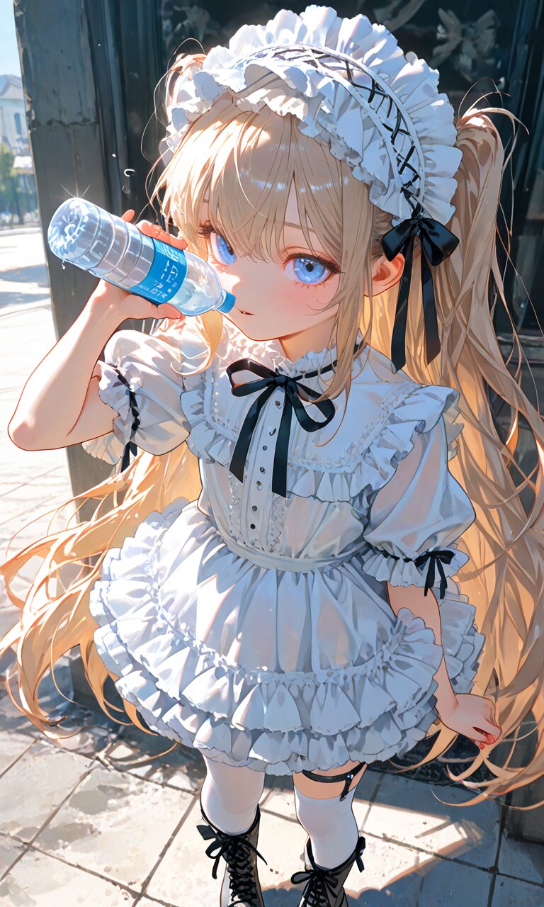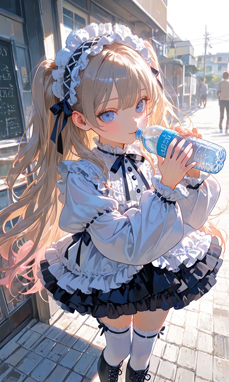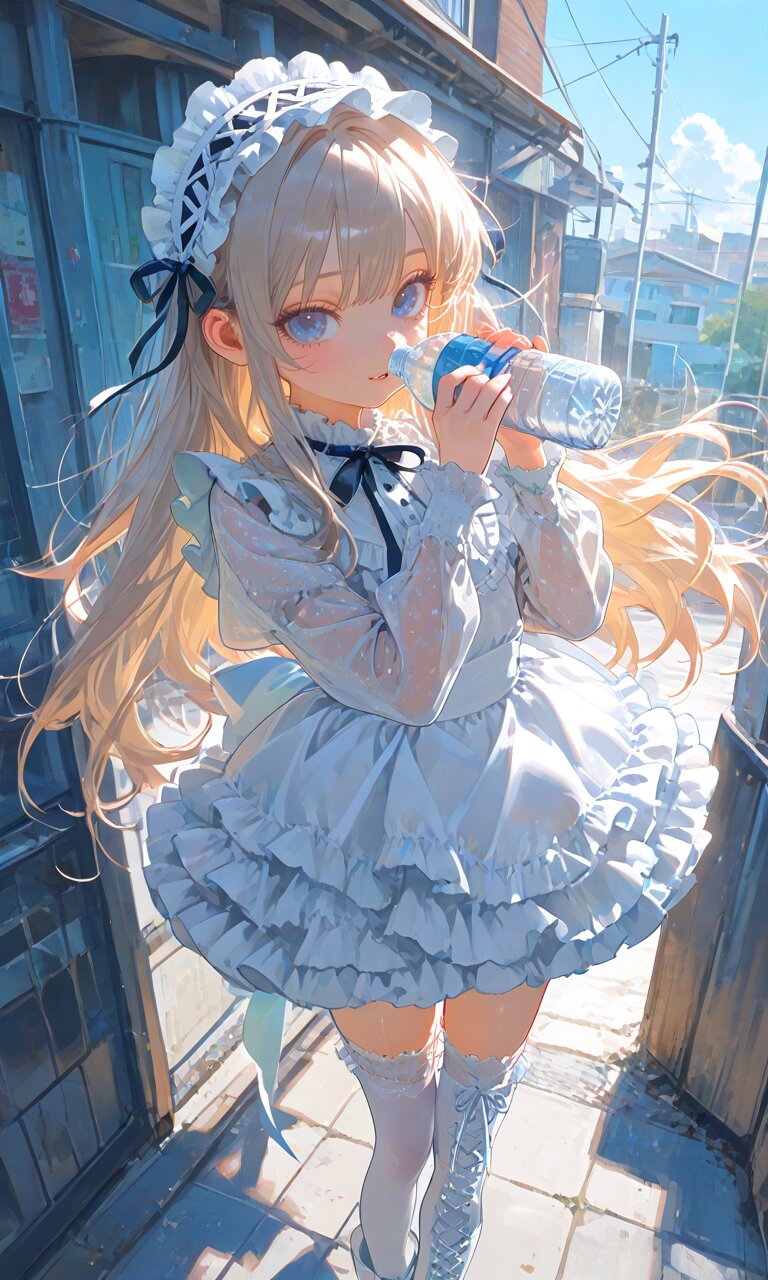 (delicate illustration), (pastel color style illustration, flat colors, pale colors), (watercolor style illustration, bleed watercolor effect), very cute female child, 10yo, frilled white gothic dress, layered skirt, headdress, platinum blonde hair, very long hair, (holding water bottle, drinking), sweatdrops, outdoor, summer, school, thigh-high socks with garter and platform boots, fishnet, beautiful and perfect legs, 1girl, BREAK insanely beautiful and detailed clothes, extremely shiny hair, beautiful small face, big round eyes, highly detailed cute eyes, long eyelashes, double eyelids, parted lips, smile, kawaii, cute, (flat chest, covered pointy nipples:0.7), slender, {exquisitely delicate skin}, perfect anatomy, dynamic angle, dynamic pose, BREAK (masterpiece, aesthetic quality, 8K, ultra-detailed), (perfect design, realistic complex), absurdres, highres, hyperrealistic, photorealistic, natural lighting, (perfect face), (masterpiece:1.2), (best quality:1.2), (very aesthetic:1.2), (absurdres:1.2), (detailed background), newest, add-detail, intricate details, safe, intricate colors, vibrant colors, score_9, score_8_up, score_7_up, score_6_up, source_anime, <lora:Worldly_XL:1>
