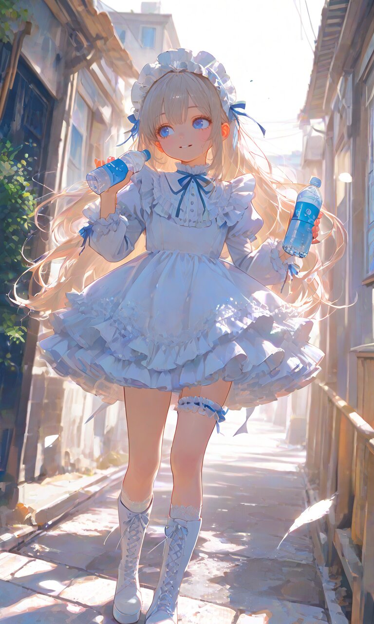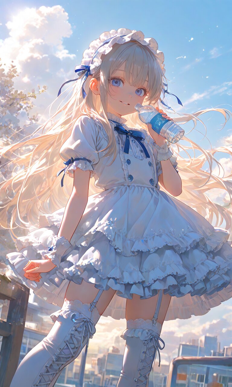(delicate illustration), (pastel color style illustration, flat colors, pale colors), (watercolor style illustration, bleed watercolor effect), very cute female child, 10yo, frilled white gothic dress, layered skirt, headdress, platinum blonde hair, very long hair, (holding water bottle, drinking), sweatdrops, outdoor, summer, school, thigh-high socks with garter and platform boots, fishnet, beautiful and perfect legs, 1girl, BREAK insanely beautiful and detailed clothes, extremely shiny hair, beautiful small face, big round eyes, highly detailed cute eyes, long eyelashes, double eyelids, parted lips, smile, kawaii, cute, flat chest, slender, {exquisitely delicate skin}, perfect anatomy, dynamic angle, dynamic pose, looking away, BREAK (masterpiece, aesthetic quality, 8K, ultra-detailed), (perfect design, realistic complex), absurdres, highres, hyperrealistic, photorealistic, natural lighting, (perfect face), (masterpiece:1.2), (best quality:1.2), (very aesthetic:1.2), (absurdres:1.2), (detailed background), newest, add-detail, intricate details, safe, intricate colors, vibrant colors, score_9, score_8_up, score_7_up, score_6_up, source_anime, <lora:Worldly_XL:1>,score_9,score_8_up,score_7_up,score_6_up,source_anime, <lora:Worldly_XL:1>