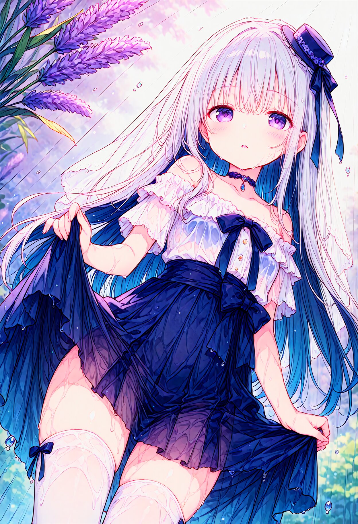 beautiful detailed background, best quality,( pale color,:0.8) scenery, detailed, intricate, backlighting, watercolor \(medium\), solo, purple theme, depth of field, blurry background, collarbone, parted lips,(Expressionless:0.8), big eyes,(half-closed eyes:0.8), tareme, pale purple eyes, thighhighs, (silver hair:1.1), (dark blue hair colored inner hair:0.8), long hair,very long hair, eyebrows visible through hair, (white off-shoulder) and (dark blue skirt,:1.2) see-through veil, mini hat, blue strapping ribbon and bow, frills, strapping ribbon, choker, temptation, see-through, water drop, (lavender :1.2),lavender field, outdoors, rain, wet clothes,wet hair, zoom layer, from below, bokeh, <lora:noline-16oa:-0.8> <lora:sdxl-shadow_01:-0.9> <lora:sdxl2-flat2-512b:-0.75>,