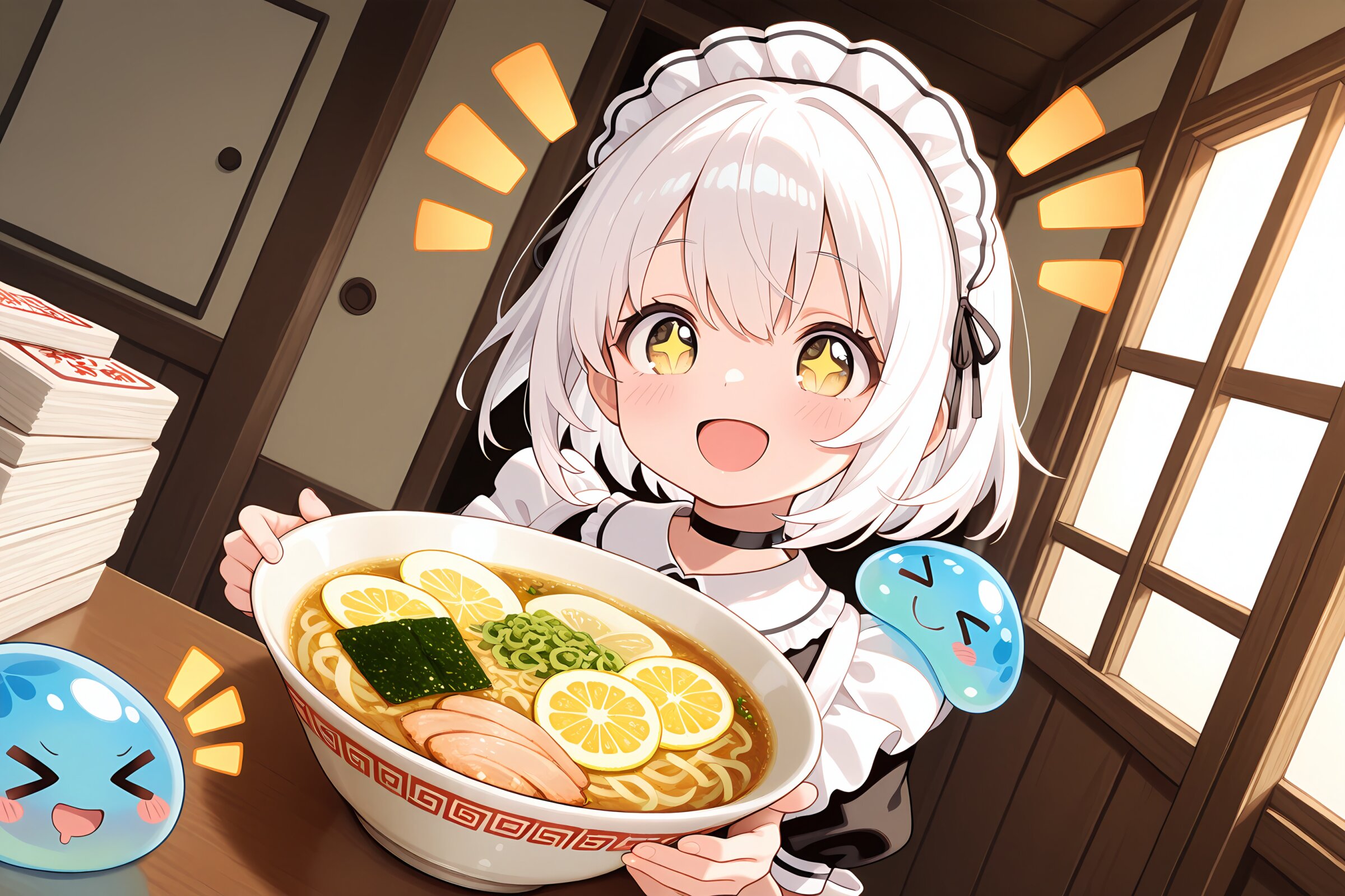 1 little girl, solo, diagonal angle, upper body, masterpiece, best quality, amazing quality, very aesthetic, white hair, short hair, yellow eyes, +_+, open mouth, smile, cheerful, +++, notice lines, choker, maid outfit, lemon on ramen, slime on her shoulder, > <, japanese room,