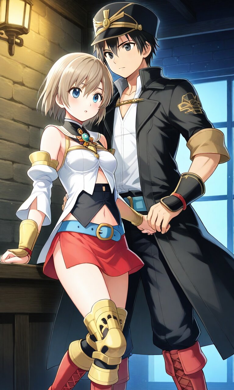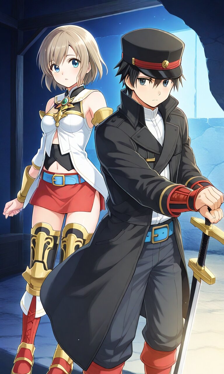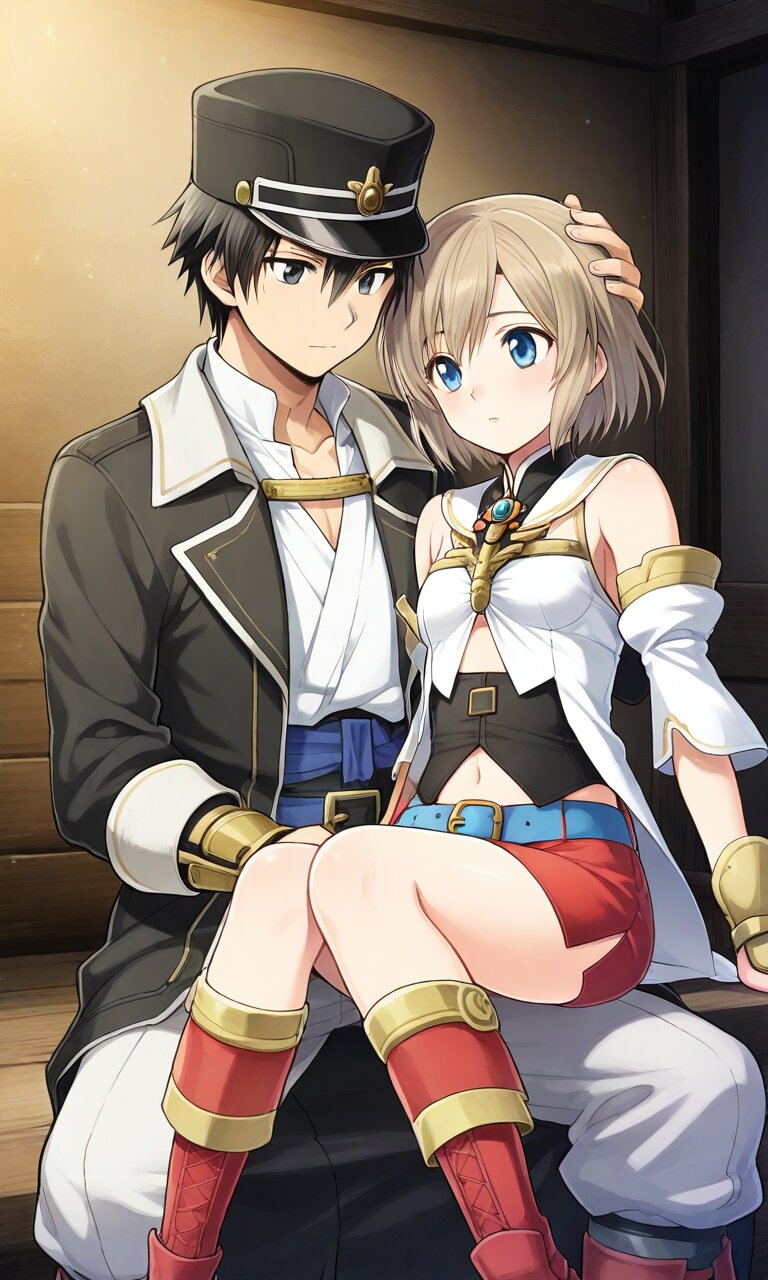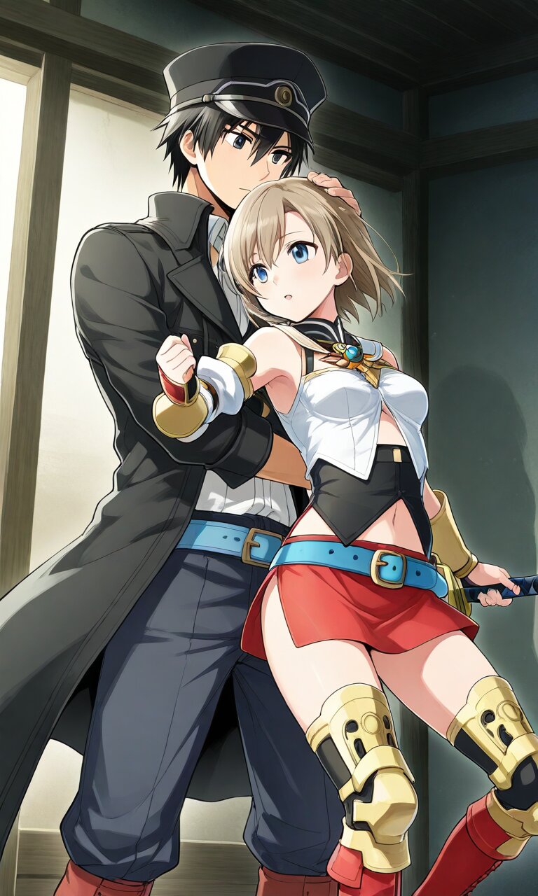 Couple, boy and girl, two people only,absurdres, ultra-detailed, master piece, high resolution, 8k, Boy, girl, couple, In the middle of the night, inside an abandoned house, in the desert kingdom. BREAK The boy hugs the girl and strokes her head. BREAK The girl clings to the boy and cries. BREAK the boy(original boy,black eyes, black short hair,Black long trench coat and hat, samurai sword ) BREAK the girl(ffashebd, light brown hair, short hair, blue eyes, brooch, white collar, white shirt, sleeveless shirt, black underbust, navel, red miniskirt, blue belt, detached sleeves, gauntlets, armored legwear, red boots ),