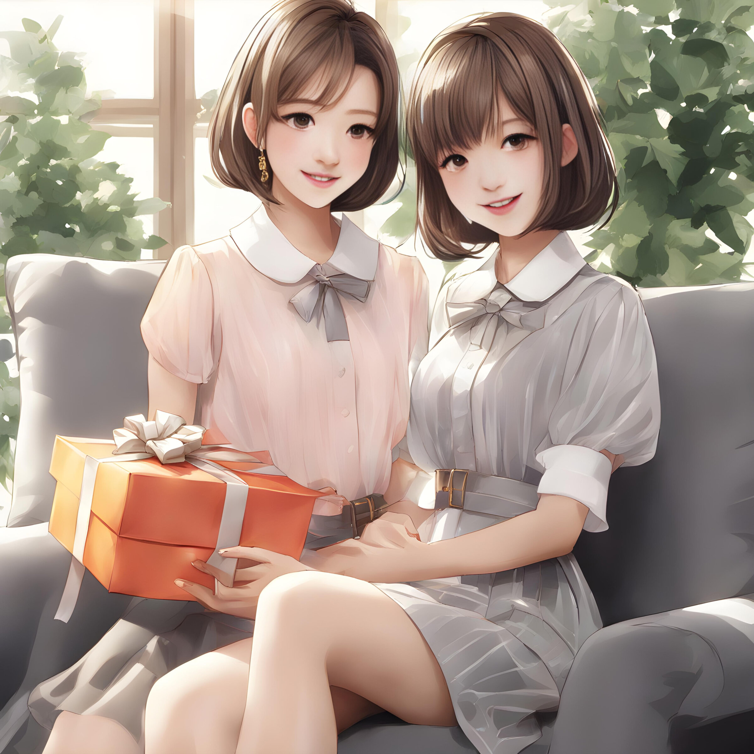 masterpiece, best quality, animation style, Line art, anime colored, illustration, look at viewer, present, 2 ladies, 20-year-old, (She has a gift:1.2), (Gift wrapping box:2.0), laugh, great gratitude, summer dress, mini skirt, beautiful legs, bob cut, brown hair, in the house