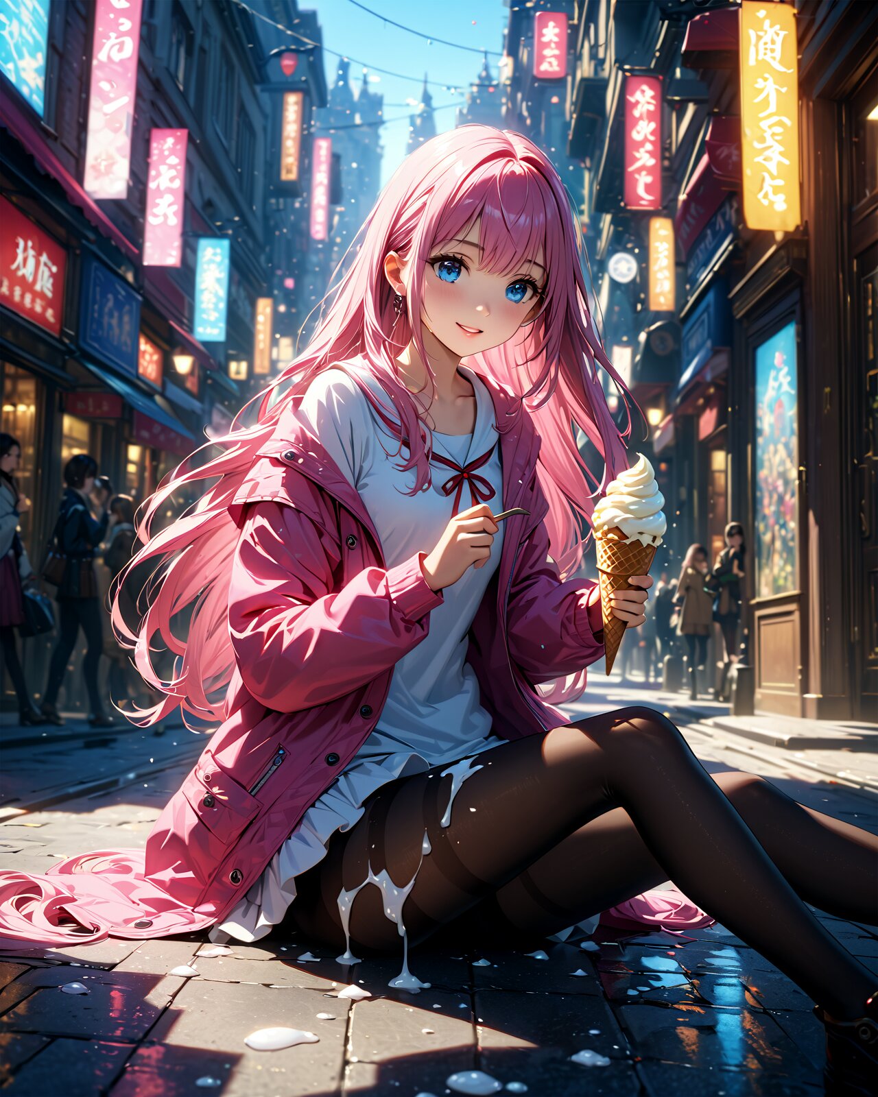extremely cute and beautiful girl, solo, 1 girl, no other people, detailed face, beautiful detailed eyes, beautiful detailed lips, cinematic lighting, (dramatic lighting:1.2), illustration, (cinematic atmosphere, highly detailed, ultra-detailed), (best quality, 4k, 8k, highres, masterpiece:1.2), ultra-detailed, (dynamic luster, highly luster), (margin:1.2), pink long hair, city street, day`s light, blue eyes, fluffy smile, beautiful detailed black pantyhose, sitting, white spill melted ice cream on tights, eating melted ice cream, drop melted ice cream on tights <lora:flat2:-0.7000000000000002> <lora:Gloss_Tweaker_V2:2.0000000000000004>