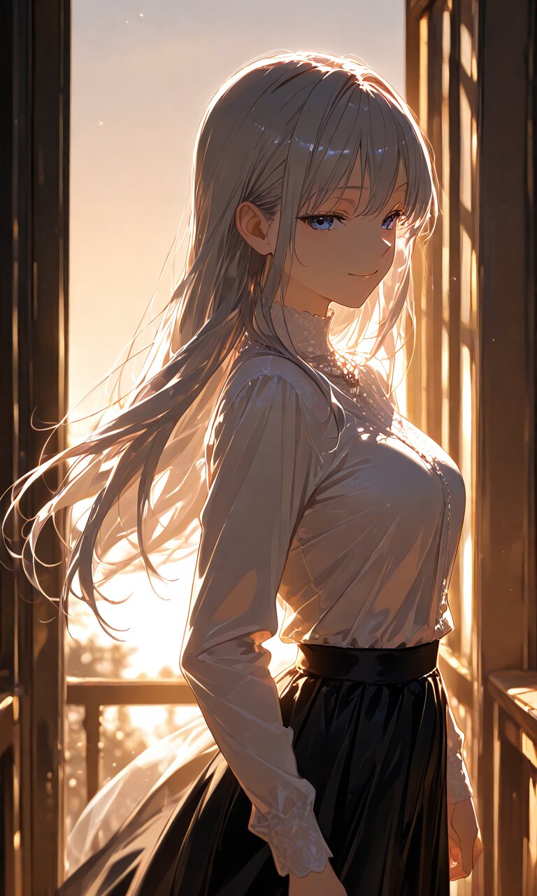 1 lady, long hair, silver hair, blue eyes, , evening, (date, waiting), long skirt, black skirt, side view, cowboy shot, seductive smile