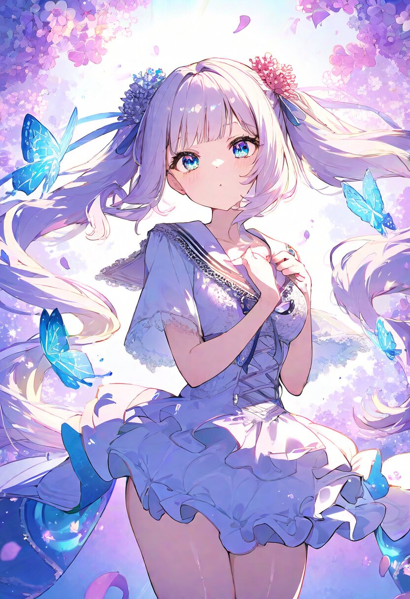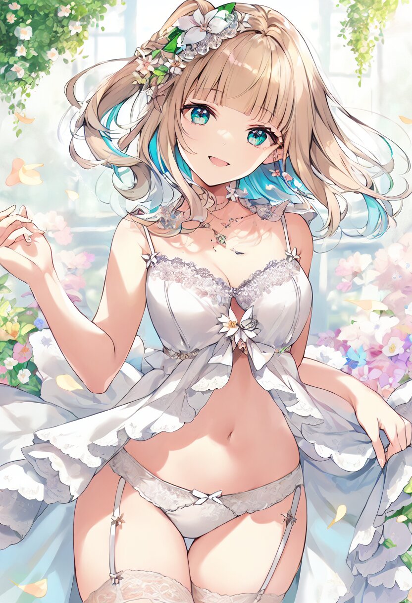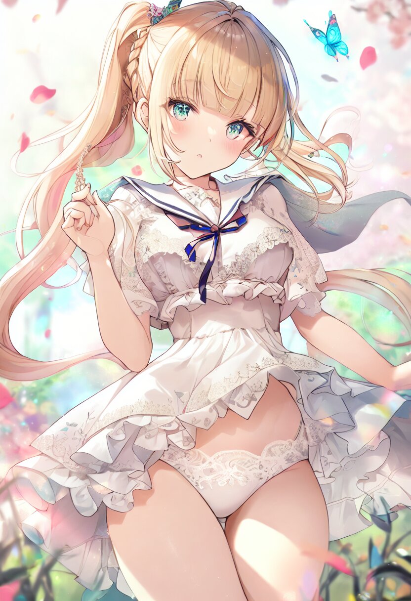 very aesthetic, best quality, absurdres, "Enchanted Garden Goddess" - Imagine a captivating AI illustration of a girl in a magical garden, wearing delicate lace lingerie adorned with ribbons and butterflies. She exudes confidence amidst floating petals and sunlight, her attire boasting frills, lace, and a sailor collar. Adorned with colorful accessories, her eyes sparkle with joy amidst blooming flowers, embodying the essence of beauty and allure... official art, {{ultra-detailed}}, {{high resolution}}, dynamic fuzziness, colorful, best quality, cowboy shot, underwear, girl ,solo, 20 years old, beautiful detailed hair, beautiful detailed eyes, blunt bangs, braid hair, twintail, side ponytail, bob, Shostakovich, hypermaximalist, super detailed, {{{{amazing quality, great quality, high quality, very aesthetic,, best quality}}}}
