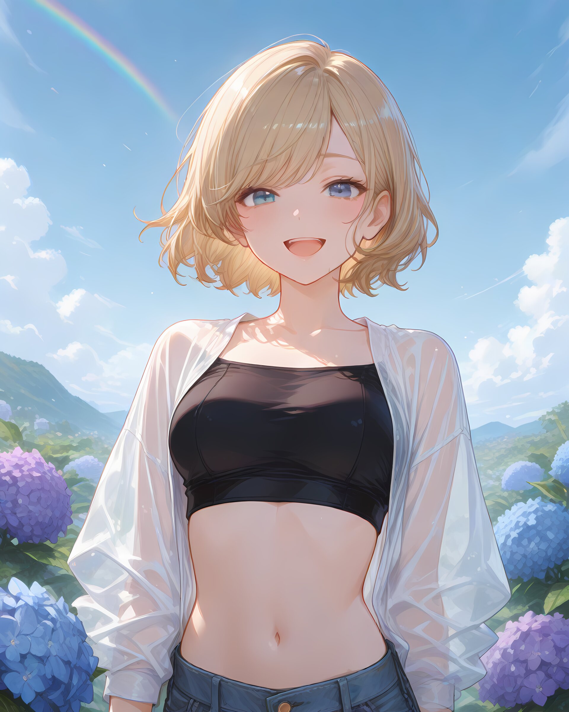 <lora:hyper_sdxl_8_step_lora_f16:1>,, 1girl, hydrangea, rainbow, sky, outdoors, focus face, close up, BREAK 18 years old, girl, short hair, wavy blonde hair, swept bangs, medium breasts, slender, frosty blue eyes, see through jacket, navel, black tube top, smile, happy, open mouth, BREAK masterpiece, amazing quality, best quality, very aesthetic, ultra-detailed, 8K,