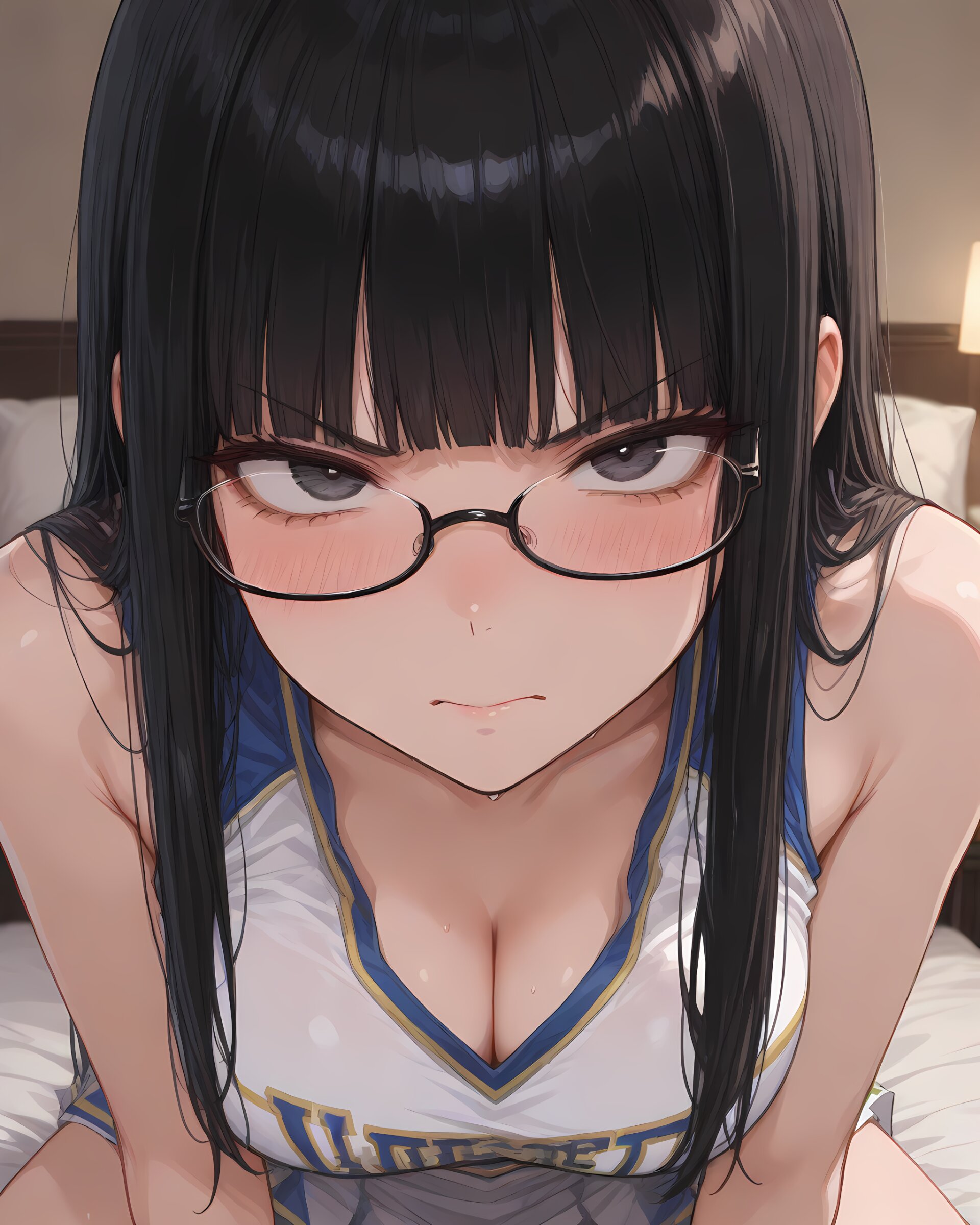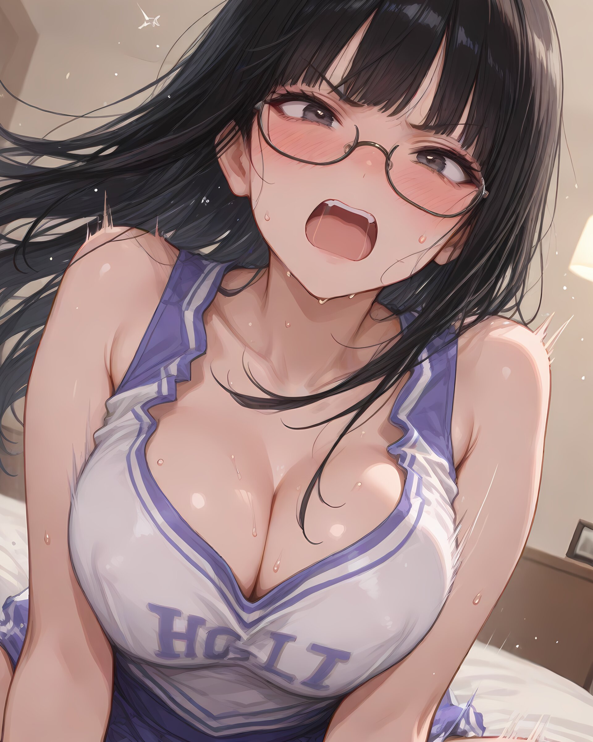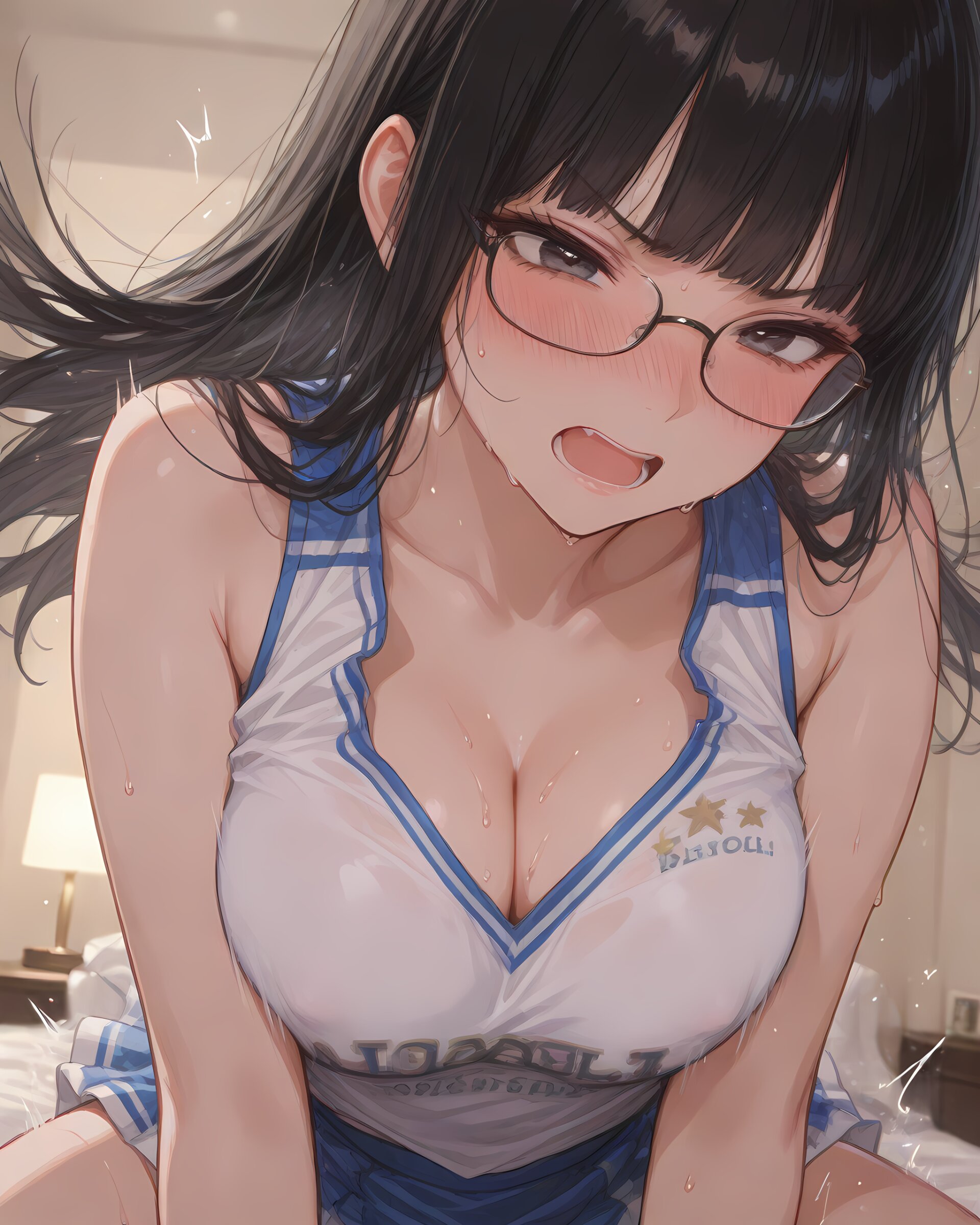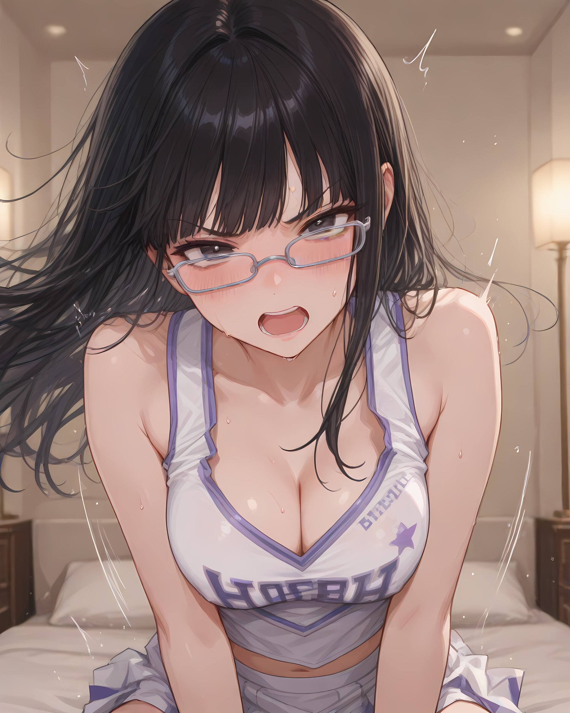 <lora:hyper_sdxl_8_step_lora_f16:1>,, 1girl, hand, hotel, bed, close up, focus face, bouncing breasts, motion line, floating hair, sparkling sweat, BREAK 18 years old, girl, long straight black hair, blunt bangs, large breasts, cleavage, nipple, cheerleader uniform, glasses, angry, blush, embarrassed, moaning, sweat, BREAK masterpiece, amazing quality, best quality, ultra-detailed, 8K, newest, Japanese,