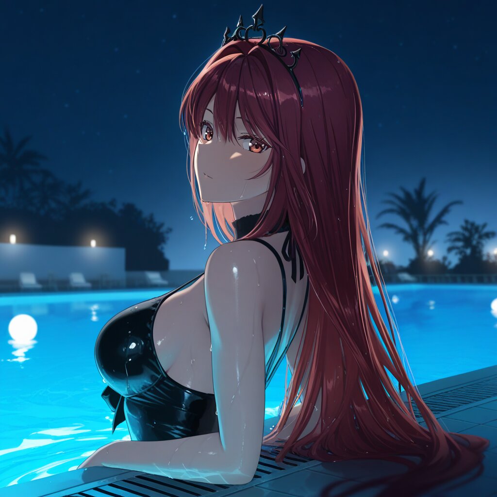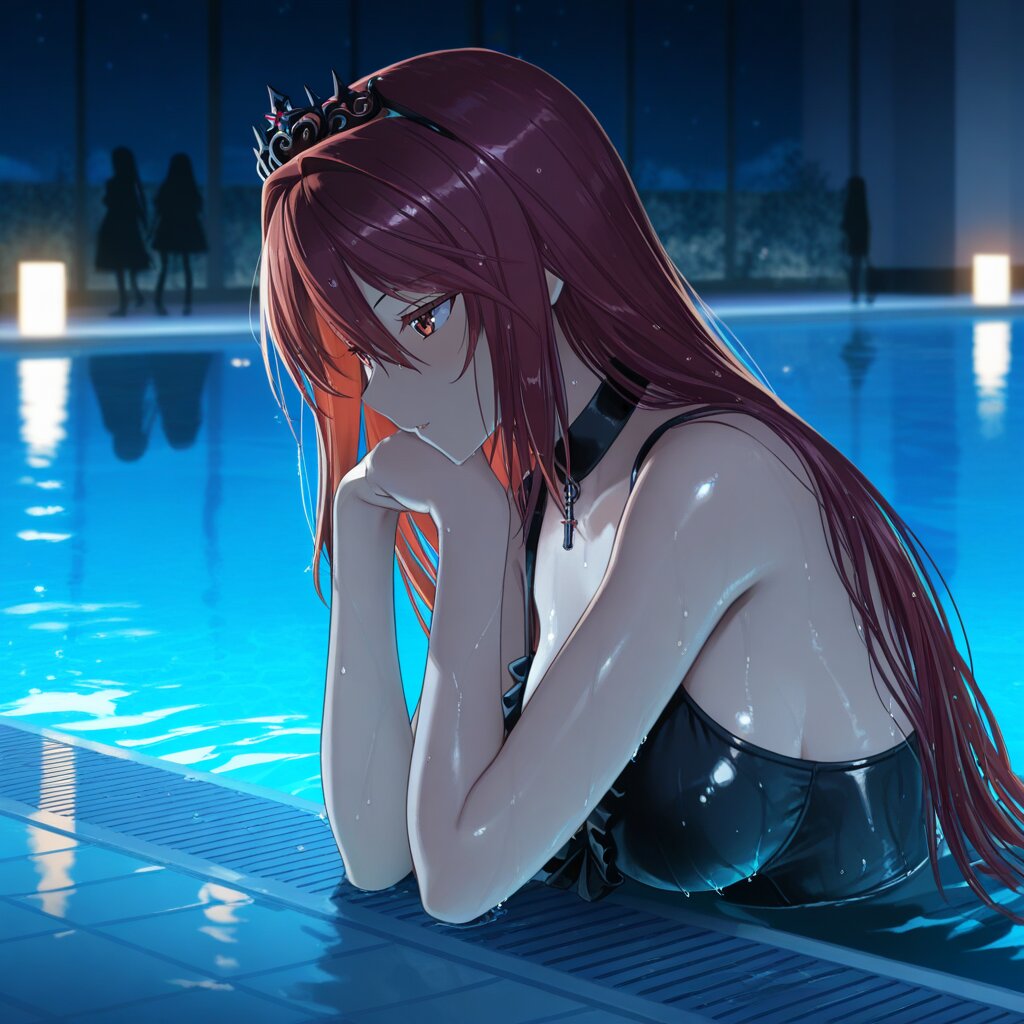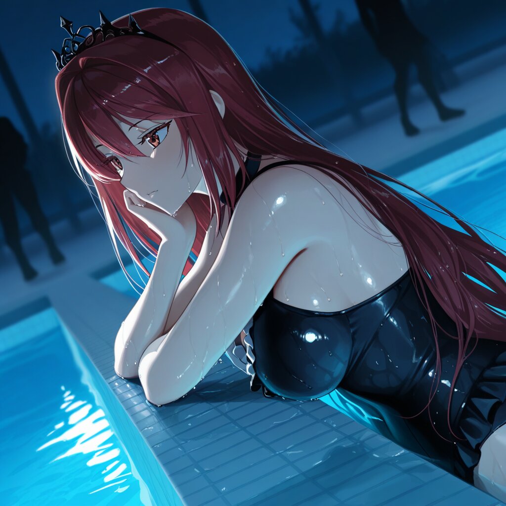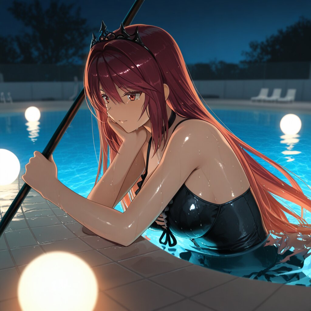 masterpiece, best quality, amazing quality, very aesthetic, high resolution, ultra-detailed, absurdres, newest, scenery, depth of field, volumetric lighting, okashirastyle,8k,extremely detailed CG unity 8k wallpaper,(perfect face:1.2),1lady,27yo,long_hair,brown_hair,red_eyes,hair_between_eyes,very_long_hair,brown_eyes,red_hair,floating_hair,hair_intakes,straight_hair,shiny_skin,medium_breasts,(gothic lolita swimsuit:1.2), (goth fashion:1.5), black tiara, magic black staff held by left hand, from side, motion lines,pool, poolside, night, midnight, water, reflections, dark, shadows, illuminated, figures, quiet, still, calm, dark blue, shimmering, wet tiles, hazy, minimal light, distant stars, silhouette, deep water, ripple, surface, serene, quiet night.