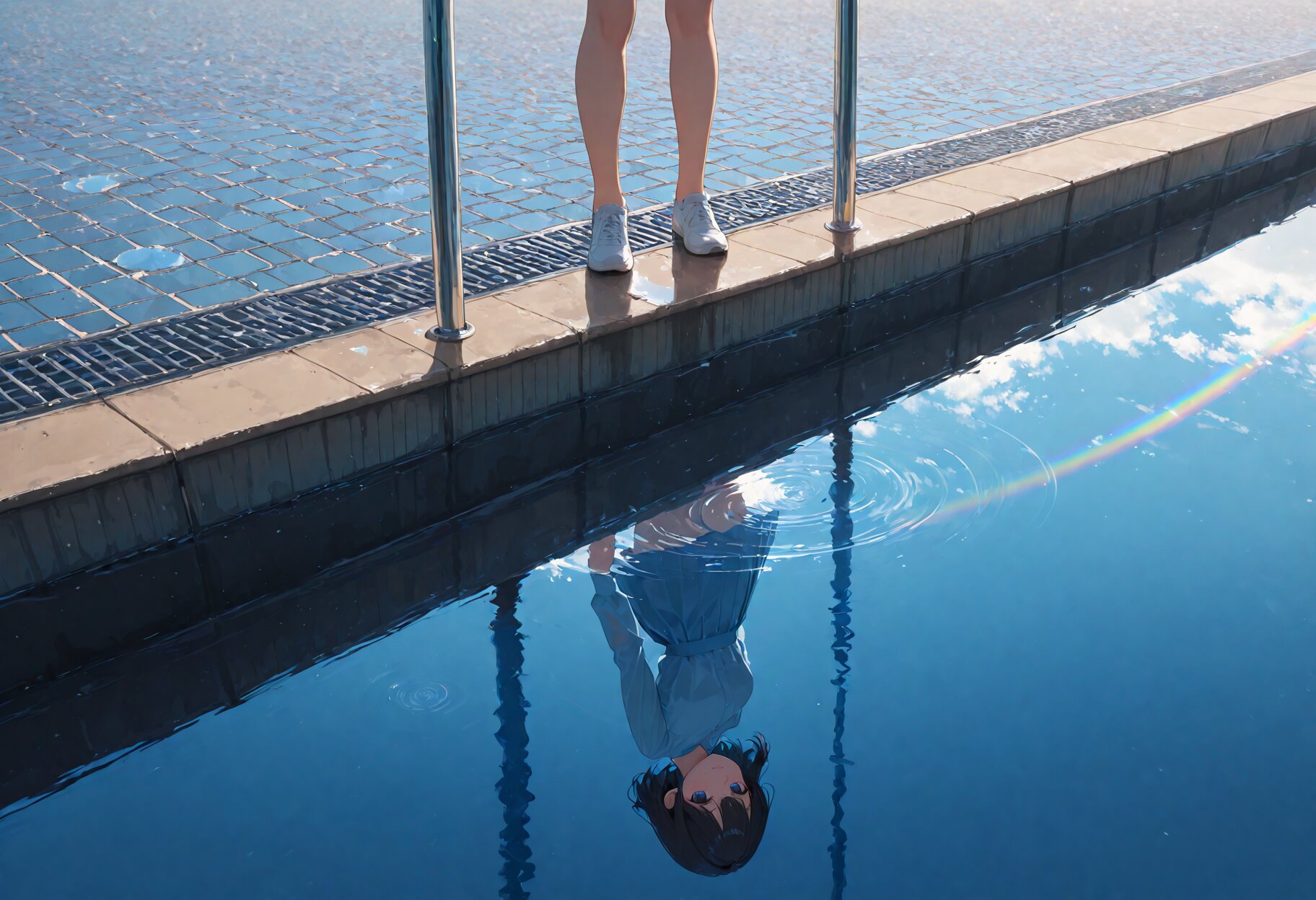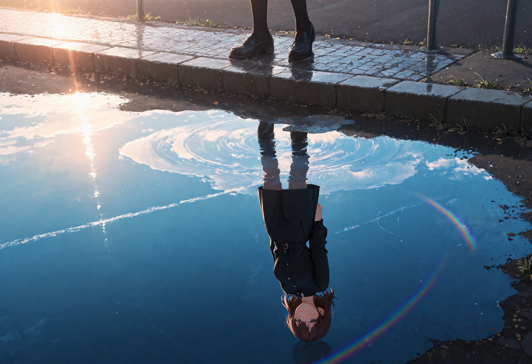 puddle on street,reflective water,[puddle, no humans:blue sky,rainbow,girl's smile:0.3],general,safe,, appropriate posture,appropriate configuration,ideal ratio body proportions,perfect anatomy, <lora:Fixhands_anime_bdsqlsz_V1:1>, masterpiece,best quality,newest,absurdres,highres,ultra high res,8K UHD,hyper-detailed,