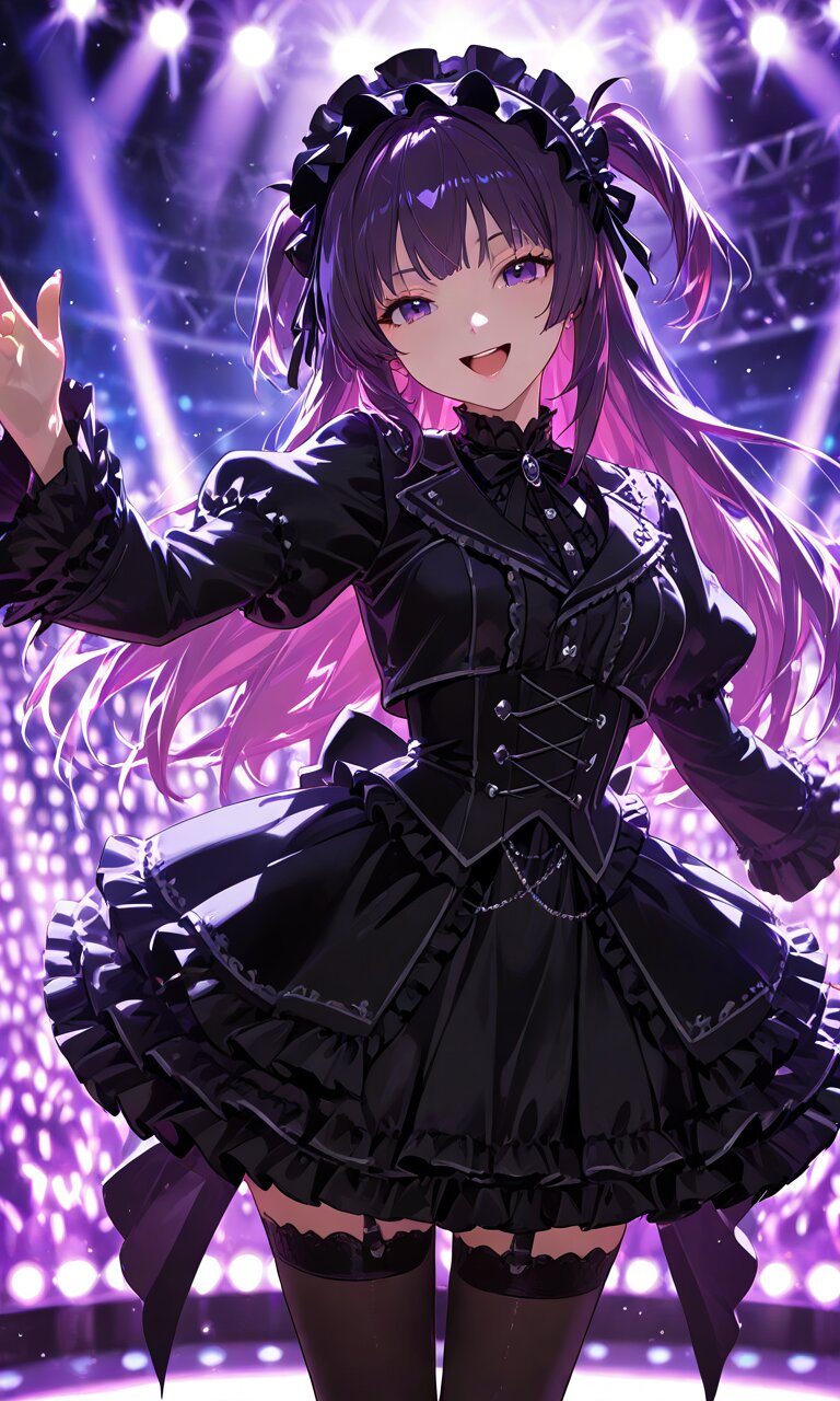 1 lady,purple hair, (cat ear, gothic lolita, on stage, idol),singing smile,cowboy shot