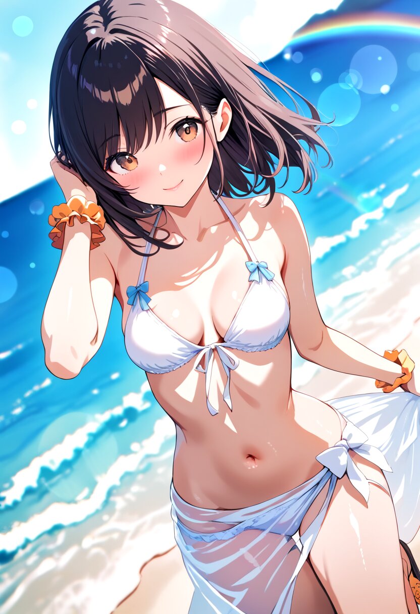 1girl, petite, cute, dark black hair, medium hair, straight hair, right diagonal bangs, hair flip, tareme:1.4, beautiful brown eyes, beautiful lips, pink lips, glossy lips, embarrassed, smile, blush, medium breasts, white bikini, front-tie top, frills, overhang, wrist scrunchie, lowleg bikini, see-through sarong, sandals, seduce, dutch angle, simple white background, rainbow, ocean, bokeh:1.4, Dreamy Blur, light particles,