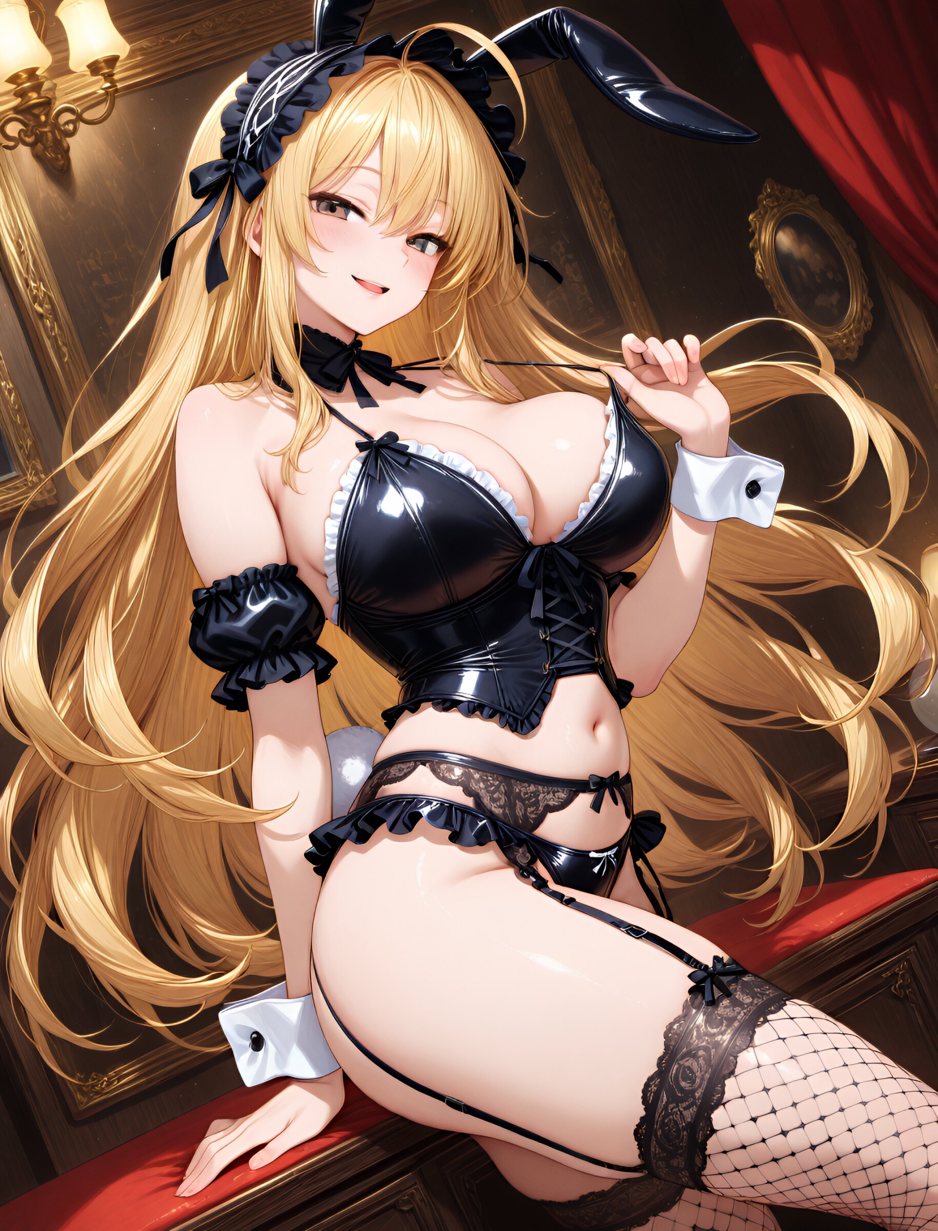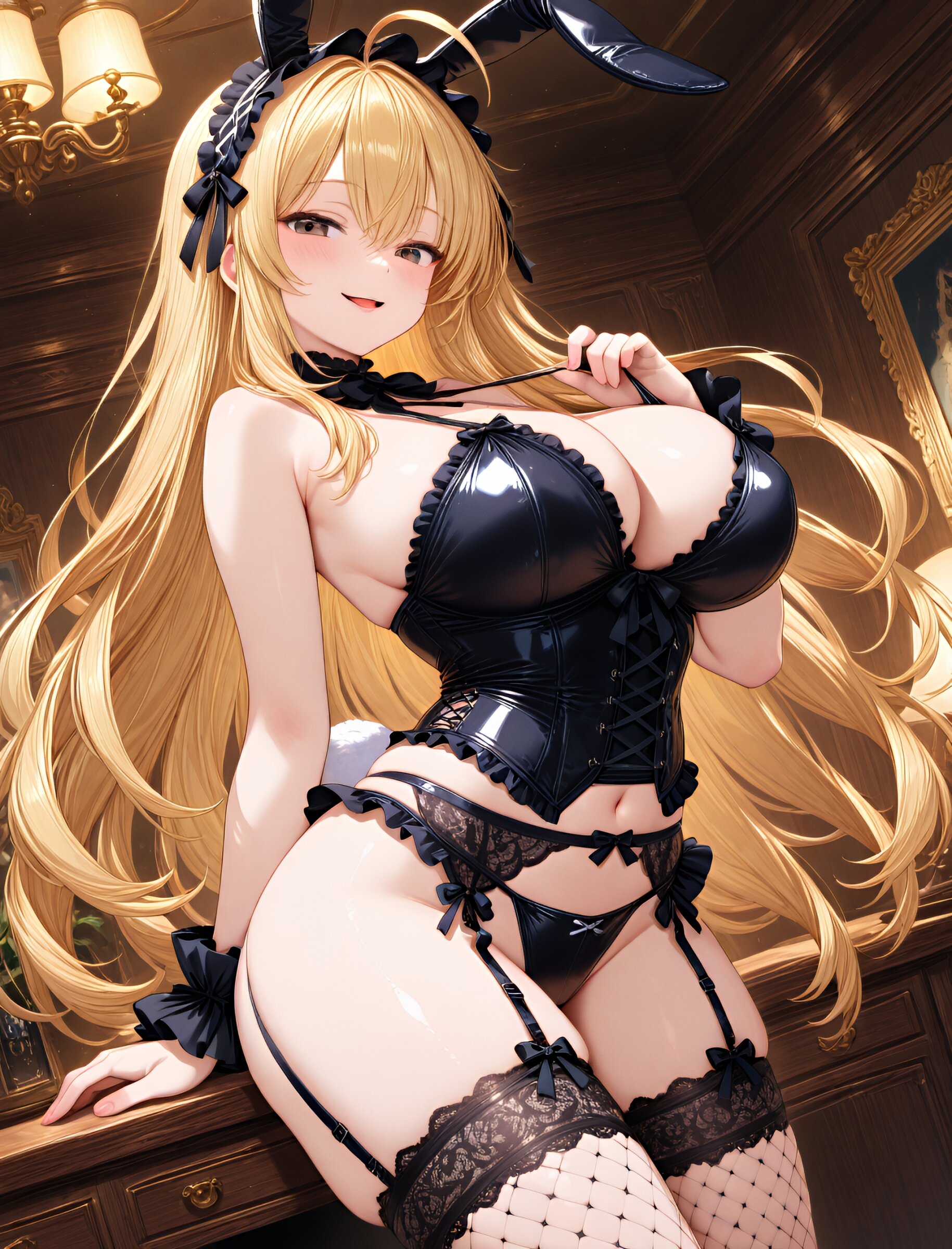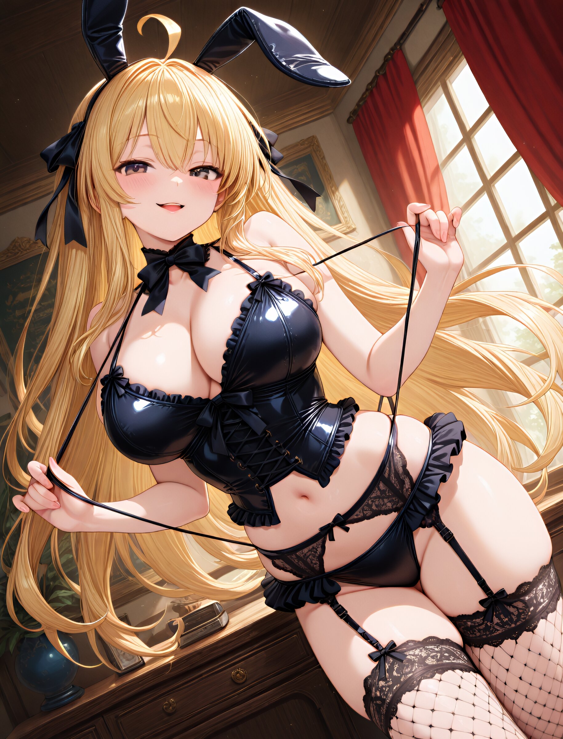 ( sling shot:1.5),,(bunny ears:1.3),(seductive smile, parted lips:1.2),(slightly open mouth),from side,(long flowing hair), (blond hair), dark copper eyes,(ahoge:1.3),(large breasts and hips), (gothic lolita swimsuit:1.5), (garter belt:1.3), (thigh-high fishnet stockings:1.7), (bustier:1.4), (frills:1.3), (lace:1.6),, (ribbons:1.3), (in livingroom), (dynamic angle),(dynamic pose:1.2), masterpiece, best quality, ultra-detailed, 8k resolution, very aesthetic, amazing quality <lora:noobai_ep11_stabilizer_v0.11_fp16:0.7> <lora:StS-Illustrious-Detail-Slider-v1.0:2.> <lora:sdxl-hairdetailer_02:2> <lora:xl_more_art-full_v1:1>
