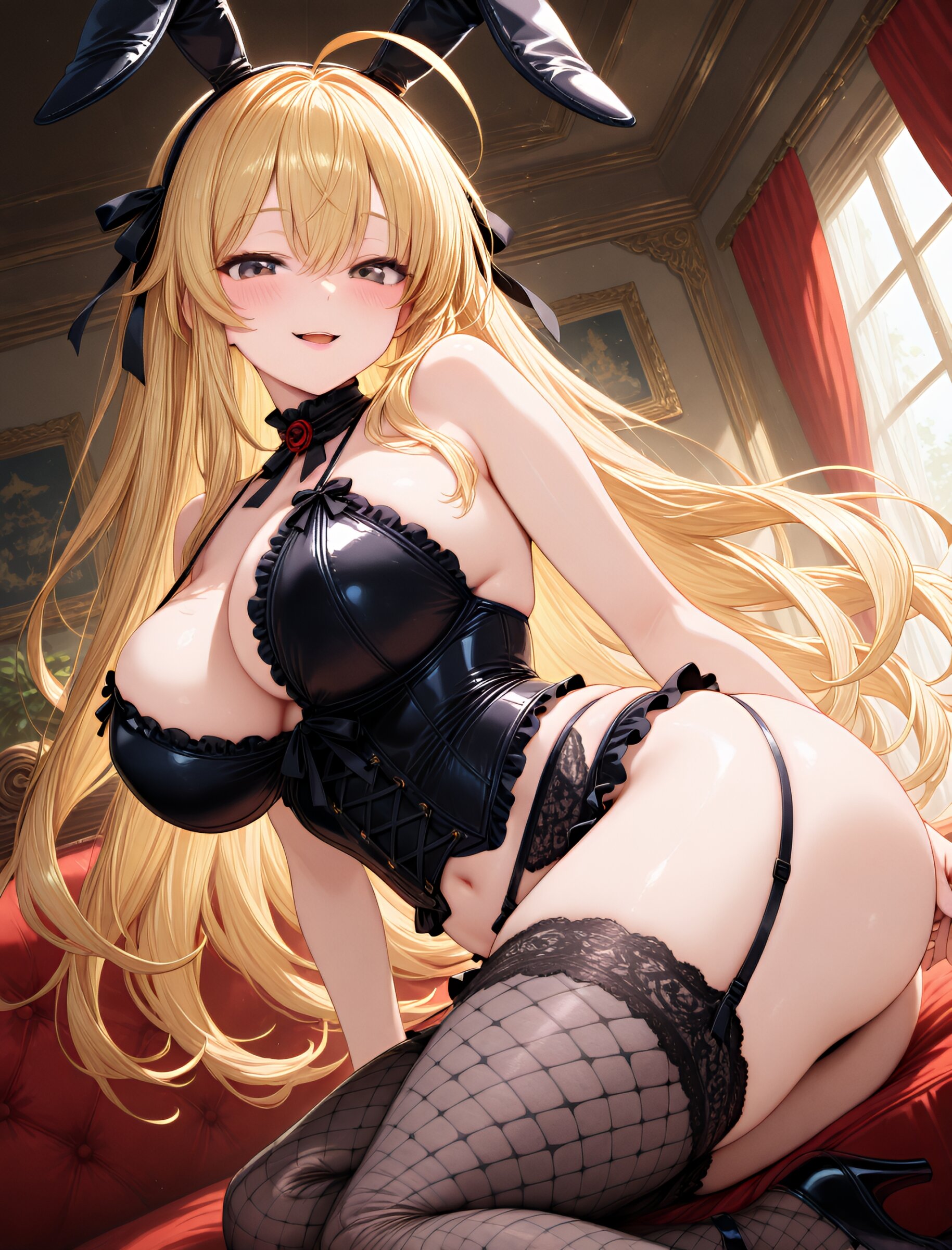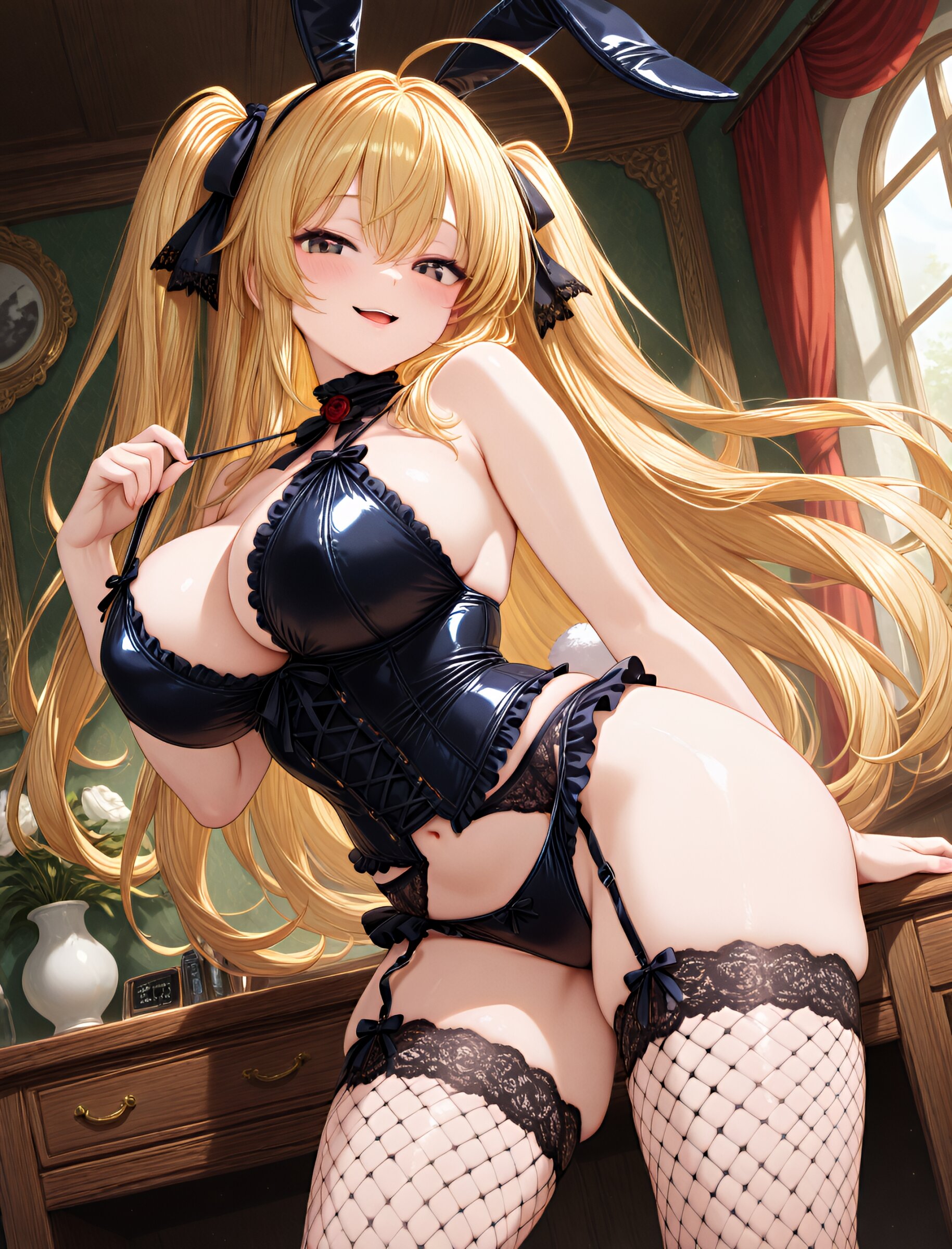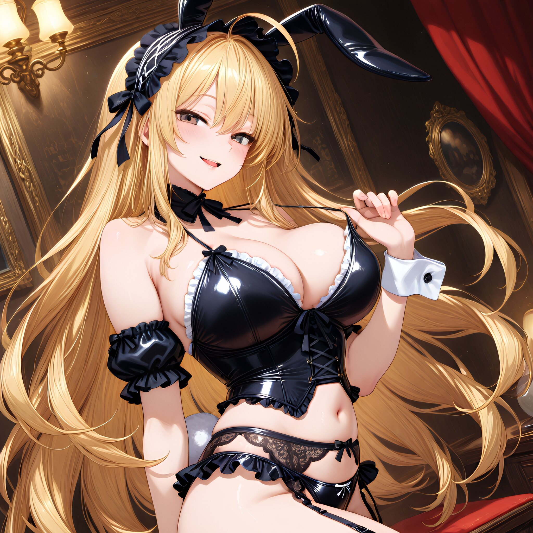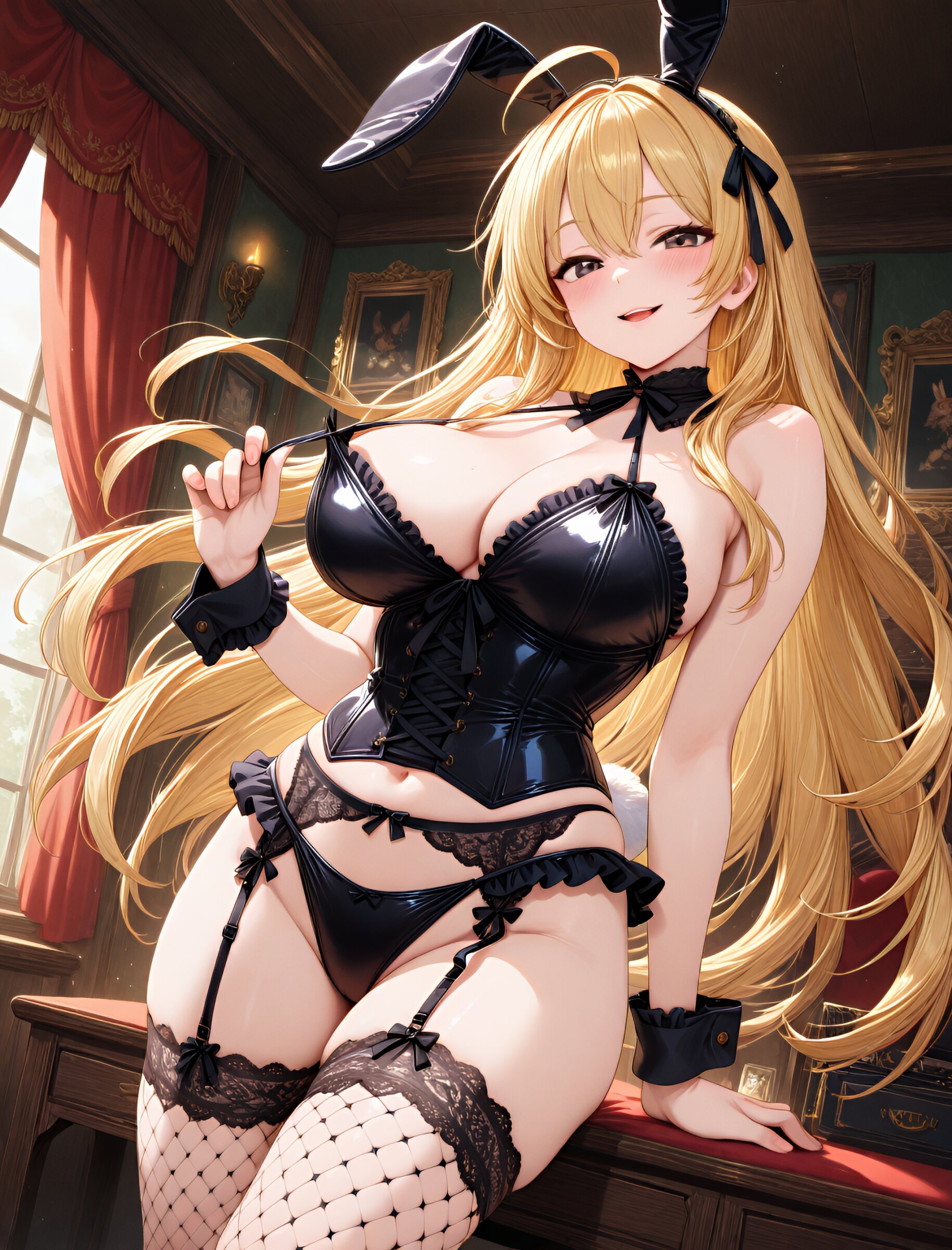 ( sling shot:1.5),,(bunny ears:1.3),(seductive smile, parted lips:1.2),(slightly open mouth),from side,(long flowing hair), (blond hair), dark copper eyes,(ahoge:1.3),(large breasts and hips), (gothic lolita swimsuit:1.5), (garter belt:1.3), (thigh-high fishnet stockings:1.7), (bustier:1.4), (frills:1.3), (lace:1.6),, (ribbons:1.3), (in livingroom), (dynamic angle),(dynamic pose:1.2), masterpiece, best quality, ultra-detailed, 8k resolution, very aesthetic, amazing quality <lora:noobai_ep11_stabilizer_v0.11_fp16:0.7> <lora:StS-Illustrious-Detail-Slider-v1.0:2.> <lora:sdxl-hairdetailer_02:2> <lora:xl_more_art-full_v1:1>