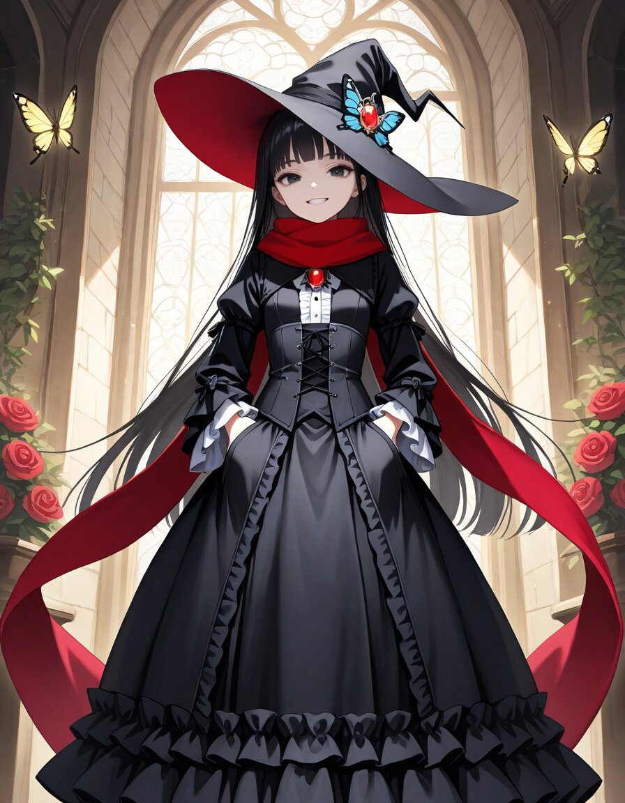 masterpiece,best quality,highres,highly detailed,general,1girl,solo,17yo,(hands in pockets, black witch hat,long red scarf,grin),cute girl,slender,small breasts,very long sleeves,light smile,black hair,long hair,bangs,black eyes,Witch girl,highneck,slender girl,goth fashion,long Gothic doress,long Gothic skirt,long Gothic pants,frill sleeves,frill clothes,magic wand with rose motifs and glowing gem,enchanted garden background with blooming roses,magical butterflies and soft sunlight,fantasy,