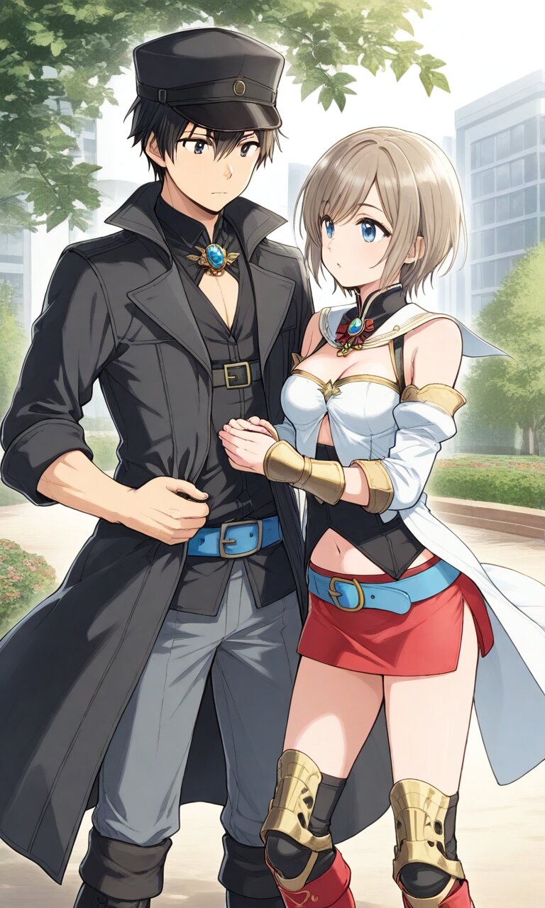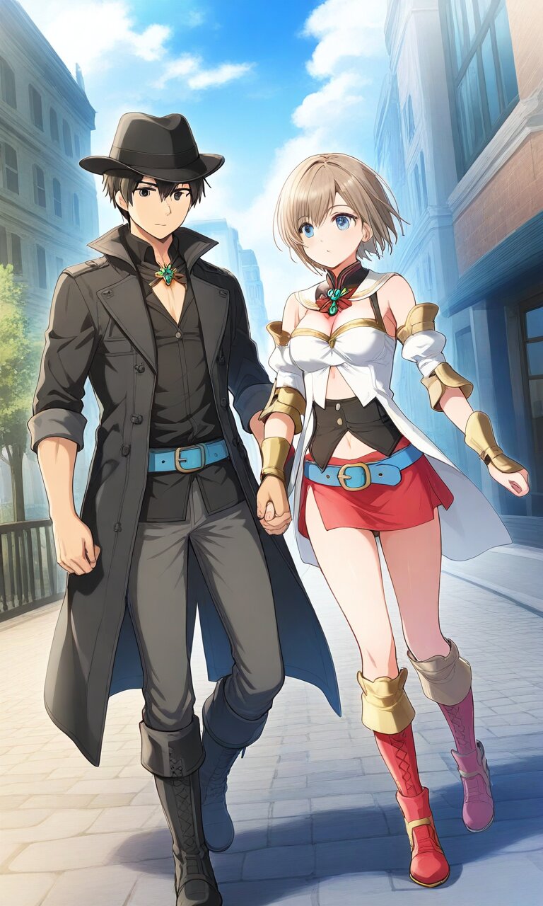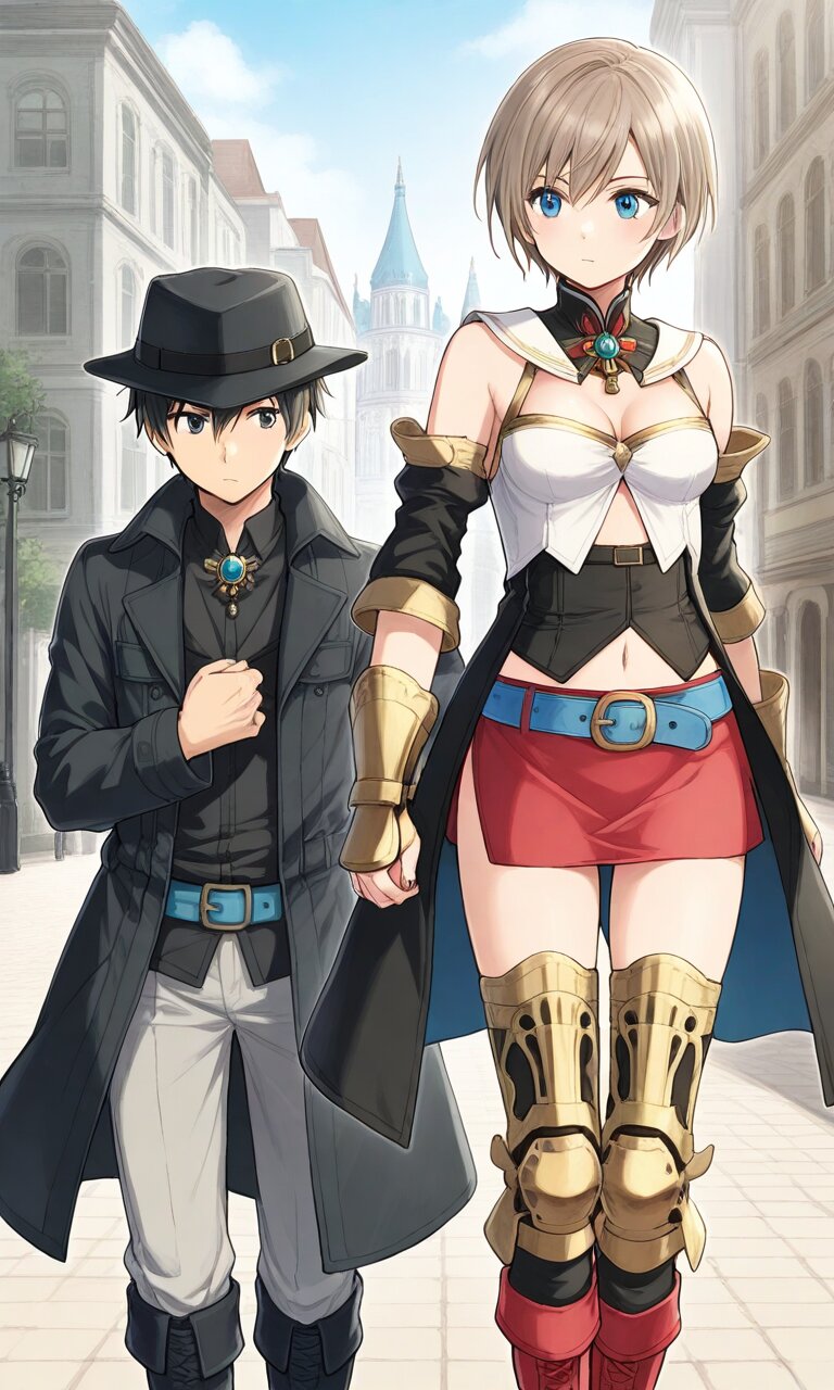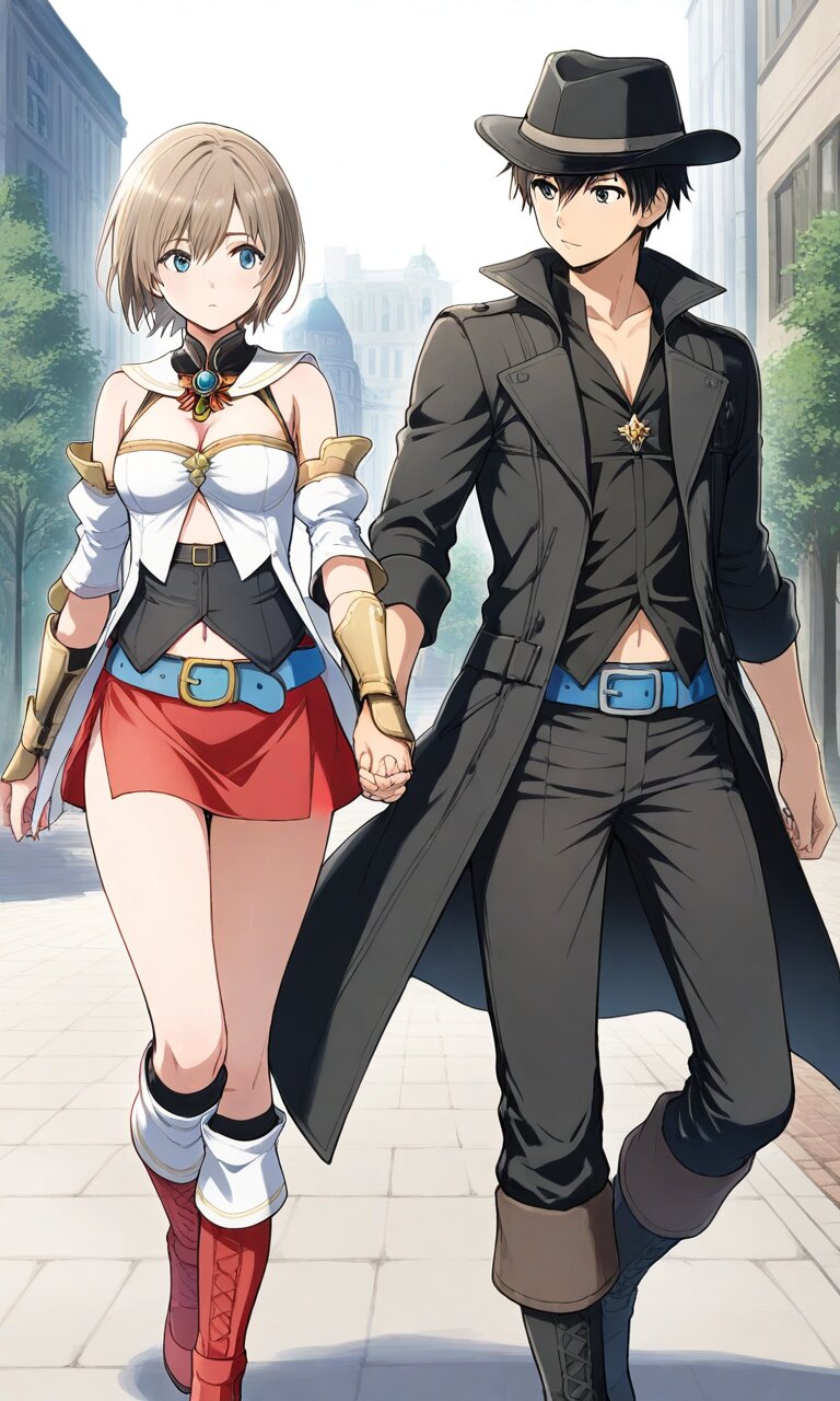 Couple, boy and girl, two people only,absurdres, ultra-detailed, master piece, high resolution, 8k, Boy, girl, couple, In the middle of town, a boy is hiding a girl behind a building. The boy's left hand is covering the girl's mouth, and his right hand is grab her breahts. Accident. BREAK the boy(original boy,black eyes, black short hair,Black long trench coat and hat,black shirt , black boots ) BREAK the girl(ffashebd, light brown hair, short hair, blue eyes, cleavage, brooch, white collar, white shirt, sleeveless shirt, black underbust, navel, red miniskirt, blue belt, detached sleeves, gauntlets, armored legwear, red boots ),