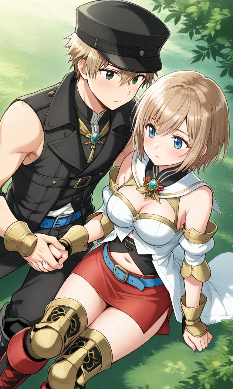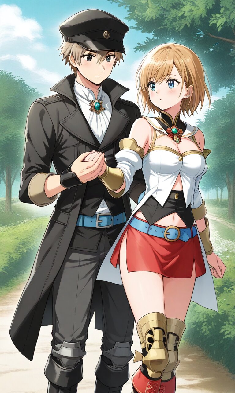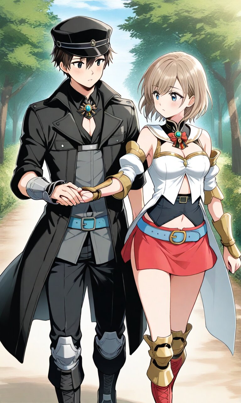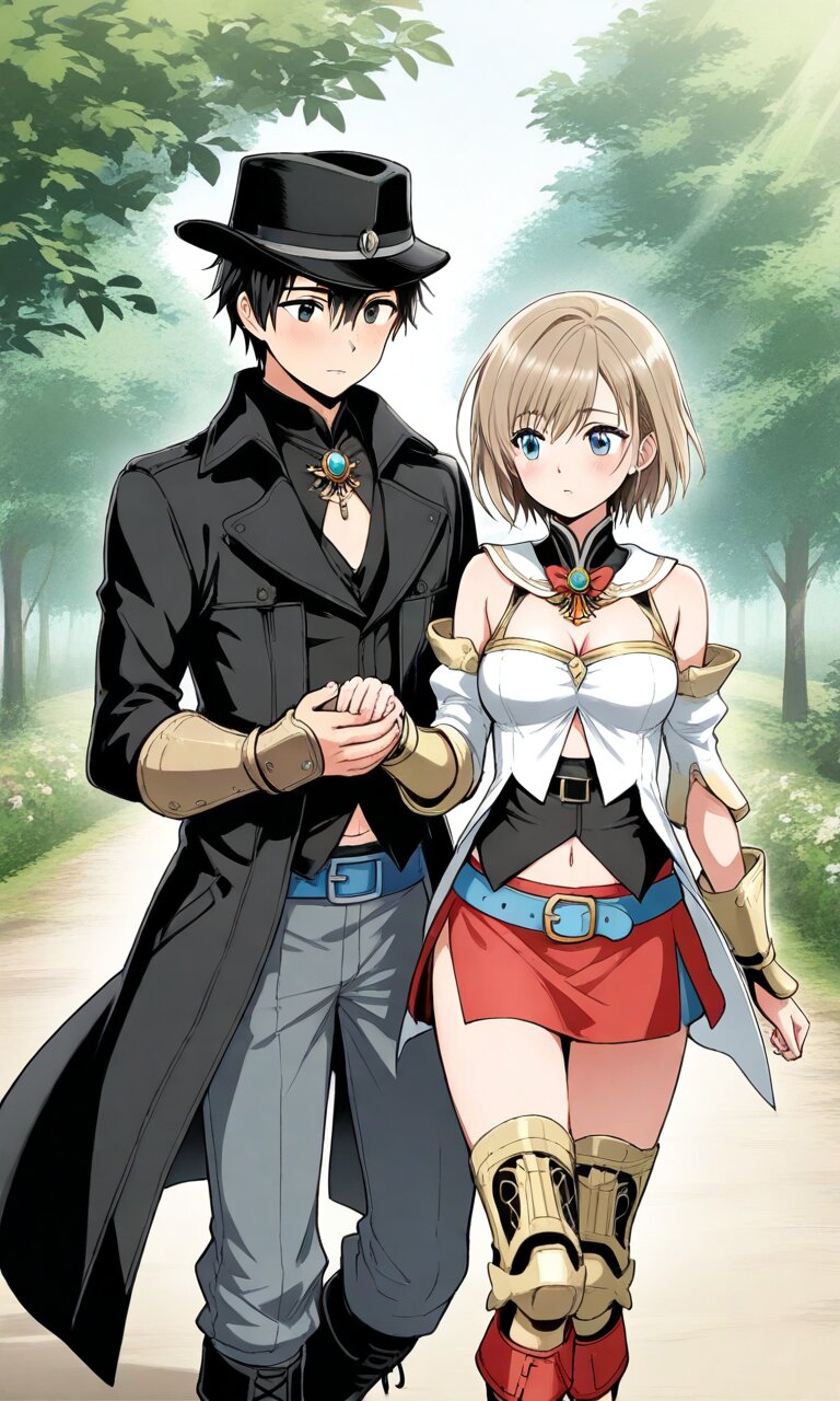 Couple, boy and girl, two people only,absurdres, ultra-detailed, master piece, high resolution, 8k, Boy, girl, couple, a man and woman holding hands in a forested pathway by each other, 1girl, blush, 1boy, shirt, white shirt, holding hands, outdoors, BREAK the boy(original boy,black eyes, black short hair,Black long trench coat and hat,black shirt , black boots ) BREAK the girl(ffashebd, light brown hair, short hair, blue eyes, cleavage, brooch, white collar, white shirt, sleeveless shirt, black underbust, navel, red miniskirt, blue belt, detached sleeves, gauntlets, armored legwear, red boots ),