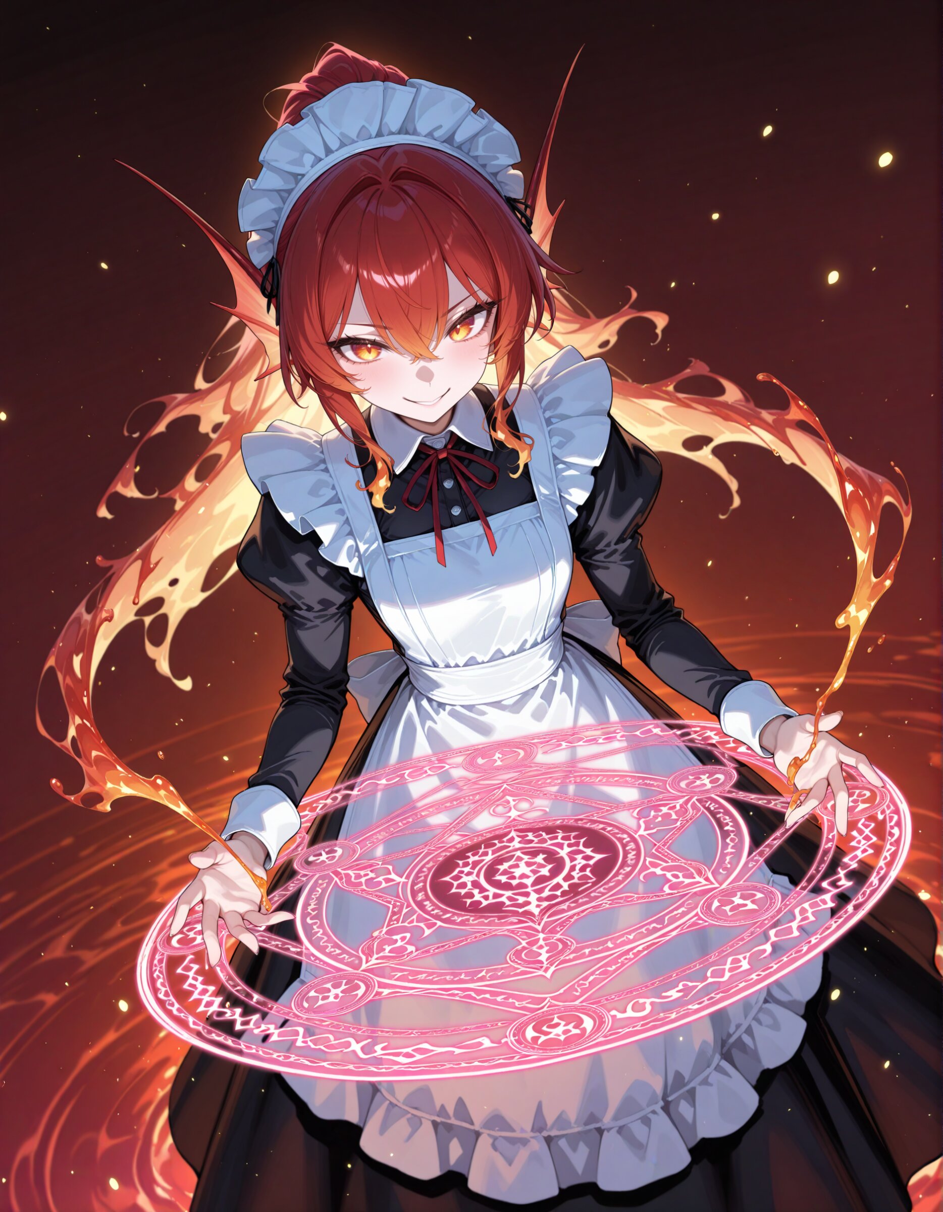 (fisheye,fisheye lens angle:1.0), (high angle shot:1.15) (absurdres absolutely resolution:1.2),texture, official art, ultra detailed, unity 8k wallpaper, dark theme, (simple crimson background:1.2), drop shadow, colored shadow, 1girl, (ultra-detailed), solo, maid, pale skin, pale crimson hair, (beautiful slit pupils, naughty face:1.0), long sleeves classic maid uniform, long skirt, maid headdress, maid apron, luminous effect lens flare lotion shiny-glistening cute girl solo dutch angle, straight-on, (high angle shot:1.0), (upper body:1.1), (liquid hair, floating clear water, head fins, ripples, reflective water:1.1), (ultra detailed floating glowing magic circle:1.2), (high saturation) depth of field, bokeh, super fine concept art, hard surface, 8K, unreal engine, newest, masterpiece, best quality, amazing quality, very aesthetic, absurdres, you can add scenery, (volumetric lighting), To make the background more distinctive. professional art lots of details, , overexposure, shiny-glistening, (watercolor style:0.0), (pastel color style:1.0) 4ur4_illu,shiny, glowing, glowing particles, glowing light particles, light particles, flame crimson, <lora:noline (1):-0.5> <lora:sdxl2-flat2-512b:-0.2> <lora:facelightup_xl_v10:0.5> <lora:V2_yakumo_alchemy:0.5> <lora:Aura_illu:0.1>