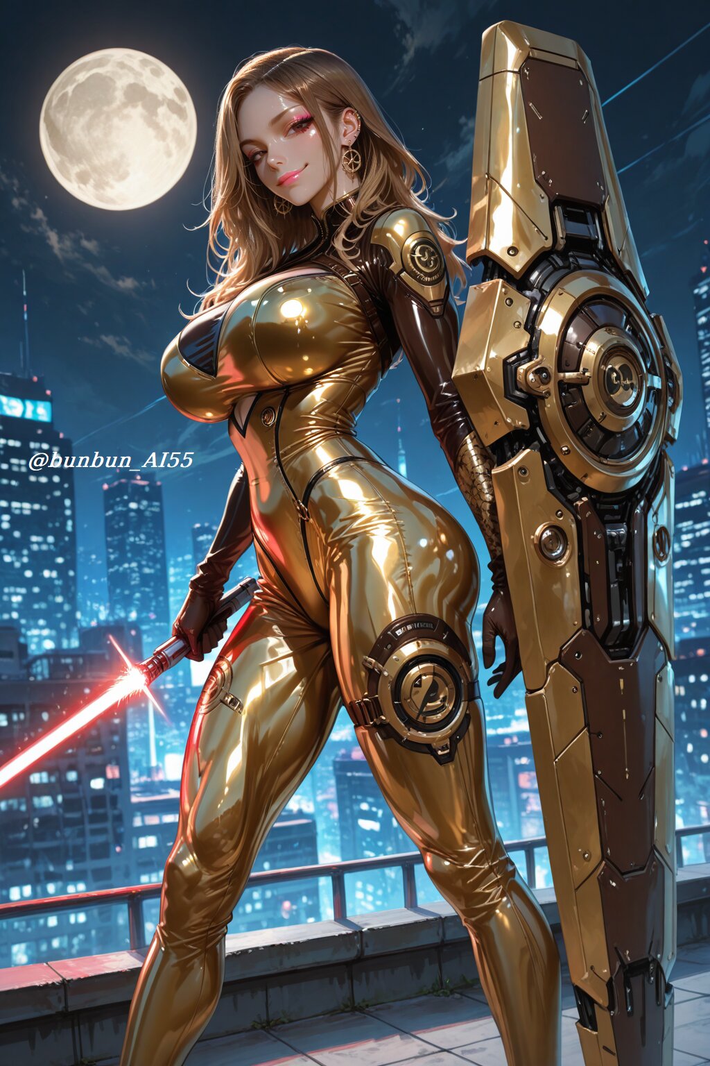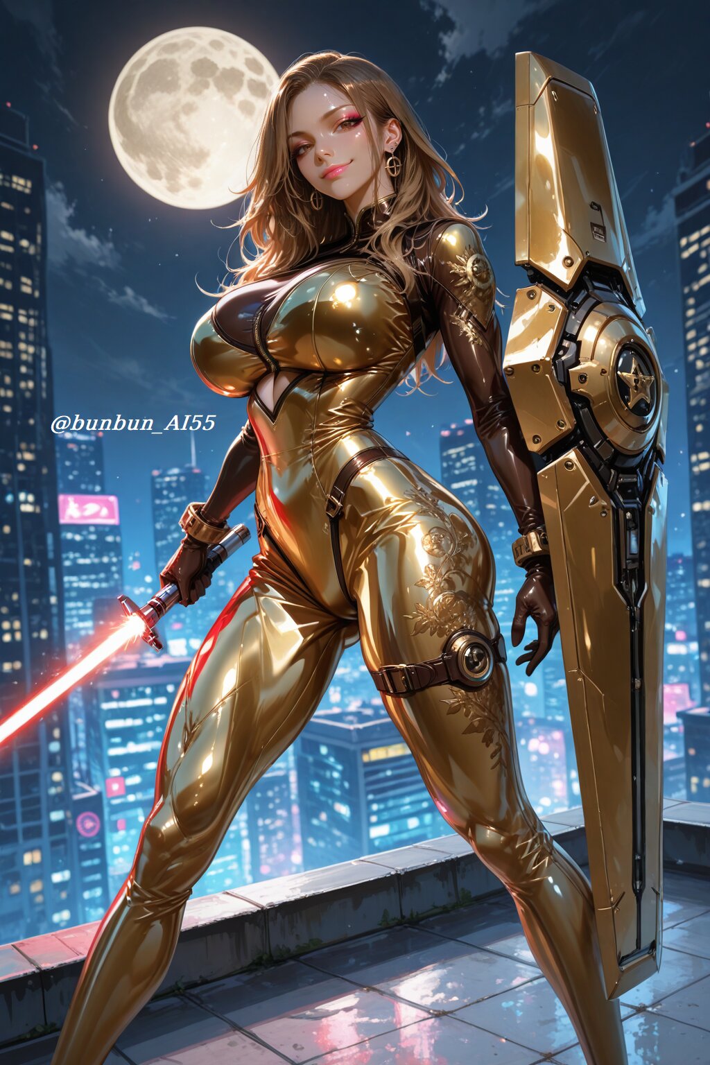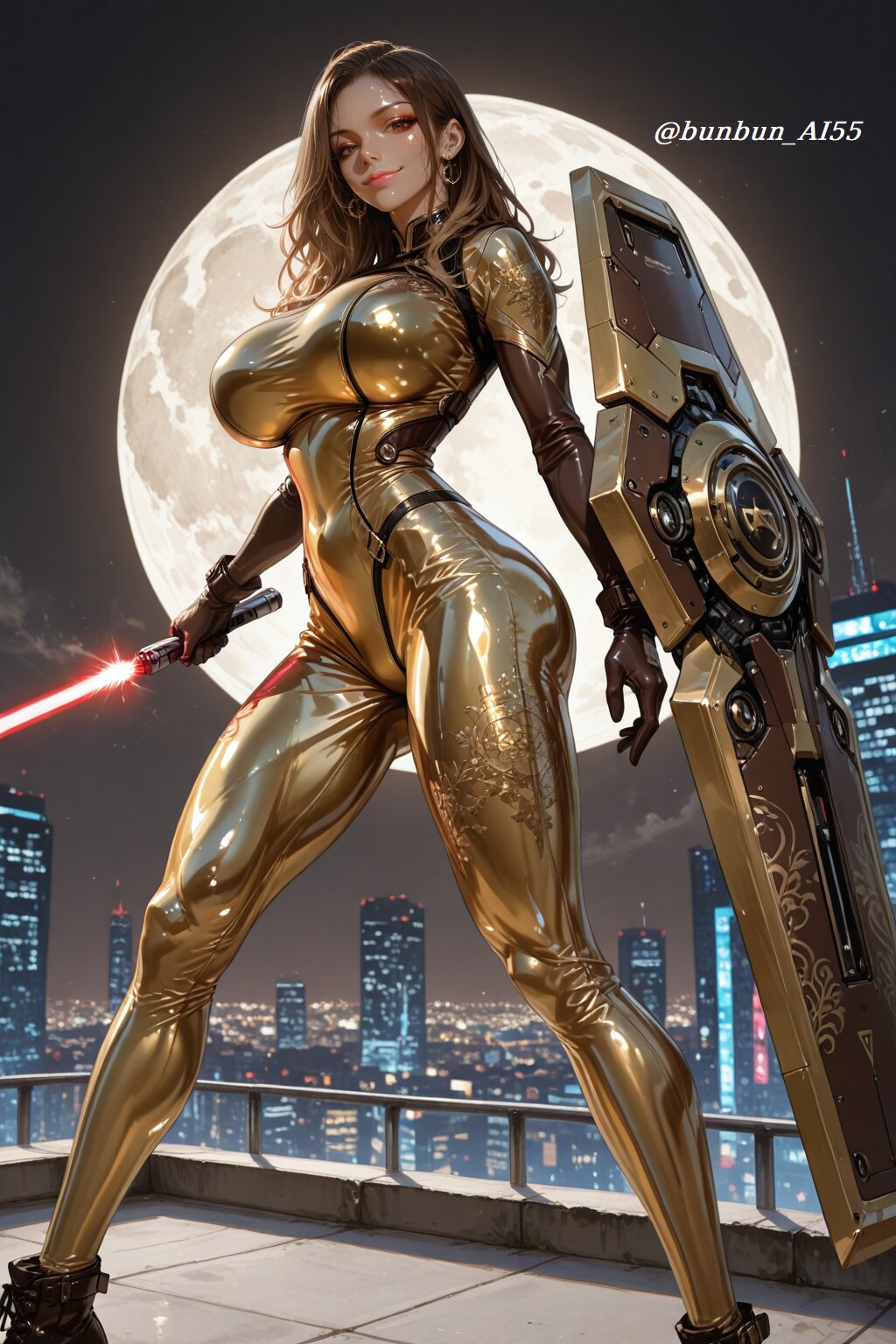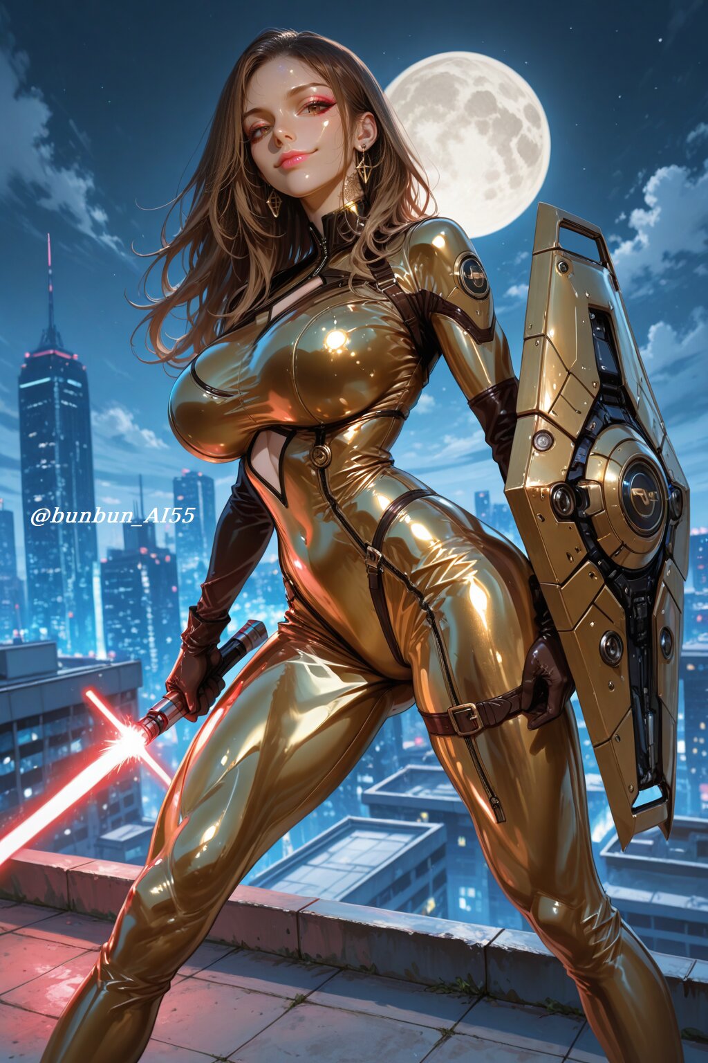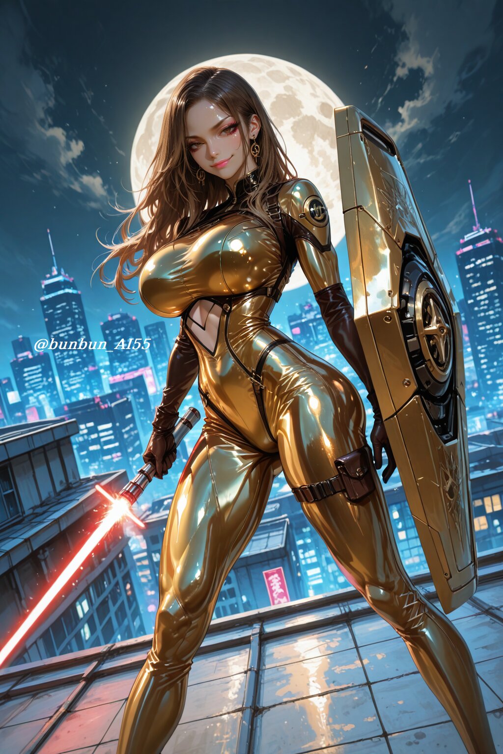 HDR, 8K,masterpiece, best quality, amazing quality, very awa, very aesthetic, absurdres, newest, detailed eyes, realistic eyes, realistic body, highres, add detail, sharp detailes, sharp lines, sharp focus, anime style, (realistic, hyperrealistic, photorealistic), sexy style, perfect anatomy, intricate details, sci-fi style, BREAK perfect lighting, professional lighting, face lighting, (1girl, beautiful gyaru:1.5, 22year old), (gyaru, model, adult, beauty, sexy), (gyaru face, beautiful face, slim face, small face, cute face, detailed face, brown eyes, gyaru makeup, pink lips), (looking at viewer, alluring expression:1.2, mischievous smirk), BREAK nsfw, (brown long hair:1.5), (jewelry, piercing, earrings), (huge breasts, pointy breasts), (long legs), (perfect hands), (shiny skin, glossy skin), (super model body:1.2, muscle body:1.2, slim body, athletic body:1.2), BREAK (wearing a gold sexy bodysuit:1.5, latex gloves, detailed bodysuit:1.2, asymmetrical bodysuit:1.2, bodysuit cutout:1.2), (spandex, catsuit), (light reflections), (shiny, glossy, luster, latex), (tight fit), BREAK (standing, legs apart, holding lightsaber in the one hand, holding mechanical shield in the other hand, intricate patterns, dynamic action pose), (detailed background, rooftop of skyscraper at night, full moon), (from side:1.3), (face focus shot:1.3, medium shot:1.2, dynamic angle),