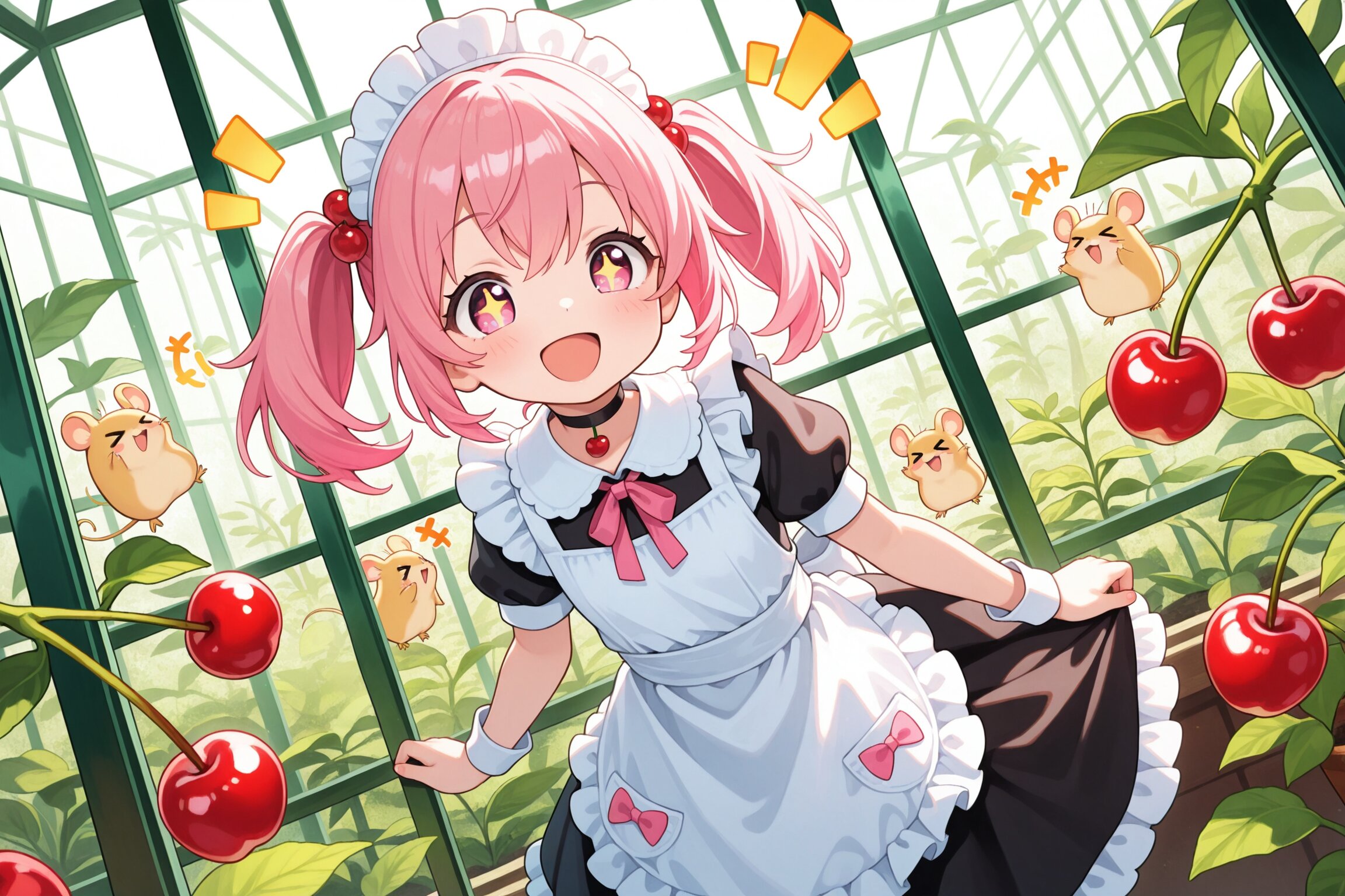 1 little girl, solo, diagonal angle, masterpiece, best quality, amazing quality, very aesthetic, pink hair, twintails, pink eyes, +_+, open mouth, smile, cheerful, +++, notice lines, choker, maid outfit, hamsters, > <, cherry, in greenhouse,