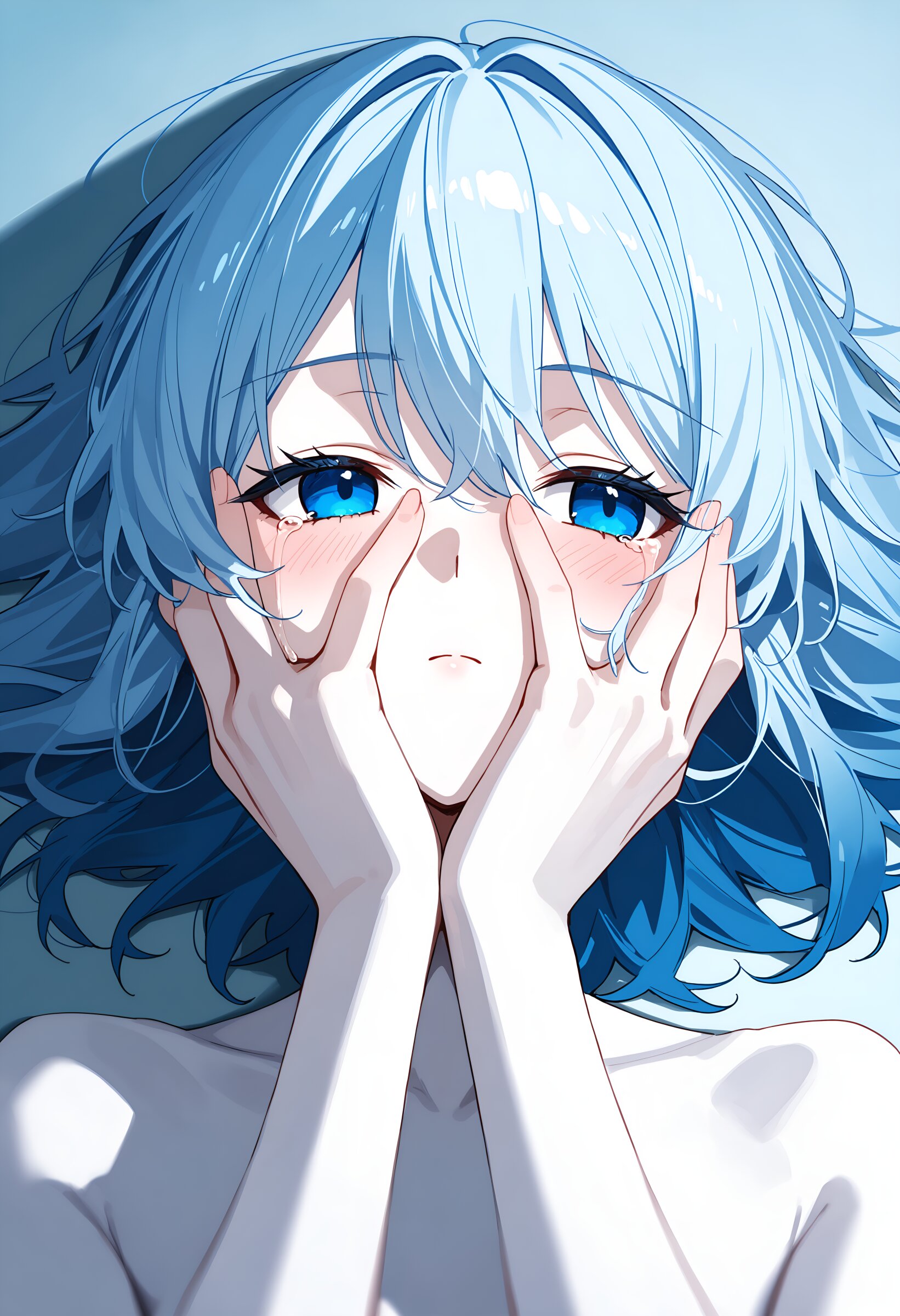 #Quality masterpiece, best quality, ultra-detailed, CG anime style #ColorStyle monochrome blue, single color scheme, deep cold palette, color-coordinated composition #Character 1girl, emotionless expression, small narrow eyes, dilated pupils, blank stare, subtle tension in face #Pose own hands covering face, one eye visible through fingers, stable upper body posture, head slightly tilted, natural arm and hand placement, correct anatomy #Hair radiant deep blue hair, rich midnight blue, silky dense strands, soft flowing texture, slight shimmer, color depth in hair, intricate blue gradient in hair only, hair emphasized, no highlight, no mesh, no streaks #Skin translucent white skin, porcelain-like tone, fine pores, subtle blush, soft blue ambient shading, blue-reflective contours #Tears moist eyelashes, thin tears tracing cheeks, natural tear paths, transparent tear texture #Emotion emotional suppression, fragile presence, internalized sadness, post-crying stillness #Lighting soft cinematic lighting, top-down ambient light, subtle rim light on hair, blue-toned subsurface scattering, smooth shadow transitions #Mood melancholy, loneliness, dreamlike sadness, cold emotional tone #Composition centered framing, vertical portrait layout, stable visual balance, soft vignette, shallow depth of field, gradient blue background, background blur for focus control