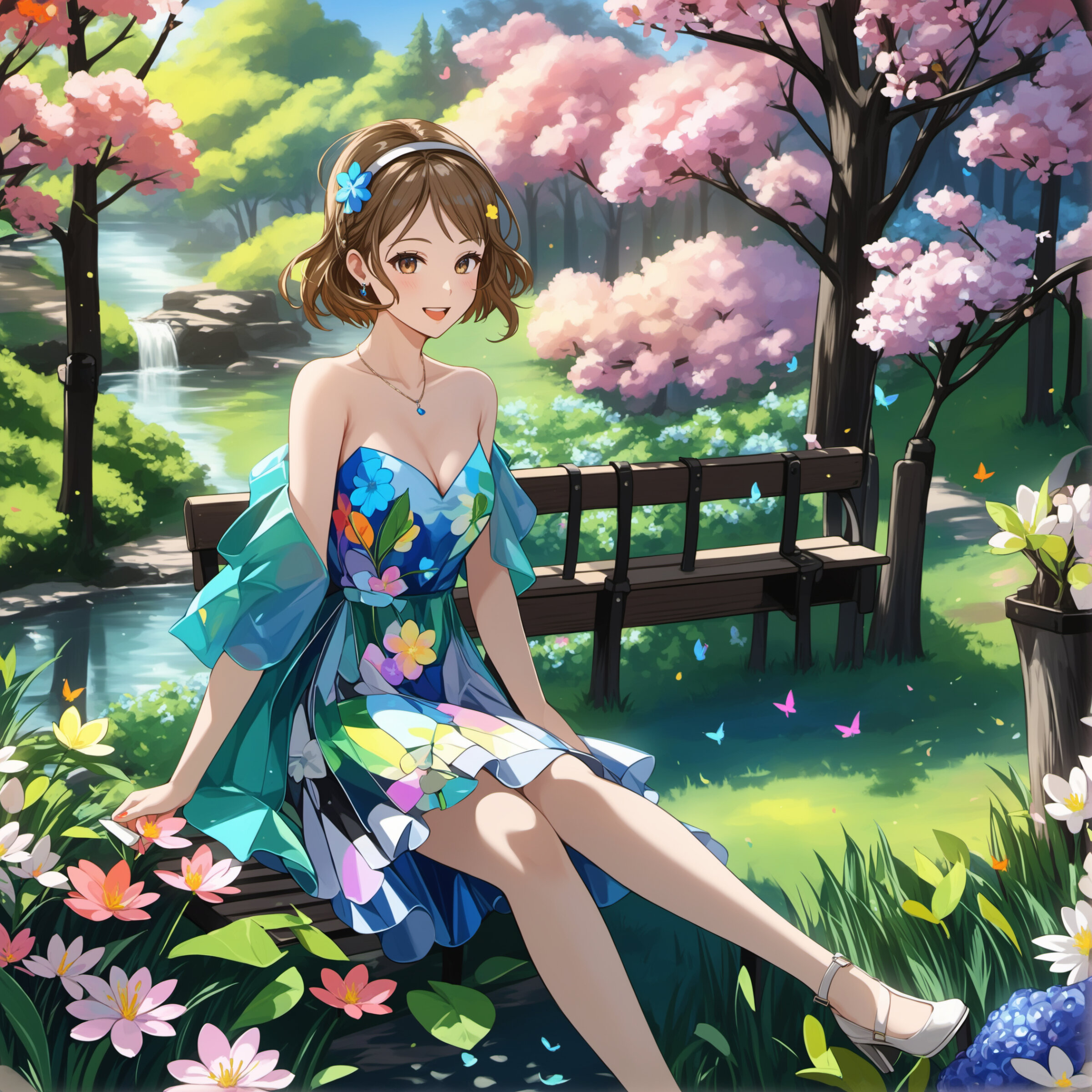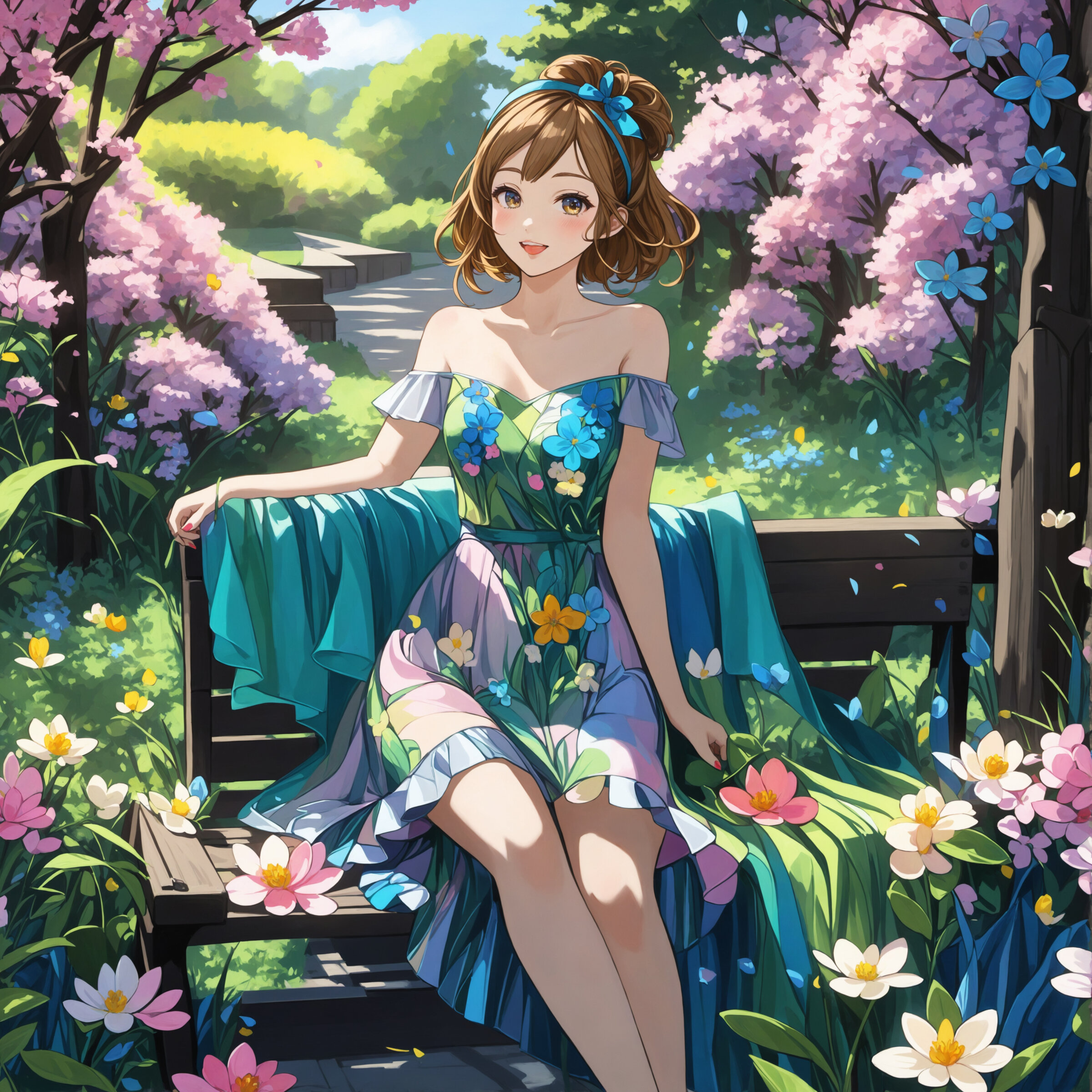 masterpiece, best quality, animation style, anime colored, Vibrant colors,glitters,Hydrangea, (spring-inspired off-shoulder mini dress:2.0),A young woman with a charming bob-cut, light brown short hair, sitting on a park bench, She wears a spring-inspired straps off-shoulder mini dress, exuding a pretty, cute, and adorable kawaii vibe. The park is filled with vibrant hydrangea flowers in full bloom, and her face lights up with a shining, radiant smile as she gazes at them, feeling motivated for the day's work. The scene is captured in a sharp focus, 4K epic detailed style with photorealistic quality, featuring smooth, clear skin with realistic texture, vibrant colors, and cinematic lighting. The composition is professional, sleek, modern, and minimalist, with a light background, beautiful natural light, and subtle light reflections in her eyes. The artwork combines elements of line art drawing and vector graphics, with great composition, high-definition details, and a soft lighting effect that enhances the overall aesthetic.(beautiful legs:2.0),Colored Pencil Art, colored pencil strokes, light color, visible paper texture, colored pencil art