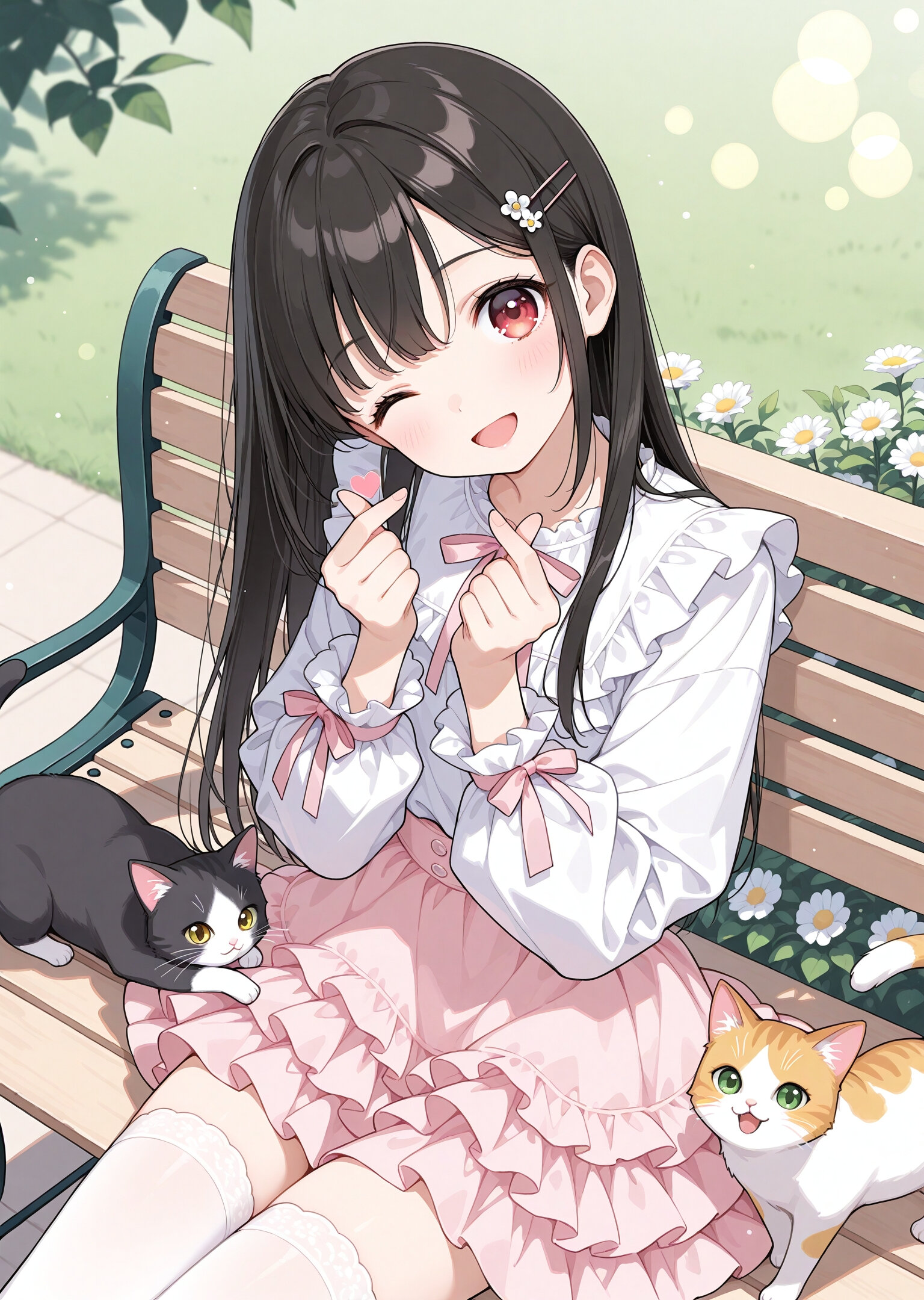(flat color:0.3),(tareme:0.3),cute 1girl, ruby eyes, straight hair ,black hair,( hair between eyes:0.6) , hairpin,kawaii, (pastel theme :0.5), (depth of field:1.1), (bokeh:0.8), (blurry background:0.1), ;d, head tilt, BREAK (playful cat on bench:1.3), cats ,finger heart, hands up, flower, fashion, (pale pink bow:0.5), ribbon, (from side:0.5),from above,(elegant:0.4), (pastel_hues:0.3), thighhighs, outdoors, ootd , white shirt,puffy long sleeves, pink skirt with frills , layered skirt,