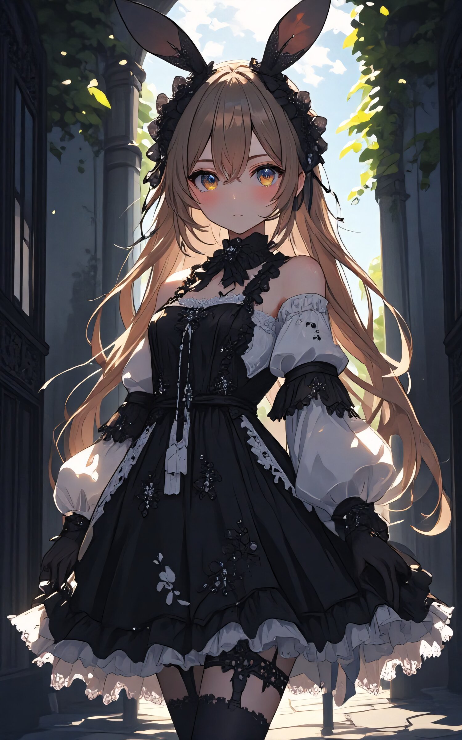 anime style, full-body, , long light brown hair flowing elegantly, deep expressive eyes with double eyelids and long delicate eyelashes, , dressed in an elaborate gothic lolita outfit adorned with lace, ribbons, and frills, deep black and white color scheme, wearing a delicate bunny-ear headband with lace accents, standing in a dimly lit Victorian-inspired courtyard with wrought iron gates and ivy-covered stone walls, soft ambient lighting enhancing the mysterious and elegant atmosphere, cinematic composition, visually captivating aesthetic