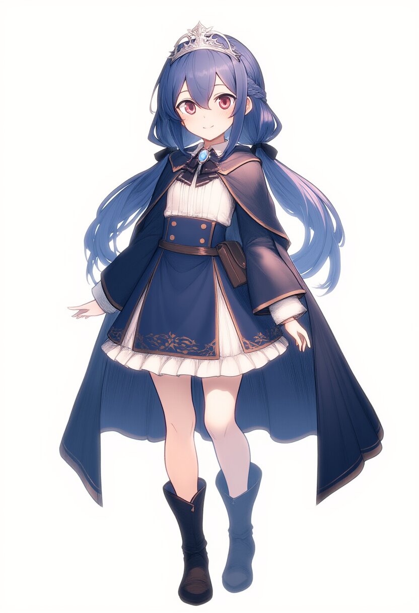 (traditional media:1.5),(sepia:1.8),masterpiece,best quality,ultra detailed,1girl,girl,short stature,flat chest,red eyes,{{cobalt Blue hair}},{pigtails},very long hair,long half updo,{{low twintails}},{{{extra long sideburns}}},{{Paladin}},Knight,brooch ribbon,Navyblue mini Cape,blouse,skirt,White tiara,short boots,smile,simple background,full body,, no text, best quality, very aesthetic, absurdres