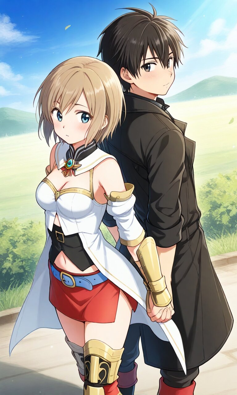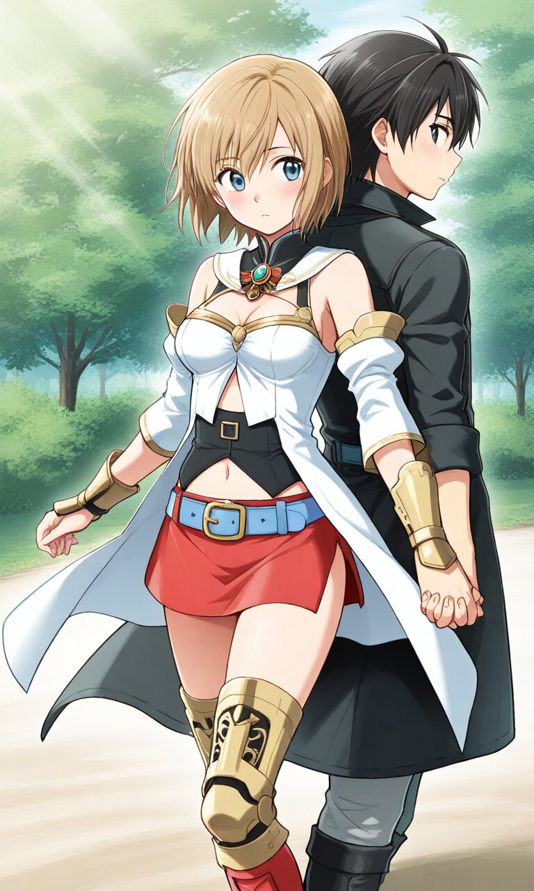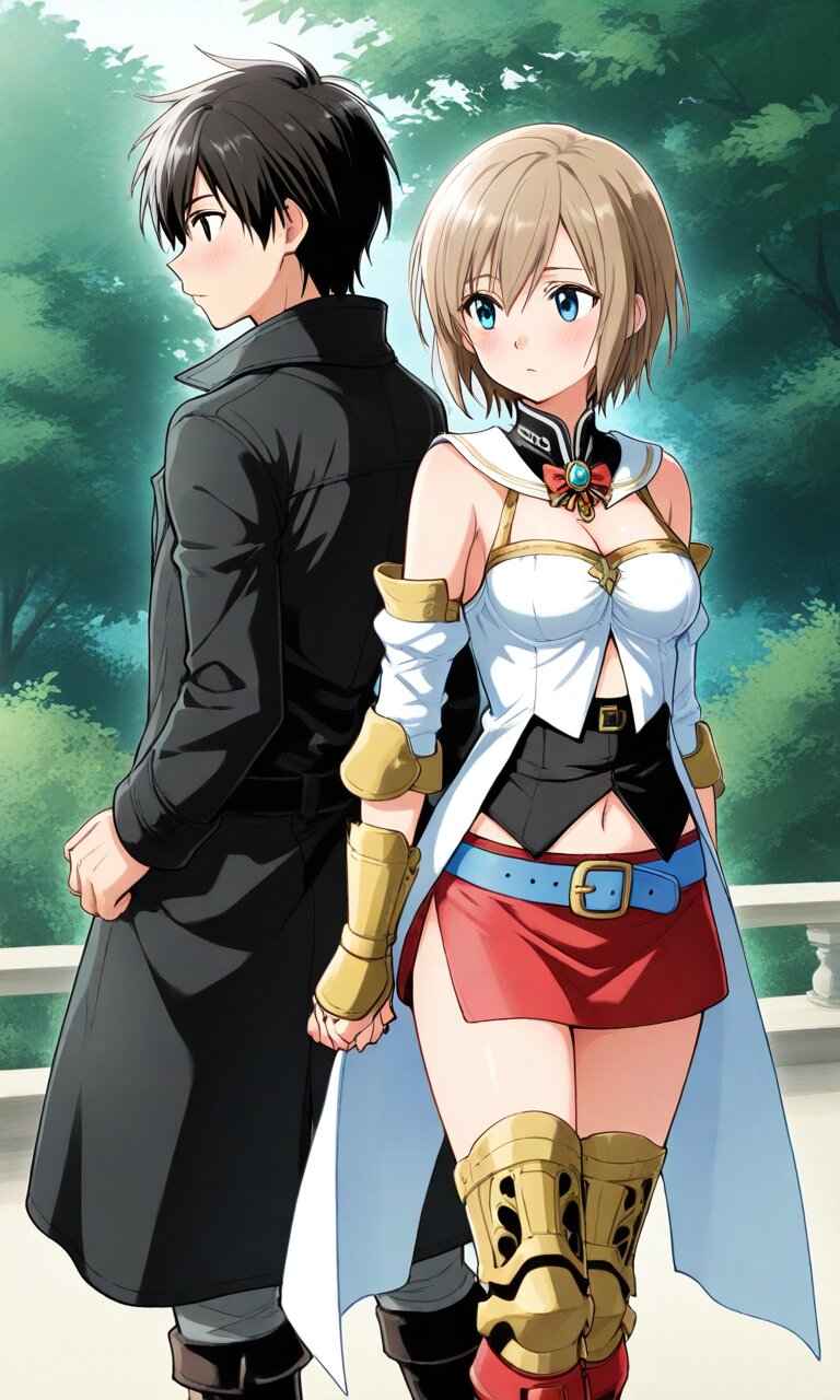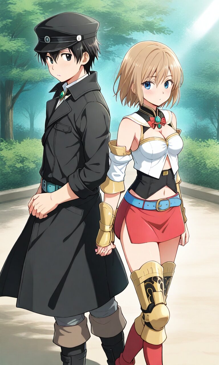 Couple, boy and girl, two people only,absurdres, ultra-detailed, master piece, high resolution, 8k, Boy, girl, couple, a man and woman holding hands and walking together, 1girl, 1boy, back-to-back, blush, BREAK the boy(original boy,black eyes, black short hair,Black long trench coat and hat,black shirt , black boots ) BREAK the girl(ffashebd, light brown hair, short hair, blue eyes, cleavage, brooch, white collar, white shirt, sleeveless shirt, black underbust, navel, red miniskirt, blue belt, detached sleeves, gauntlets, armored legwear, red boots ),