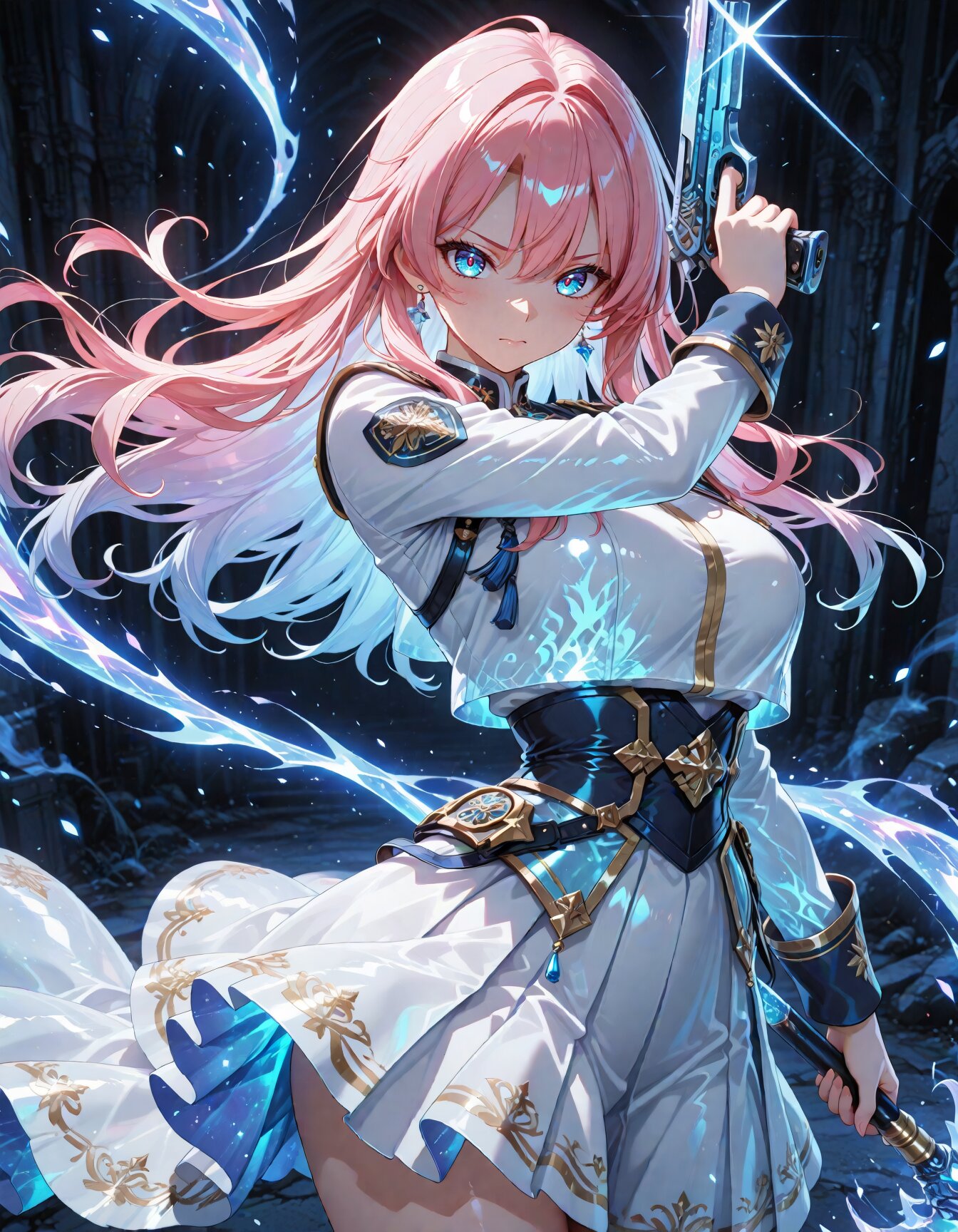 1girl, (anime style:2.0), ultra-detailed, 8k, large breasts, (solo:2.0), beautiful face, multicolored theme, (color:1.1), glowing, glowing particles, iridescent aesthetic, ethereal glow, holographic shimmer, celestial radiance, pearlescent reflection, fantasy military uniform, skirt, cowboy shot, dynamic pose, holding weapon, holographic clothing, long sleeves, holding gun, holding, shade, shaded face, gun, weapon, white skirt, breasts, light particles, looking at viewer, glint, blue theme, handgun, masterpiece, best quality, very aesthetic, newest, absurdres, safe <lora:Smooth_Booster_v3:0.2> <lora:V2_yakumo_alchemy:0.5> <lora:Ethereal_Aesthetic_illustrious:0.2>