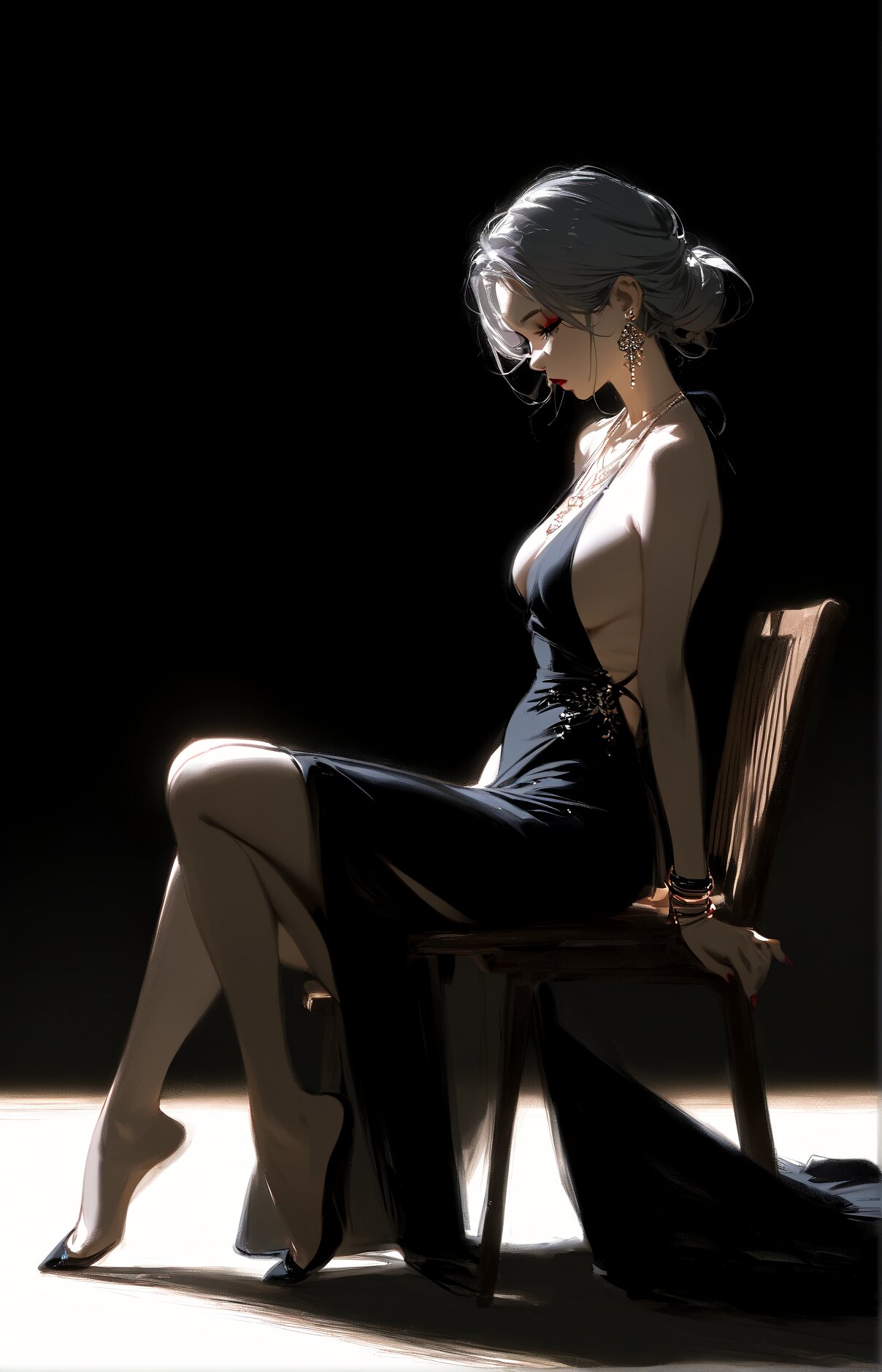 dre, chiaroscuro, contour drawing, pastel, ink drawing, flat color, line art, asian, perfect anatomy, 1woman, side view, slender, sitting wood chair, heavy makeup, bare shoulder, bare legs, sideboob, bangle, earing, necklace, high slit black halterneck black long dress, open back, gray hair, updo, sideburn, black background, dramatic shadows, dramatic lightings, bracelet, jewelry, backless outfit, black dress, backless dress, pale skin, full body, realistic, breasts, halterneck <lora:dark:0.66>