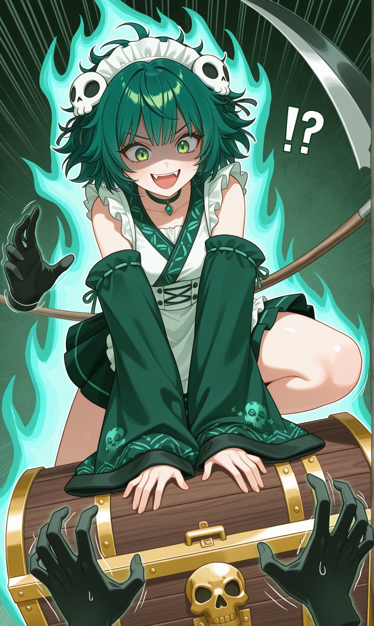 1girl, solo, cobalt green hair, short hair, messy hair, green eyes, demon fangs, open smile, cheerful, !?, choker, green wa maid outfit, (oversized sleeves:1.2), detached sleeves, (floating black ghosty hands:1.2), skull hair ornament, in mimic chest, motion lines, scythe motion, weapon, scythe, black scythe, shaded_face, superhero landing, aura