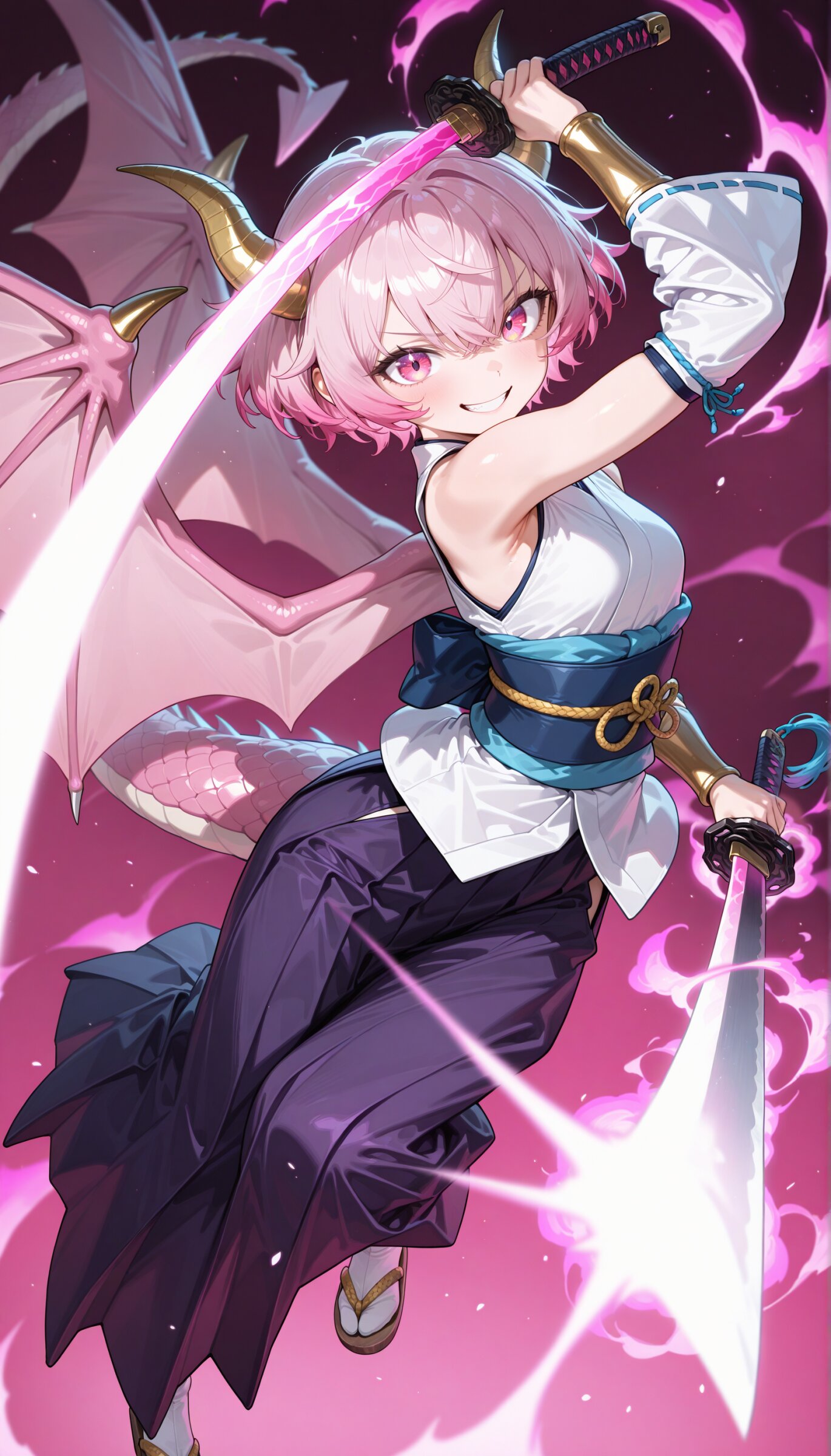 foreshortening, close to viewer looking at viewer, 1dragon girl, solo, ,viewfinder, , dragon girl, 15yo, (2dragon gold horns attached to the head:1.2), (light pink hair:1.3), (doyagao:1.3), (wavy short hair:1.3), (beautiful pink eyes:1.3), cute, (muscle,buff well-built body,ultra-detailed muscle:0.4) , first-rate female body, perfect body, small breasts smart hips, a dragon tail (2long pink dragon wings on back:1.2), bracer, dark purple hakama,(overskirt:1.0) White Japanese Clothes , (White detached sleeve:1.0), blue and white stripe obi, inner, straw sandals, tabi, fighting smile, (doyagao:1.3), , glowing japanese short sword, (japanese sword action:1.2), glowing sword katana katana swing out glint, (swirling pink energy,energy magic,energy:1.2), glowing eastern dragon pink aura, (simple pink background:1.0) depth of field, bokeh, super fine concept art, hard surface, 8K, unreal engine, masterpiece, best quality, amazing quality, very aesthetic, absurdres, you can add scenery, (volumetric lighting), To make the background more distinctive. professional art lots of details, , overexposure, shiny-glistening, (watercolor style:0.0), (pastel color style:0.0) <lora:noline (1):-0.5> <lora:sdxl2-flat2-512b:-1.0> <lora:facelightup_xl_v10:0.5>