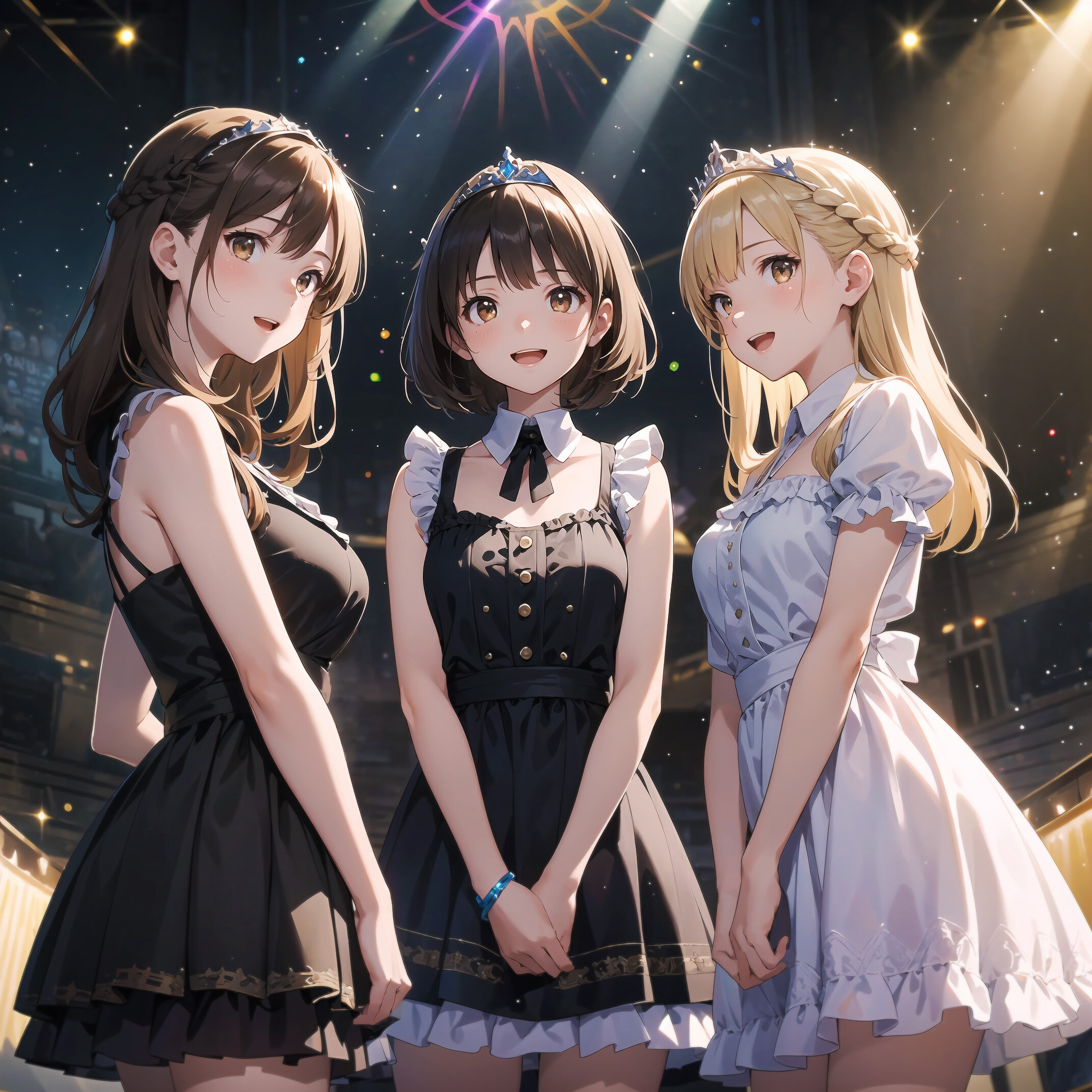 (masterpiece,high resolusion,illustration,ultra detailed 8k art,extremely detailed CG,official art,clothes reflecting light,detailed shiny skin,detailed background:1.3), ((highly detailed beautiful face and eyes)),(3girls,20yo,mature female:1.5),(small breasts:1.2),(beautiful brown hair,french braid,beautiful brown eyes:1.1),(a girl is standing on the stage with a light shining down on her and the girl standing on the stage alone in the dark church,open mouth,smile,arms behind body:1.3), BREAK,(God_rays:1.5) , <lora:MultipleGirlsGroup:0.25:lbw=pose>(2woman,lineup,tiara:1.2), (cowboy shot:1.4),tiara, (lens flare,Glitter,Diffuse light:1.3), <lora:jk fashion_v2:0.7:lbw=ware>, (frills,frilled dress:1.4), (beautiful brown eyes:1.3),<lora:flat2:-0.3>,<lora:tareme_gen3_dim1:0.4> <lora:glowingdust_20230806143817:0.2:lbw=back>(BOKEH:1.5),(nice hands,perfect hands:1.0),<lora:GoodHands-vanilla:1>,(mature female:1.5),blonde hair, <lora:【Muggle Lora】extremeangle 广角仰拍:0.7:lbw=pose>(extremeangle:1.4)
