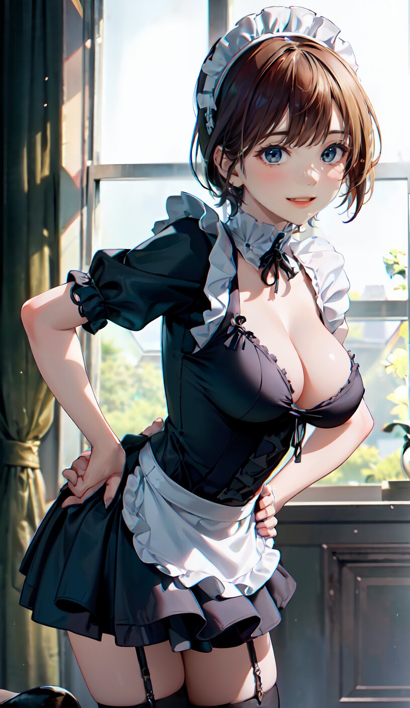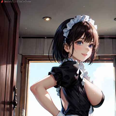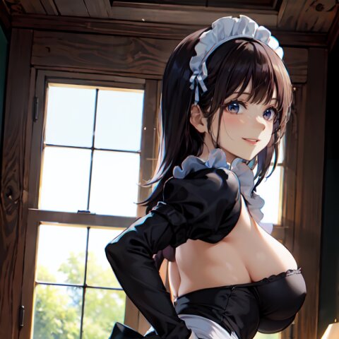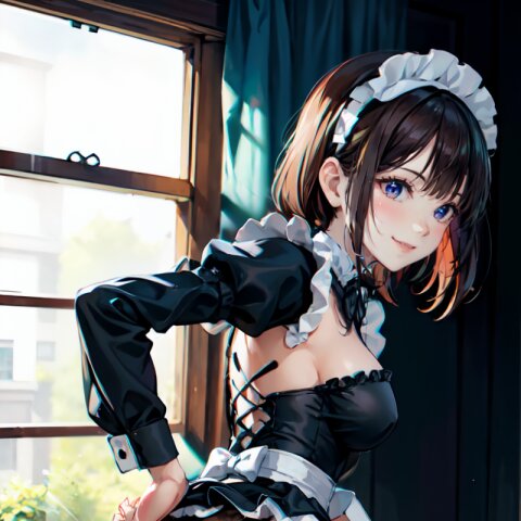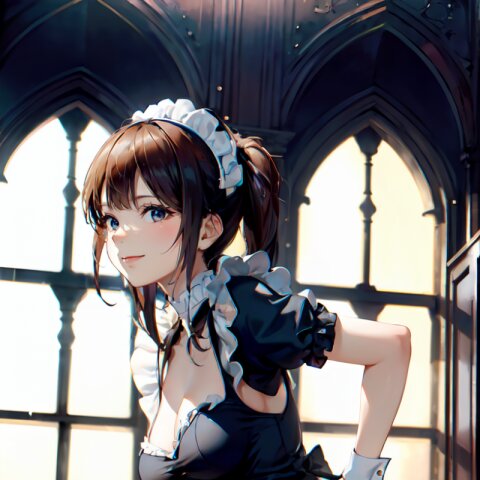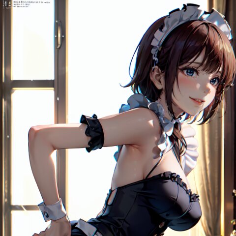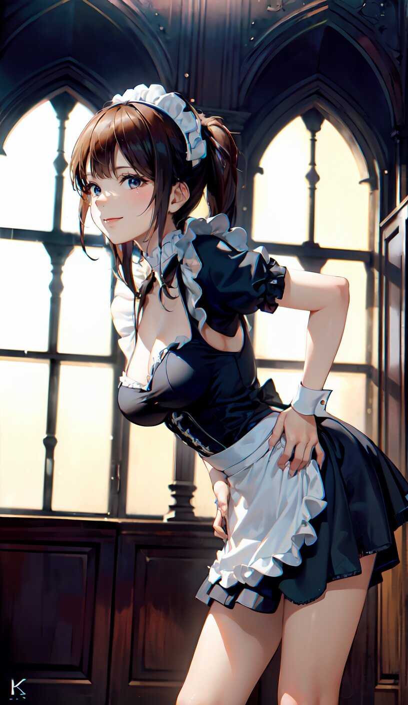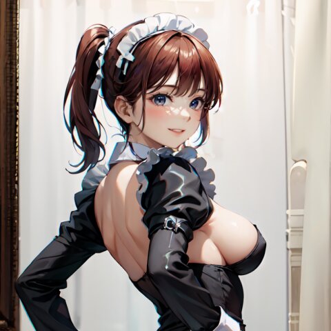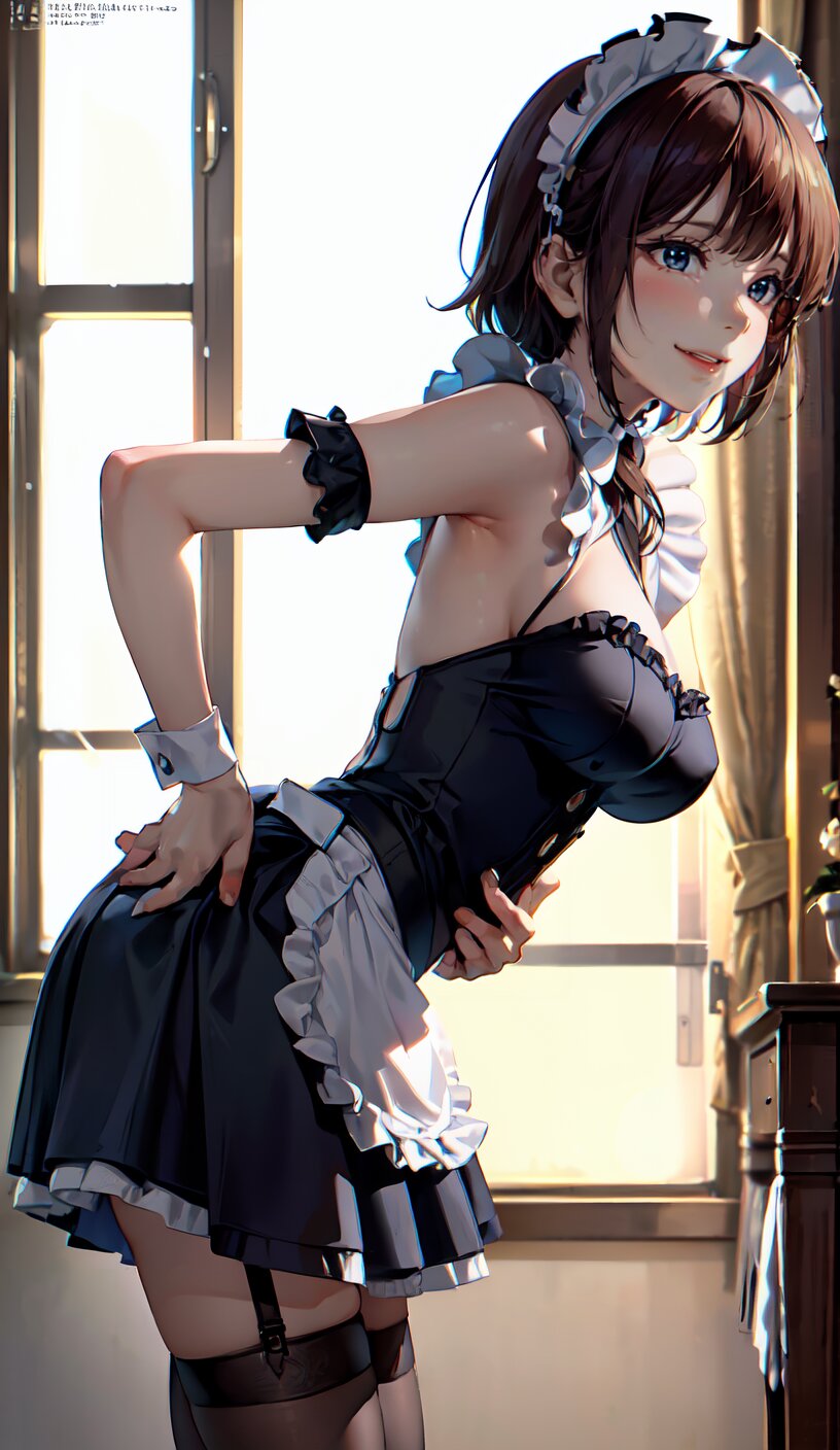 (from back: 1.2), (8k, best quality, masterpiece:1), (realistic, photo-realistic:1.4), HDR, (incredibly absurdres:1.2), 1girl, 20 years old, perfect anatomy, slender, (medium breasts, big ass: 1.4), beautiful detailed face, (cowboy shot: 1.6), perfect skin, detailed skin texture, looking aside, (Gothic Maid, black panties: 1.6), (standing and posing, leaning forward, hands on hip: 1.6), in the photo studio, <lora:mihi_v01:0.6>