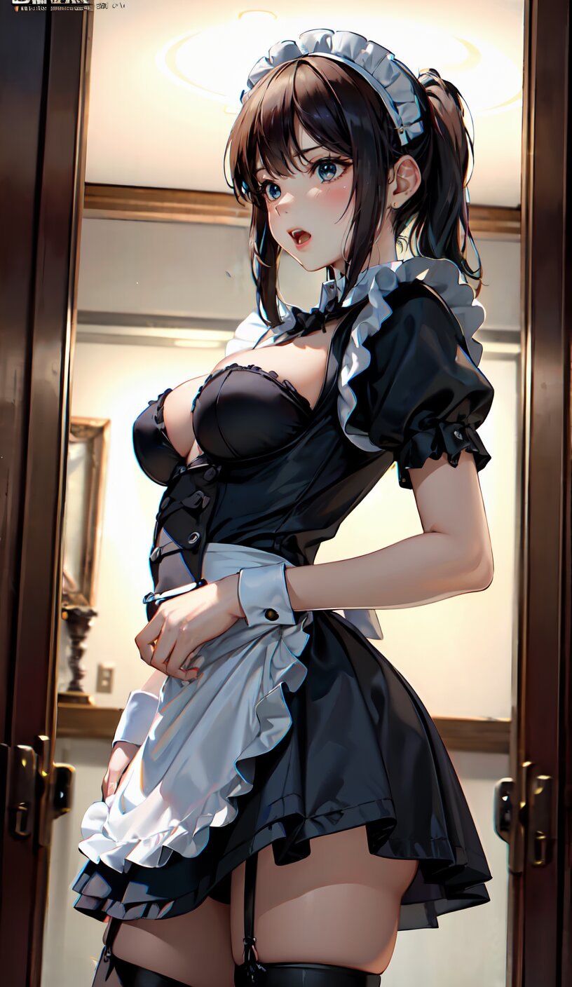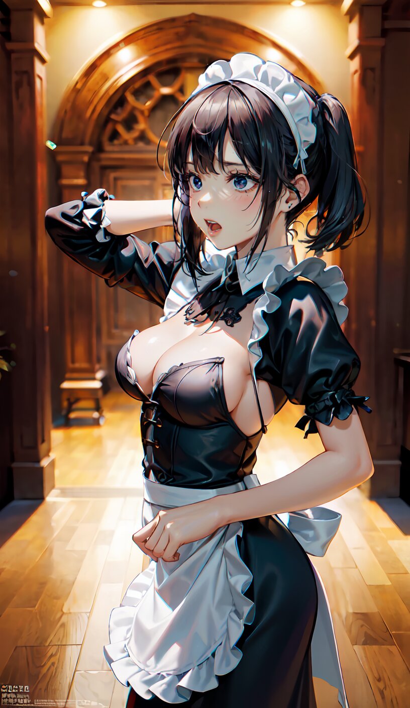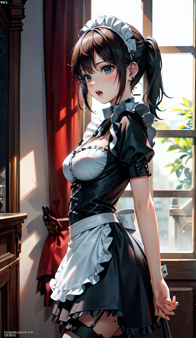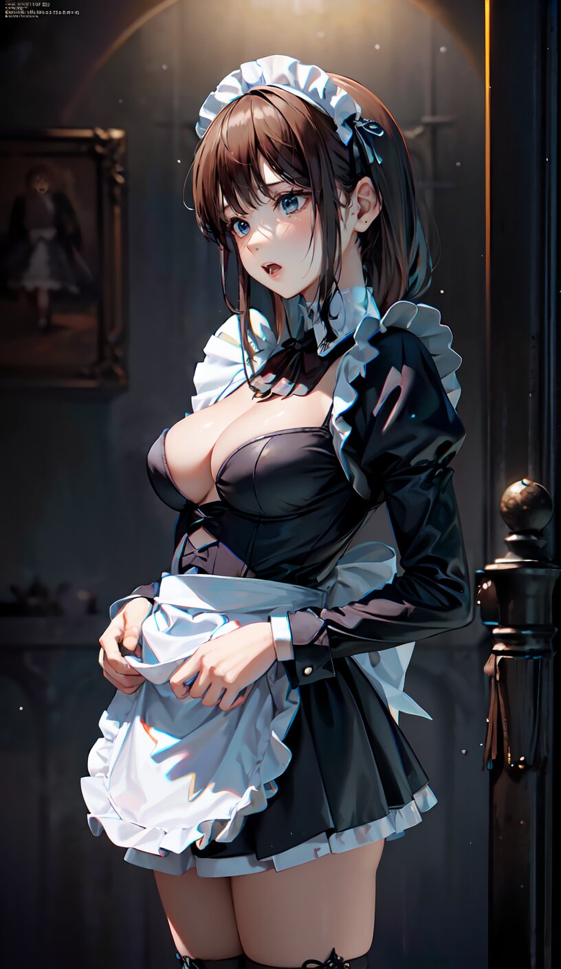 (from front: 1.6), (8k, best quality, masterpiece:1), (realistic, photo-realistic:1.4), HDR, (incredibly absurdres:1.2), 1girl, 20 years old, perfect anatomy, slender, (medium breasts: 1.4), beautiful detailed face, (cowboy shot: 1.6), perfect skin, detailed skin texture, looking aside, (Gothic Maid: 1.6), (standing and posing: 1.6), in the photo studio, <lora:mihi_v01:0.6>