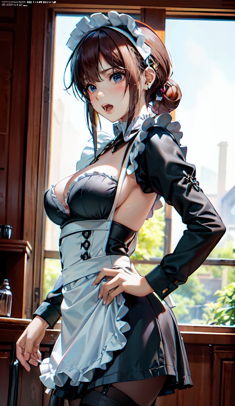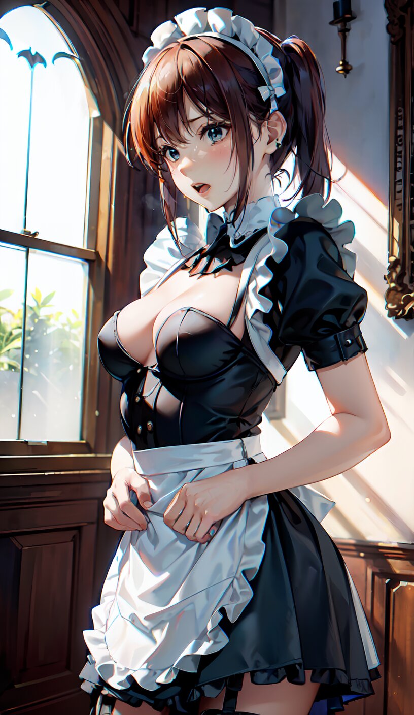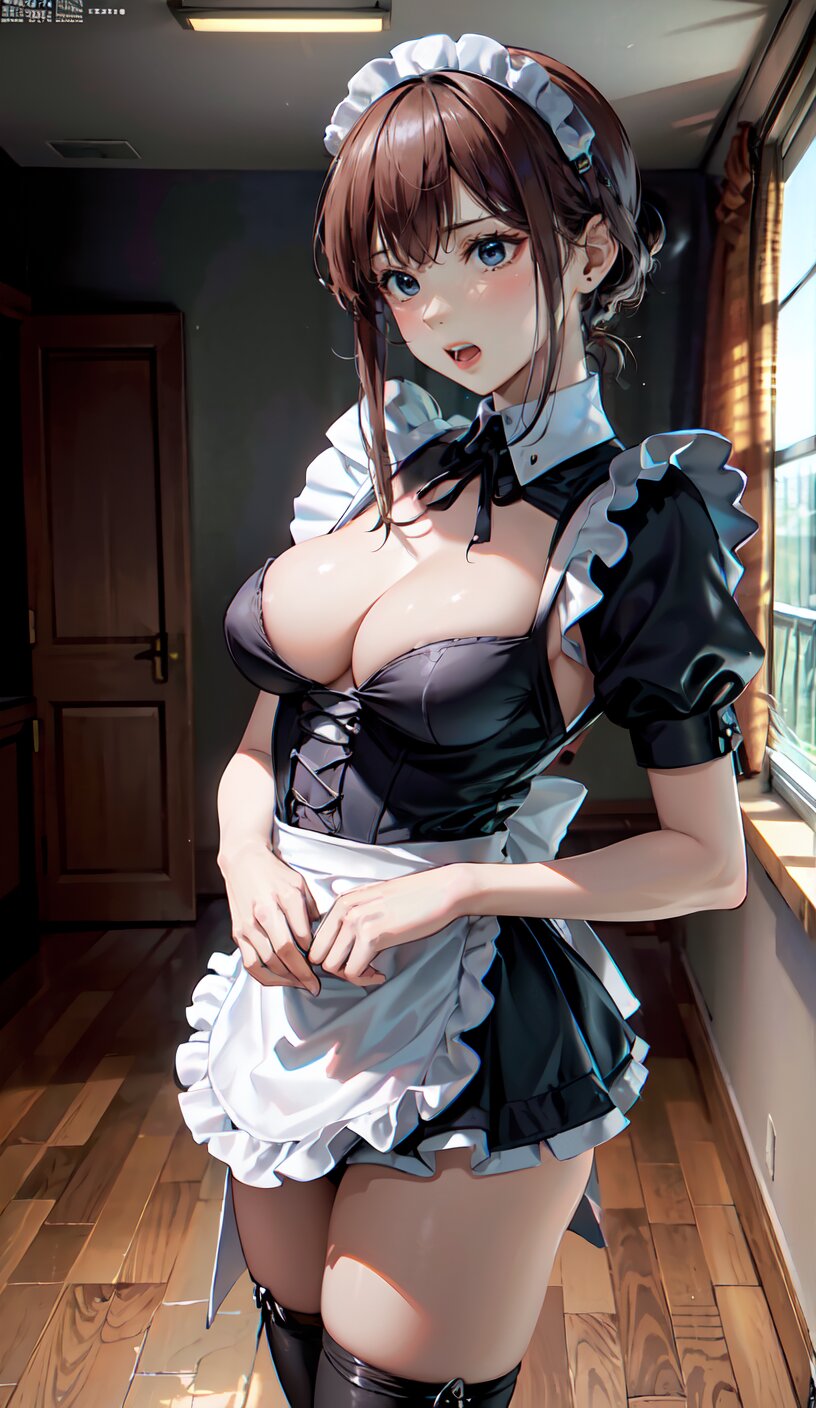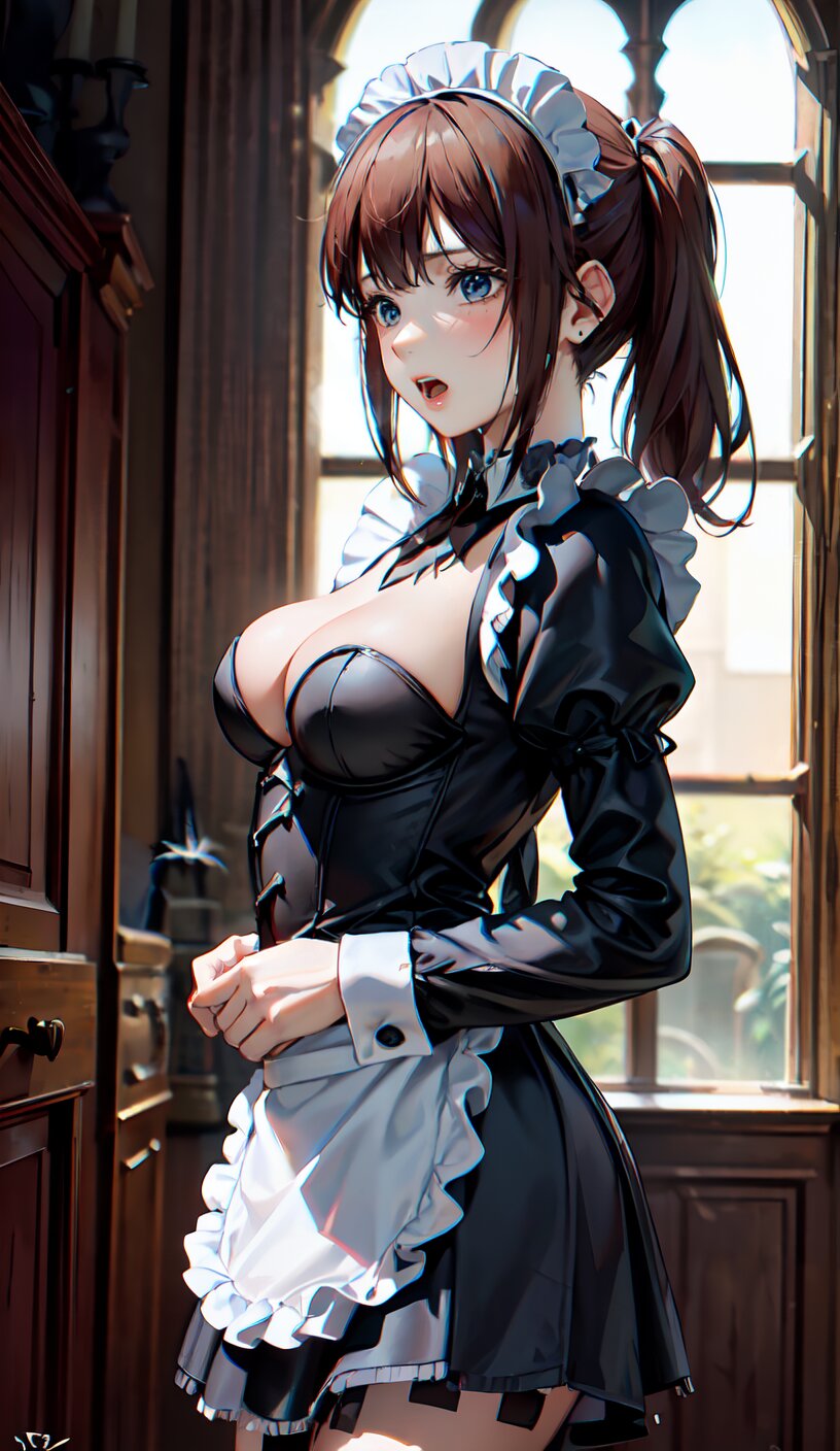 (from front: 1.6), (8k, best quality, masterpiece:1), (realistic, photo-realistic:1.4), HDR, (incredibly absurdres:1.2), 1girl, 20 years old, perfect anatomy, slender, (medium breasts: 1.4), beautiful detailed face, (cowboy shot: 1.6), perfect skin, detailed skin texture, looking aside, (Gothic Maid: 1.6), (standing and posing: 1.6), in the photo studio, <lora:mihi_v01:0.6>