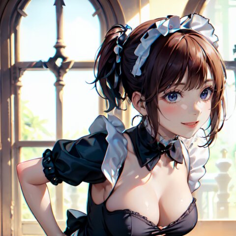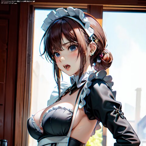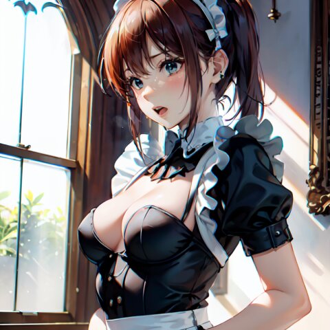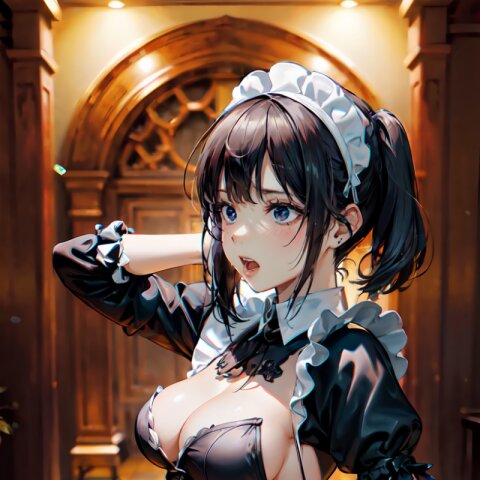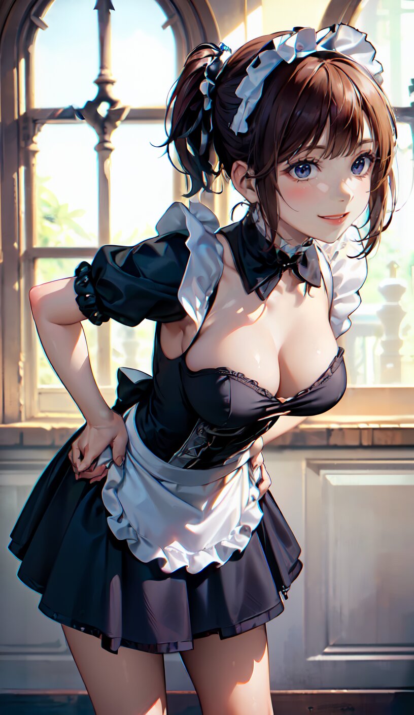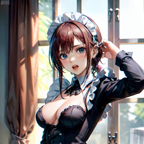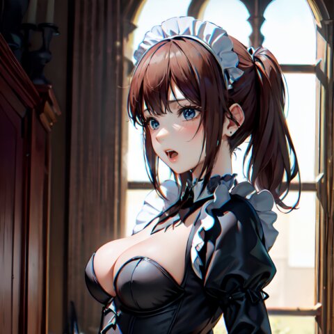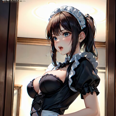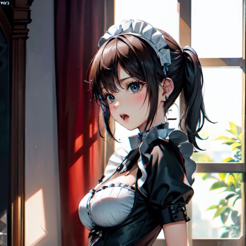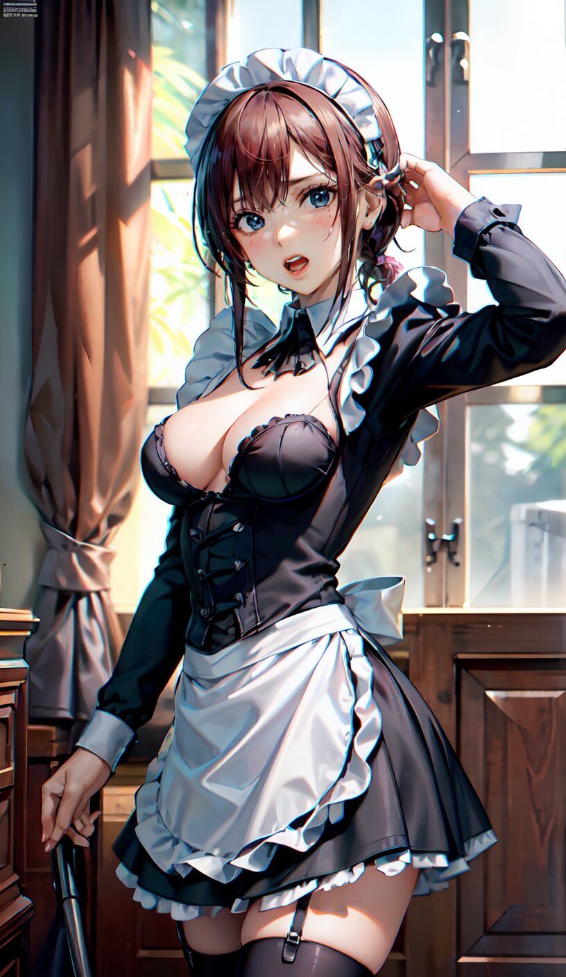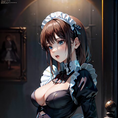 (from front: 1.6), (8k, best quality, masterpiece:1), (realistic, photo-realistic:1.4), HDR, (incredibly absurdres:1.2), 1girl, 20 years old, perfect anatomy, slender, (medium breasts: 1.4), beautiful detailed face, (cowboy shot: 1.6), perfect skin, detailed skin texture, looking aside, (Gothic Maid: 1.6), (standing and posing: 1.6), in the photo studio, <lora:mihi_v01:0.6>