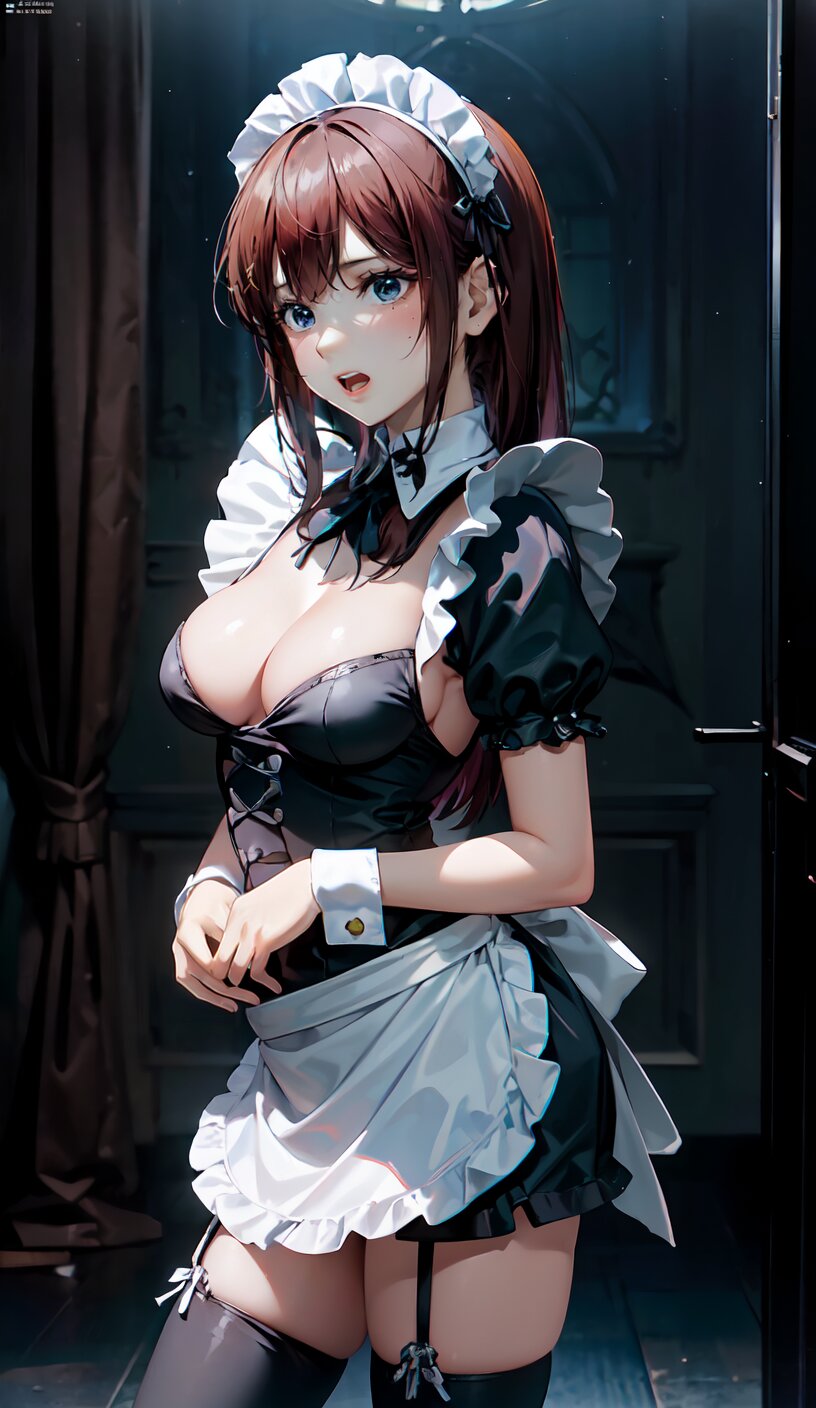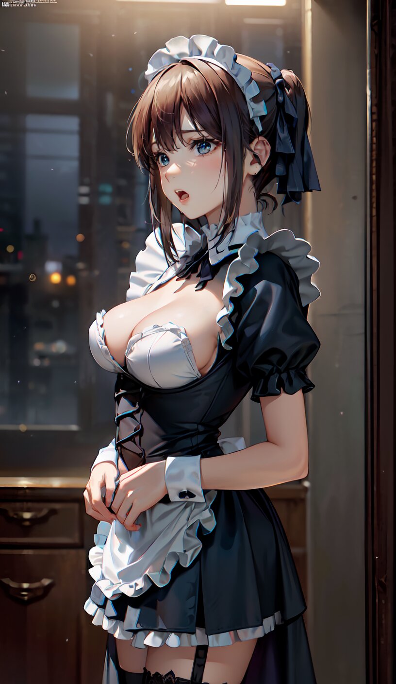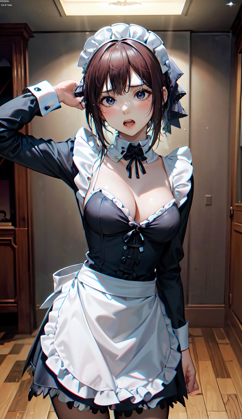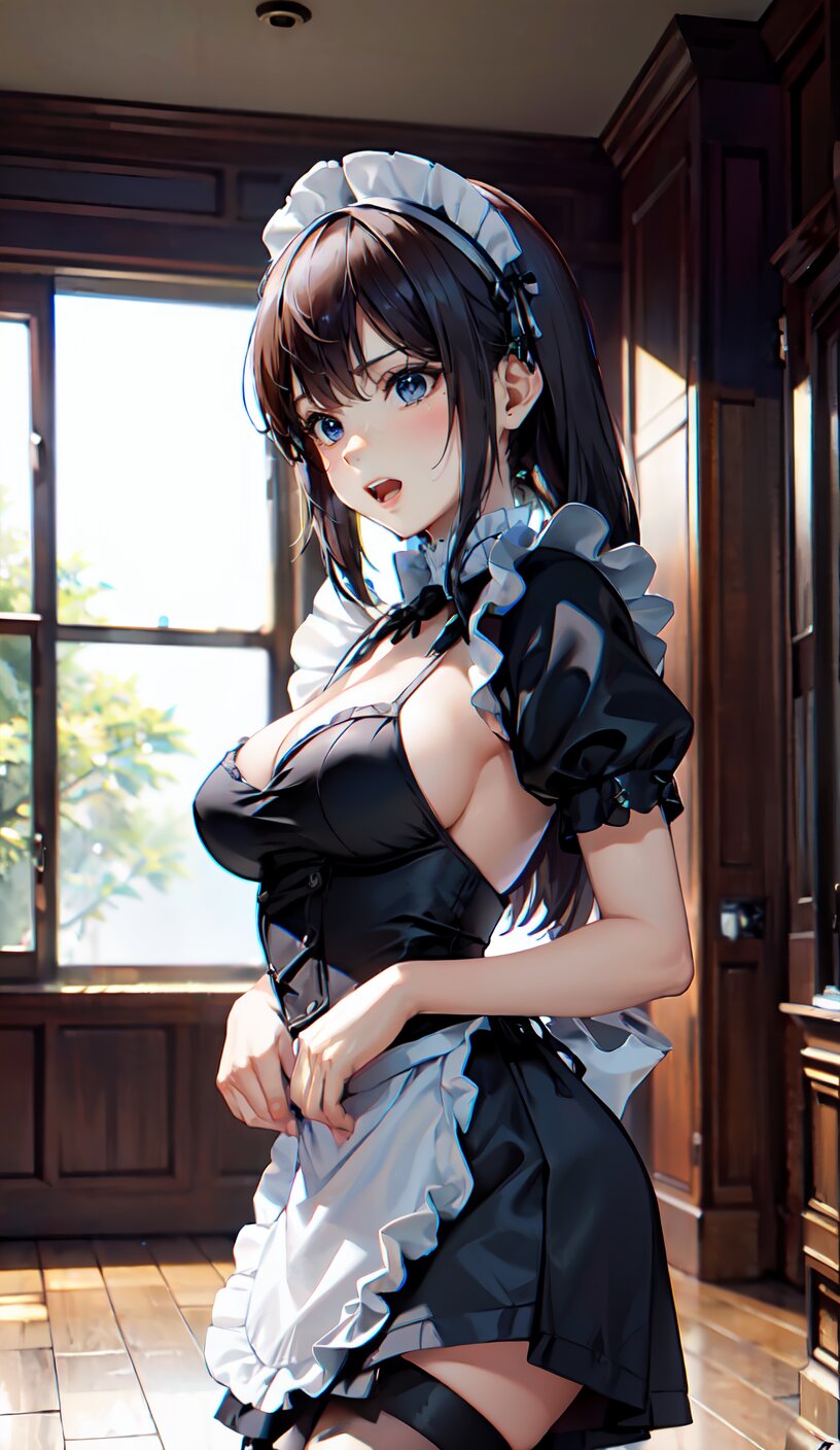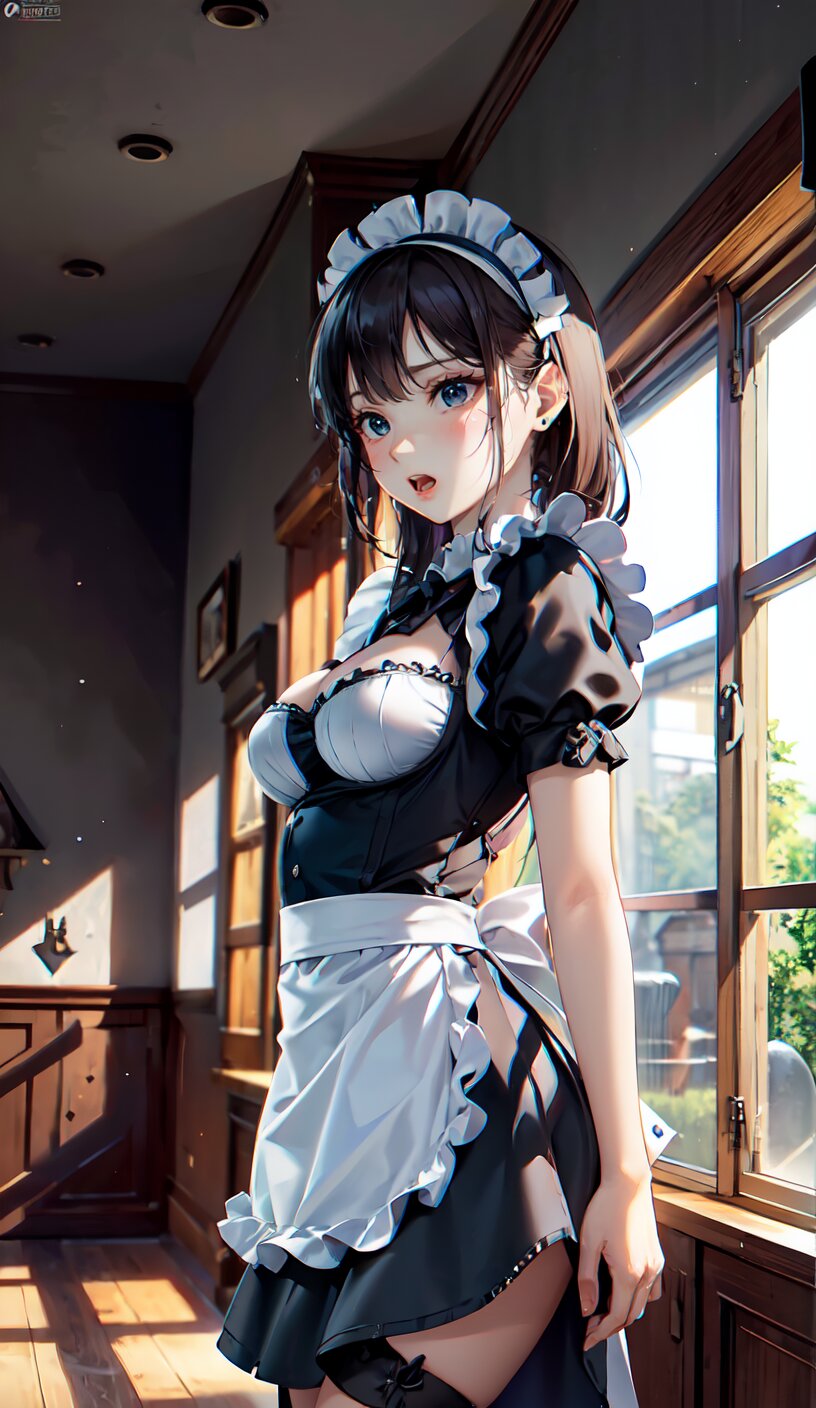 (from front: 1.6), (8k, best quality, masterpiece:1), (realistic, photo-realistic:1.4), HDR, (incredibly absurdres:1.2), 1girl, 20 years old, perfect anatomy, slender, (medium breasts: 1.4), beautiful detailed face, (cowboy shot: 1.6), perfect skin, detailed skin texture, looking aside, (Gothic Maid: 1.6), (standing and posing: 1.6), in the photo studio, <lora:mihi_v01:0.6>