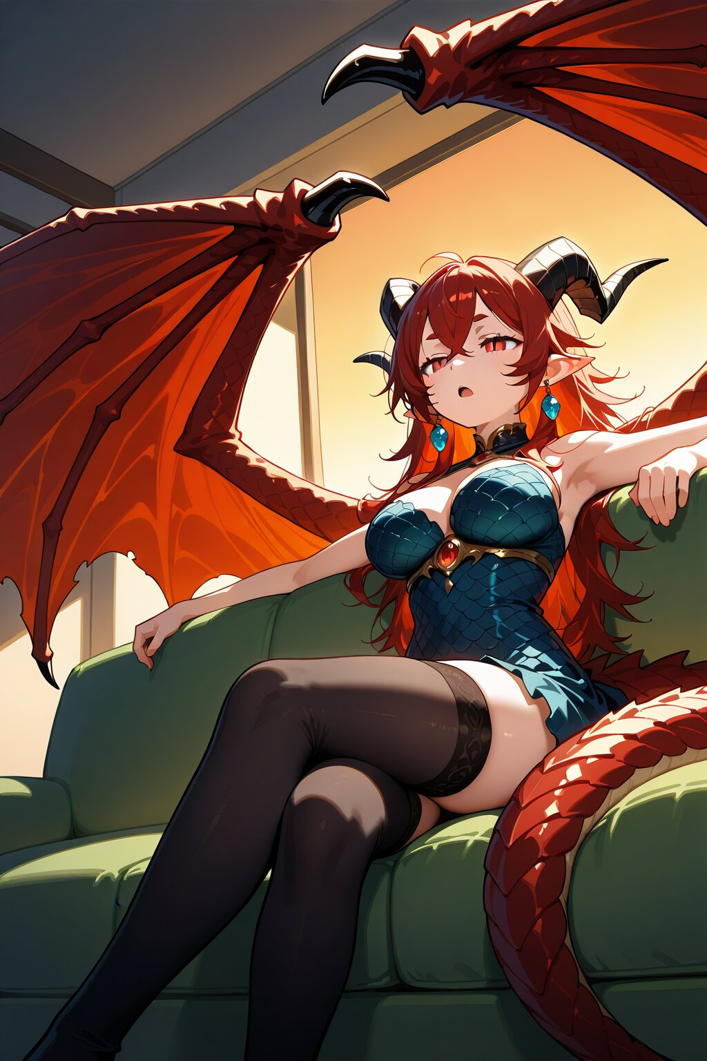 1girl, red eyes, red hair, dark blue mesh hair, Crossed bangs hair between eyes, artistic Messy Side hair, Has some stray hairs, medium long hair, Enchanted jewelry, pointy ears, big gemstone earrings, voluptuous, well endowed, full bust, Healthy and thin, chest Dragon scale, Shoulder Dragon Scales, dragon horns, , red dragon wings, red dragon tail, slit pupils, tareme, Slightly eyebrows, thin eyebrows, bare hand, Horns on the sides of the head, horns that extend backwards, horns with a wooden texture, gnarled horns, sofa, room, girl focus, thighhighs, "relaxed pose, Put arms on sofa, put elbows on sofa, put elbows on sofa, sitting, , , look up, spread arms, hands down, dynamic angle, Lean against the backrest, " half closed eyes, wide open mouth, orange light, evening,