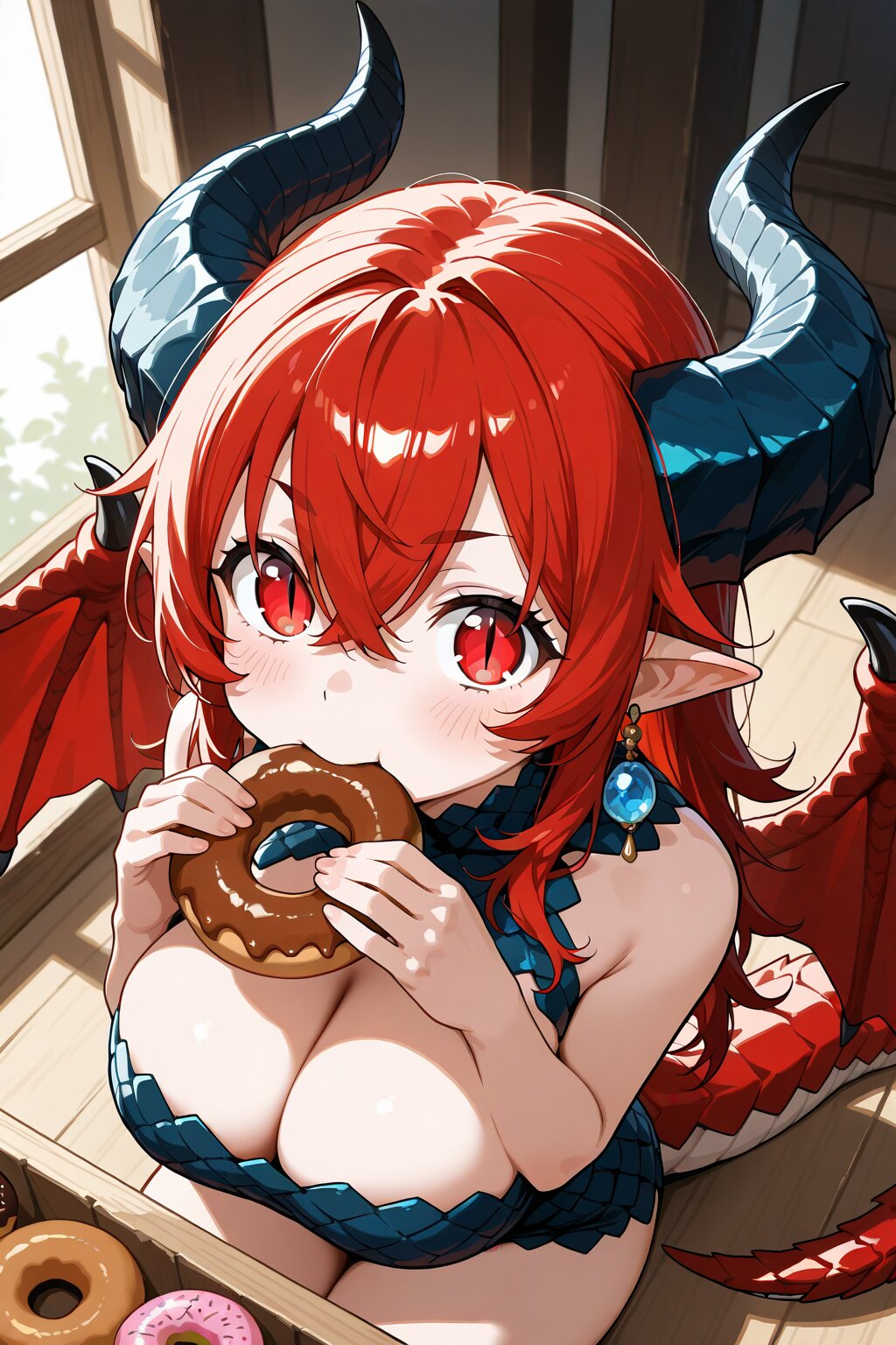 1girl, red eyes, red hair, dark blue mesh hair, Crossed bangs hair between eyes, artistic Messy Side hair, Has some stray hairs, medium long hair, Enchanted jewelry, pointy ears, big gemstone earrings, voluptuous, well endowed, full bust, Healthy and thin, chest Dragon scale, Shoulder Dragon Scales, dragon horns, , red dragon wings, red dragon tail, slit pupils, tareme, Slightly eyebrows, thin eyebrows, bare hand, Horns on the sides of the head, horns that extend backwards, horns with a wooden texture, gnarled horns, indoors, from above, doughnut, eating, food, sitting, , , holding food, looking at viewer, blush, noon,