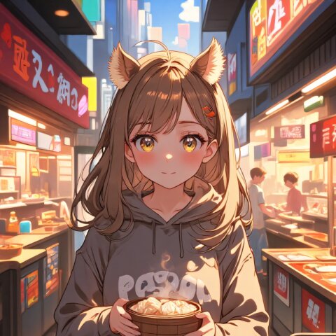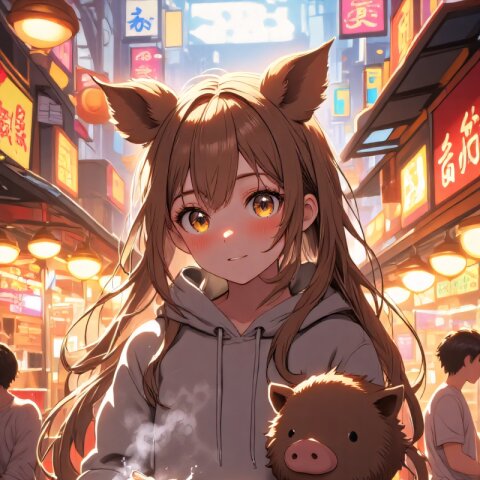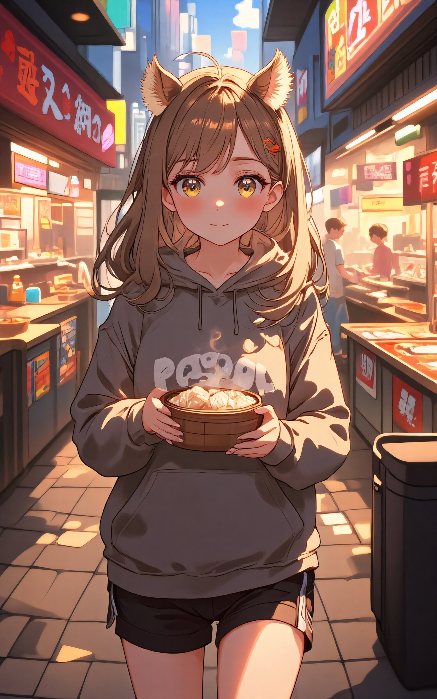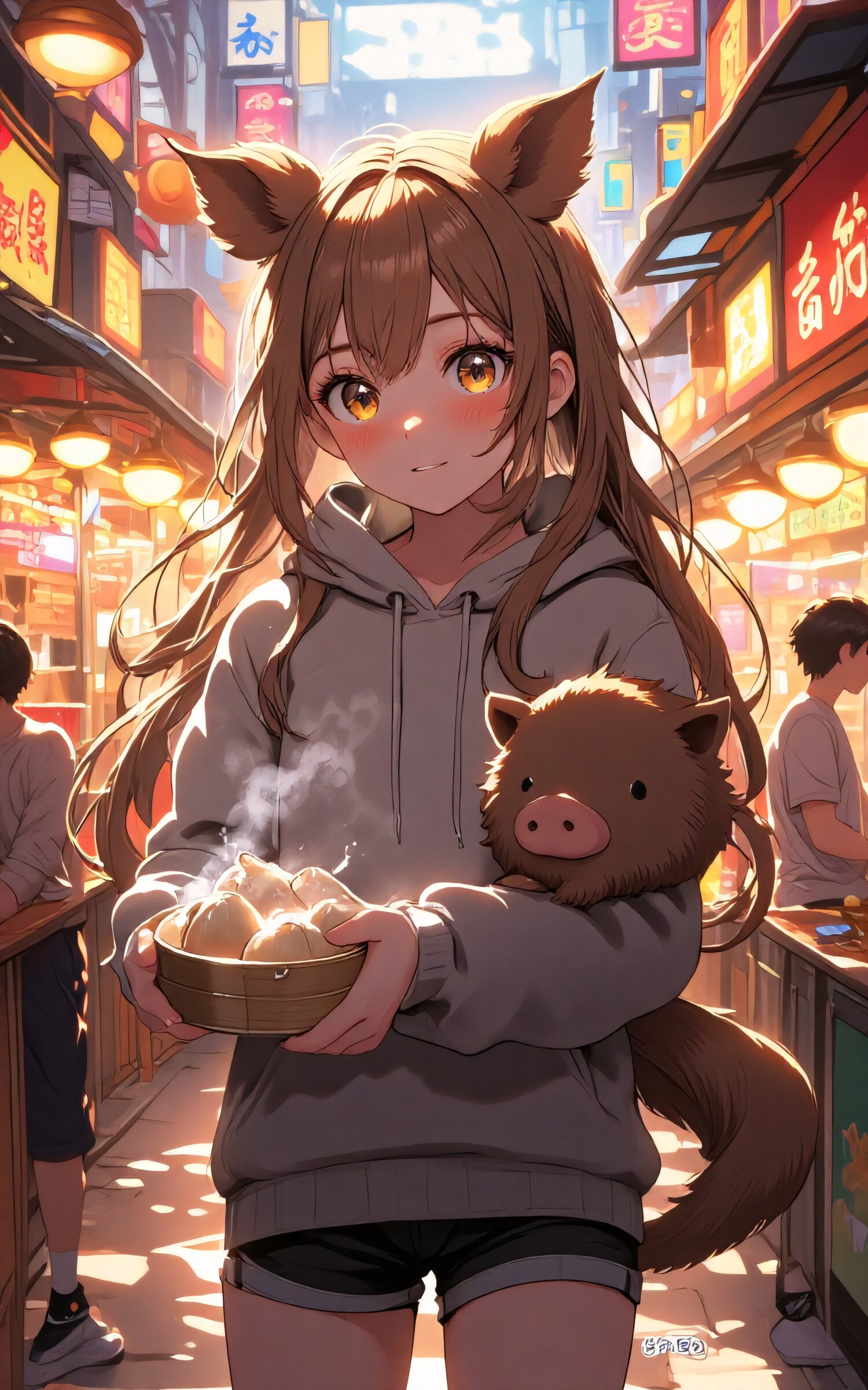 anime style, full-body, boar-eared girl, long light brown hair flowing gently, deep expressive eyes with double eyelids and long delicate eyelashes, cheerful smile, wearing a casual outfit with a hoodie and shorts, holding a steaming basket of xiaolongbao dumplings, little boar, standing in a lively food court with colorful signs and bustling stalls, warm ambient lighting enhancing the cozy and joyful atmosphere, cinematic composition, visually captivating aesthetic