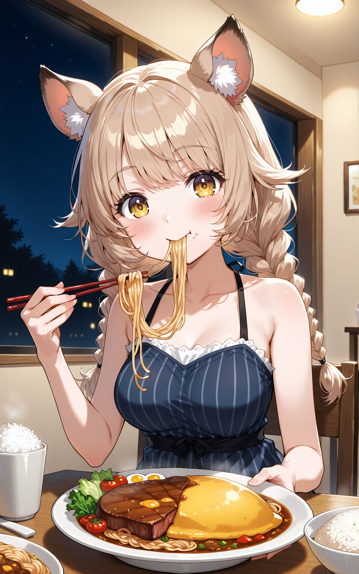 1girl, animal ear fluff, animal ears, bangs, bare arms, bare shoulders, blush, bowl, braid, breasts, light brown hair, cheese, , collarbone, cup, curry, dress, eating, egg, eyebrows visible through hair, food, , , holding chopsticks, , holding plate, long hair, looking at viewer, meat, Wild Boar ears, noodles, omelet, omurice, pancake, pasta, plate, , ramen, rice, salad, sleeveless, sleeveless dress, smile, solo, soup, spaghetti, , steak, striped, table, tomato, twin braids, vertical stripes, night,