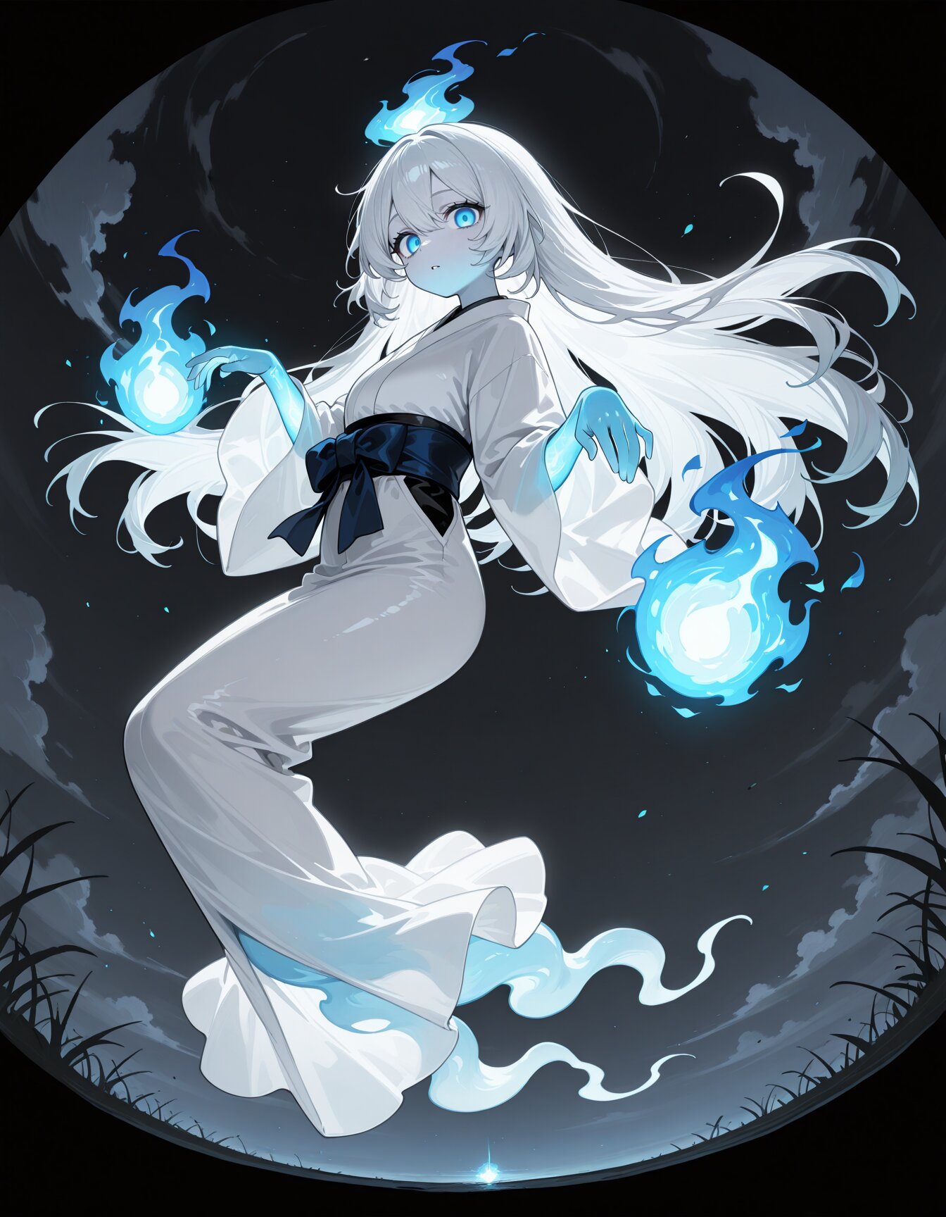 super fine concept art, hard surface, 8K, masterpiece, best quality, amazing quality, very aesthetic, absurdres, from side, looking at viewer, (fisheye,fisheye lens angle:1.0), (from below:1.2) looking at viewer, (dutch angle:1.2), nihonga, sumi-e, faux traditional media, calligraphy (medium), color ink \(medium\), painting \(medium\), sidelighting, ghost girl, white hair, long hair, light blue eyes, pale blue skin, white japanese clothes, white long skirt, ghost pose, at midnight, see-through body, glowing, empty eyes, ink wash painting, midair, ghost tail , cast a magic, blue fire, dark sky, glowing magic potion, professional art lots of details, , overexposure, sumi-e effect style, <lora:noline (1):-0.5> <lora:sdxl2-flat2-512b:0.0> <lora:facelightup_xl_v10:0.5>
