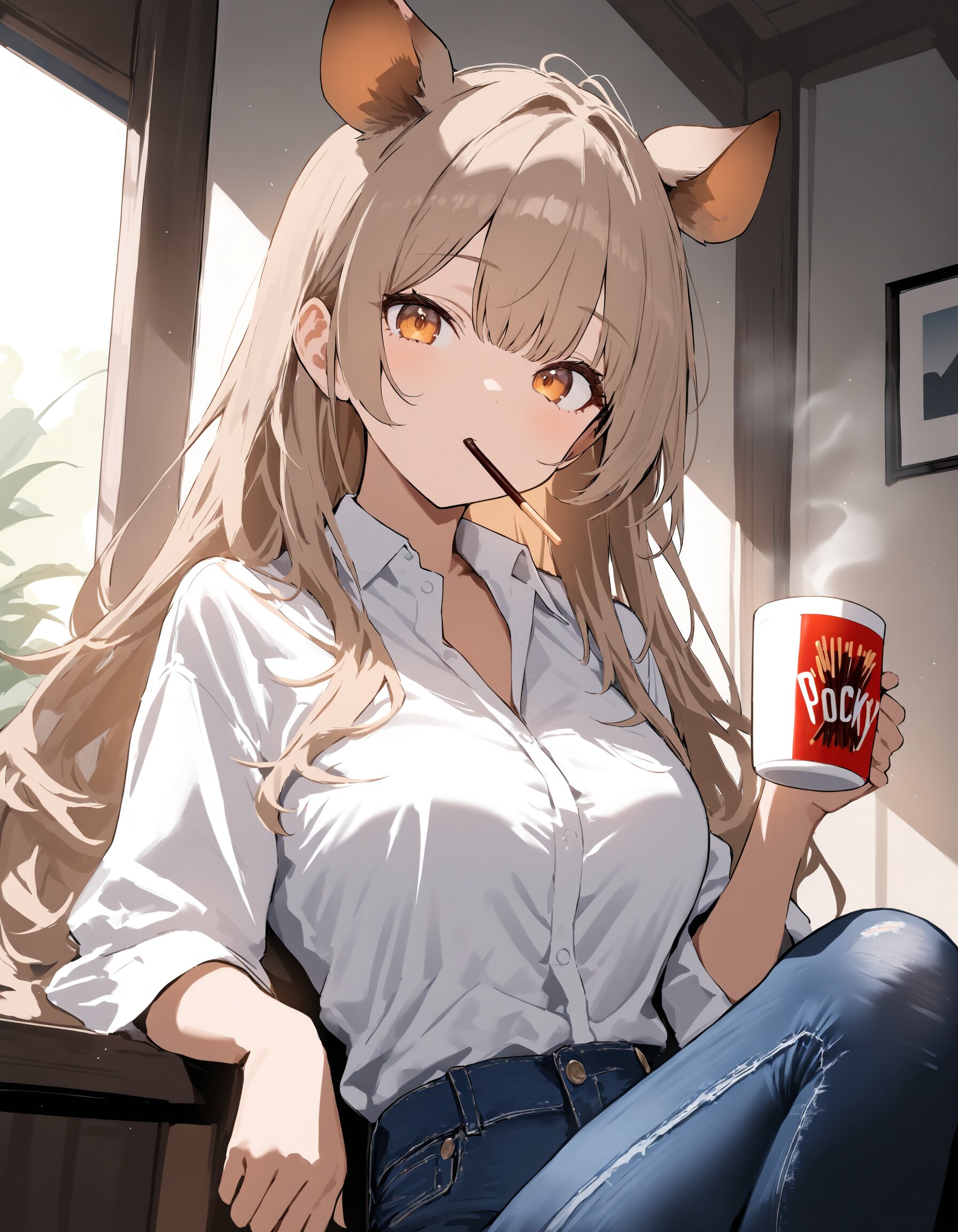 indoor, 1girl, solo, light brown hair, long hair, amber eyes, wild boar's ears, collared shirt, white shirt, jeans, pocky, holding cup, coffee mug, looking at viewer, masterpiece, great score, high score, absurdres