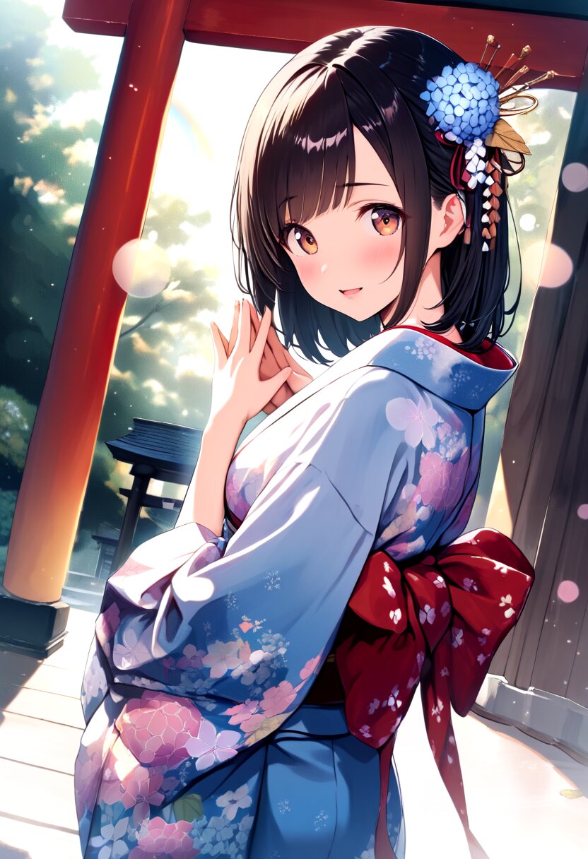 1girl, petite, cute, dark black hair, medium hair, straight hair, right diagonal bangs, head tilt, kanzashi, tareme:1.4, beautiful brown eyes, looking back, beautiful lips, pink lips, glossy lips, half open mouth, embarrassed smile, blush, summer kimono with hydrangea print, medium breasts, standing, red oil-paper umbrella, from behind, dynamic angle, sun, rain, rainbow, shrine, single torii, bokeh:1.4, Dreamy Blur, light particles,