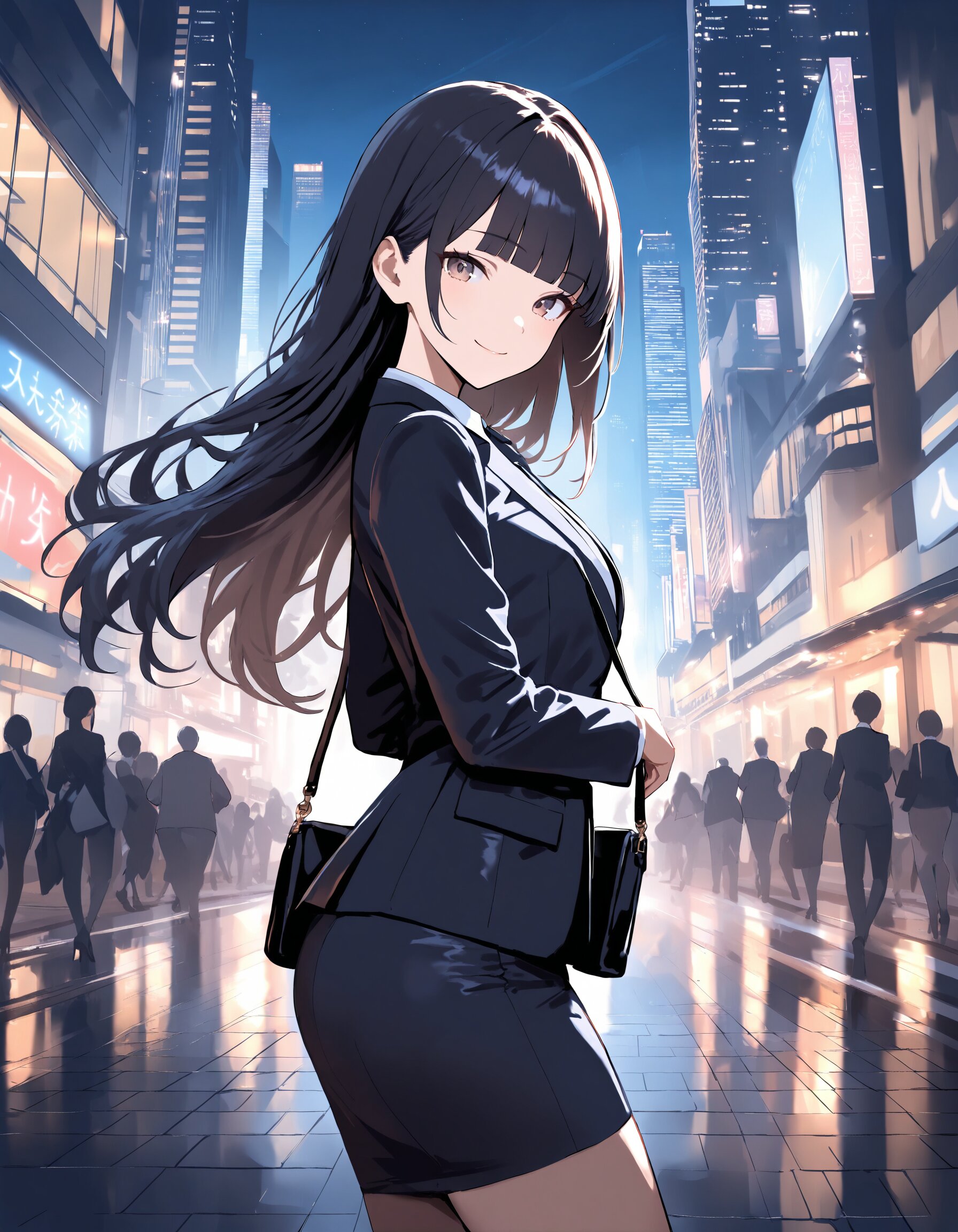 night, skyscraper, city, cityscape, street, avenue, pavement, crowd, 1girl, solo, 1 lady, black hair, long hair, (blunt bangs), smile, office lady, handbag, looking at viewer, masterpiece, great score, high score, absurdres
